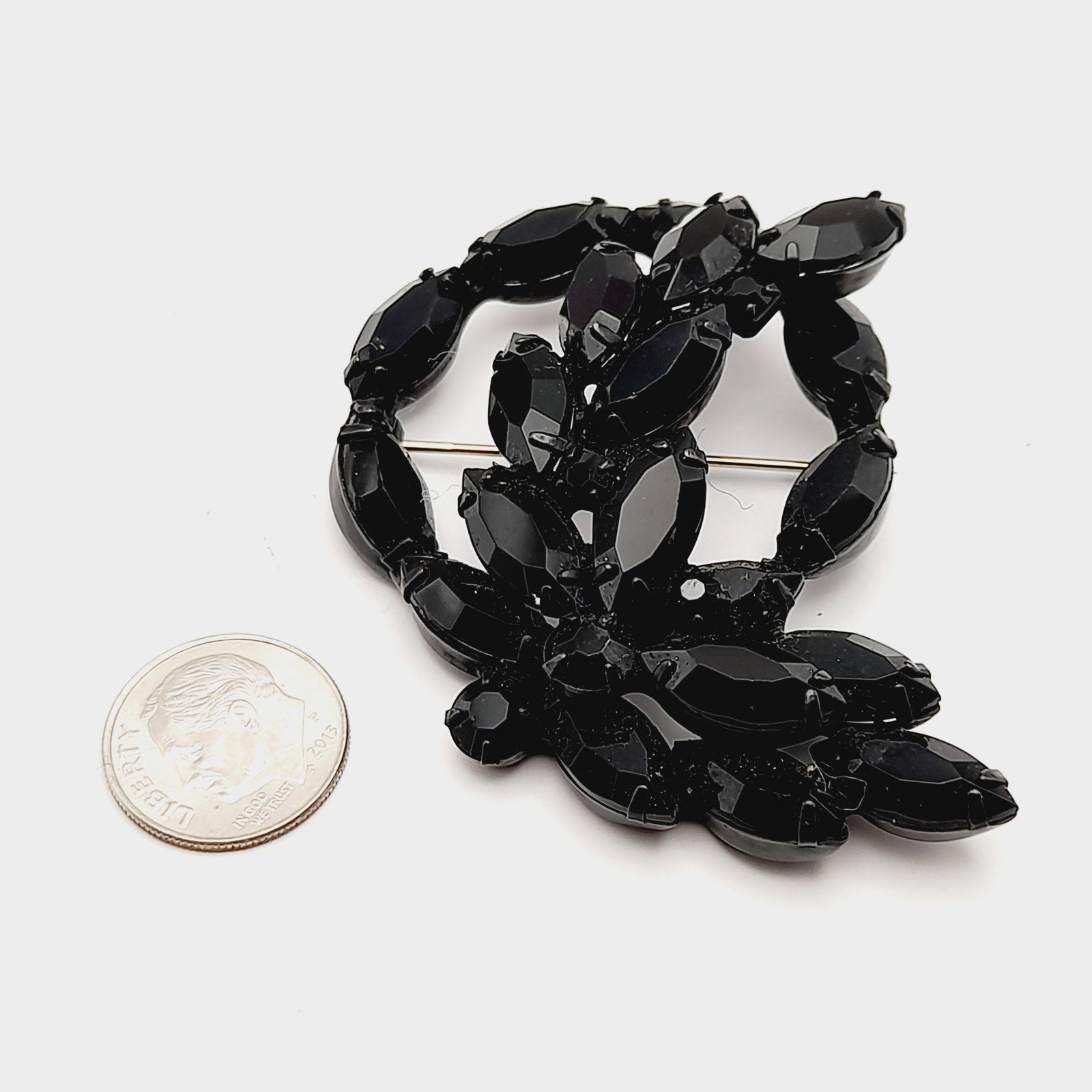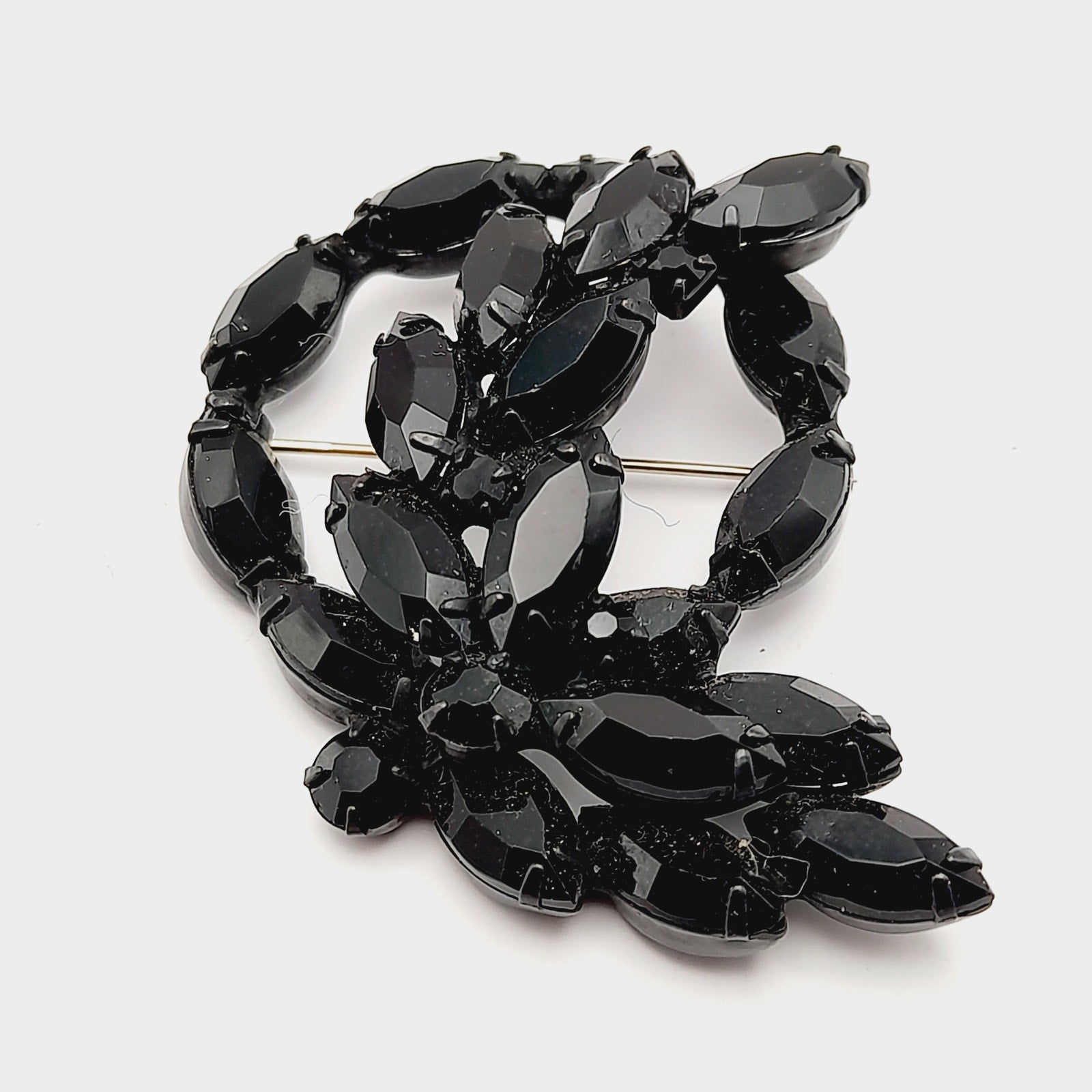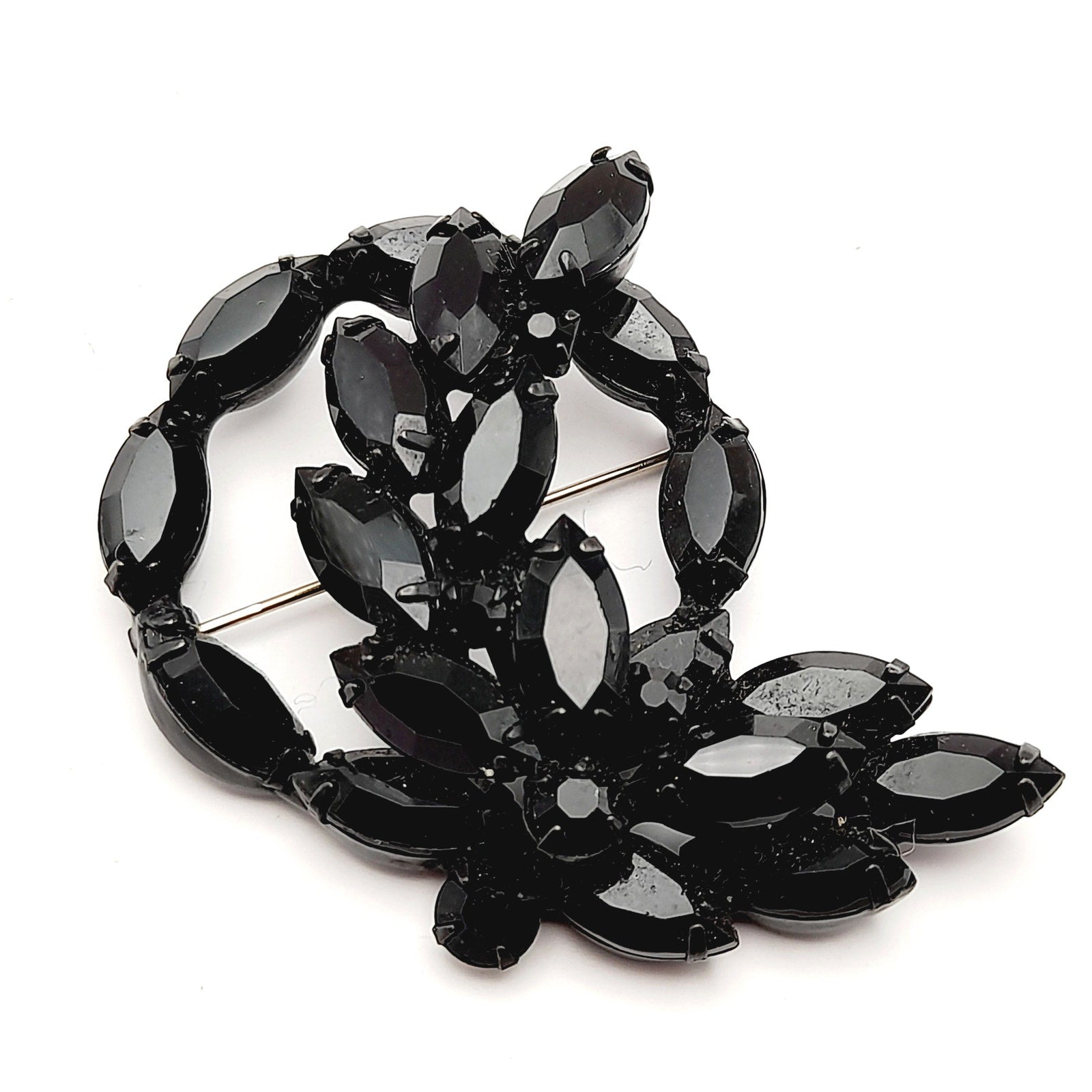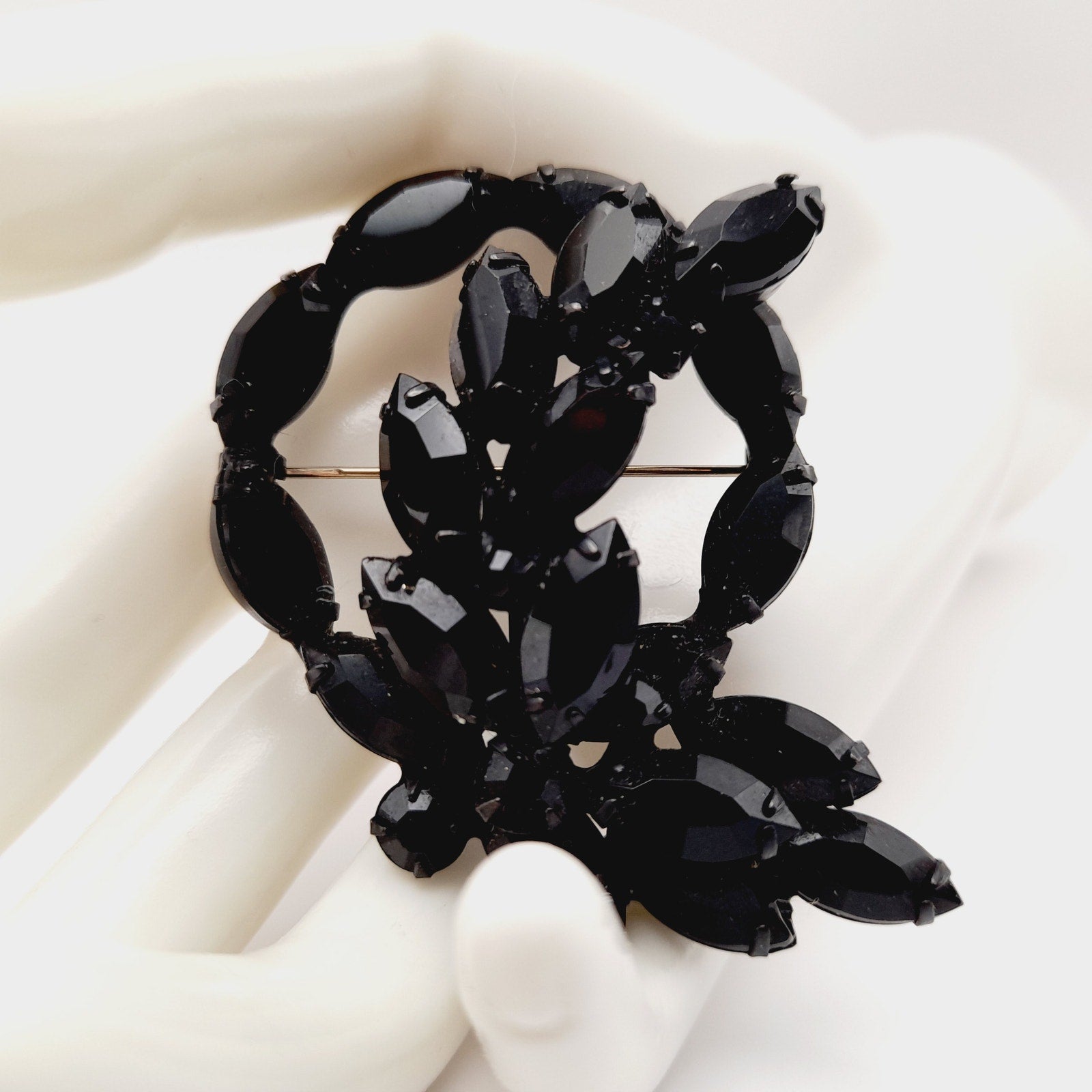 Add a touch of vintage elegance to your collection with this stunning 1960s black rhinestone brooch. The intricate wreath floral design is sure to catch the eye and elevate any outfit.