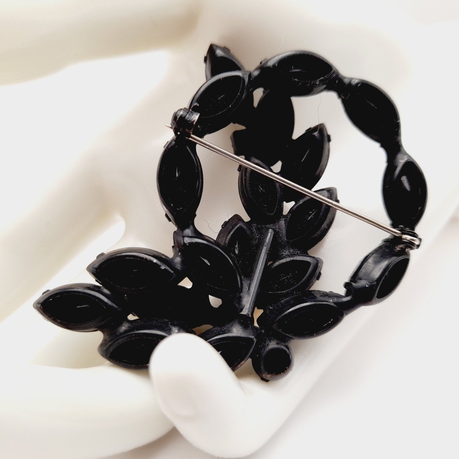 Vintage Black Rhinestone Wreath Floral 1960s Brooch, Japanned Black Enamel