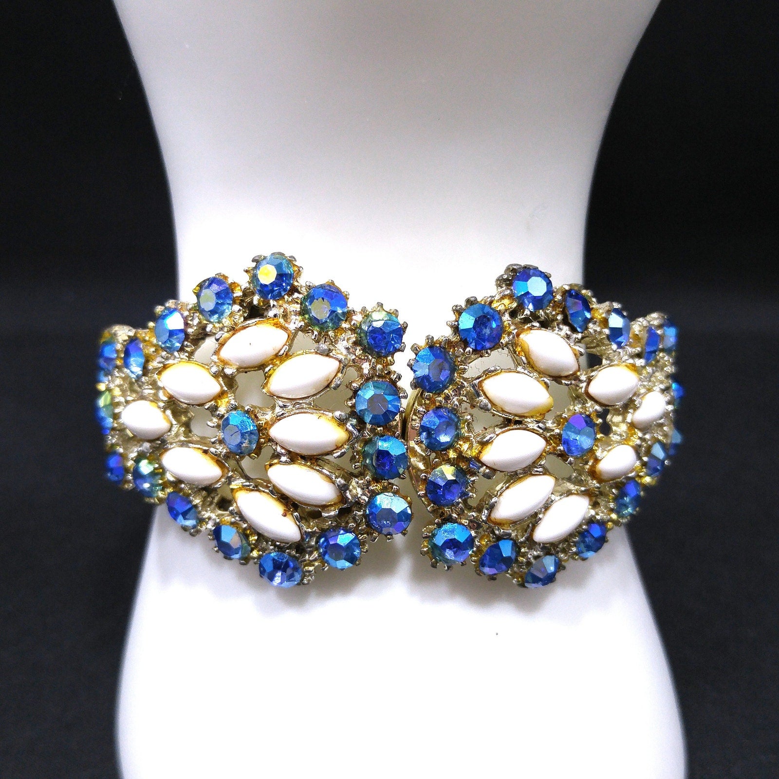 This vintage clamper bracelet from the 1960s features a striking mix of blue aurora borealis rhinestones and marquise-shaped white milk glass cabochons. Set in a silver tone hinged clamper design, the bracelet sparkles beautifully from every angle.