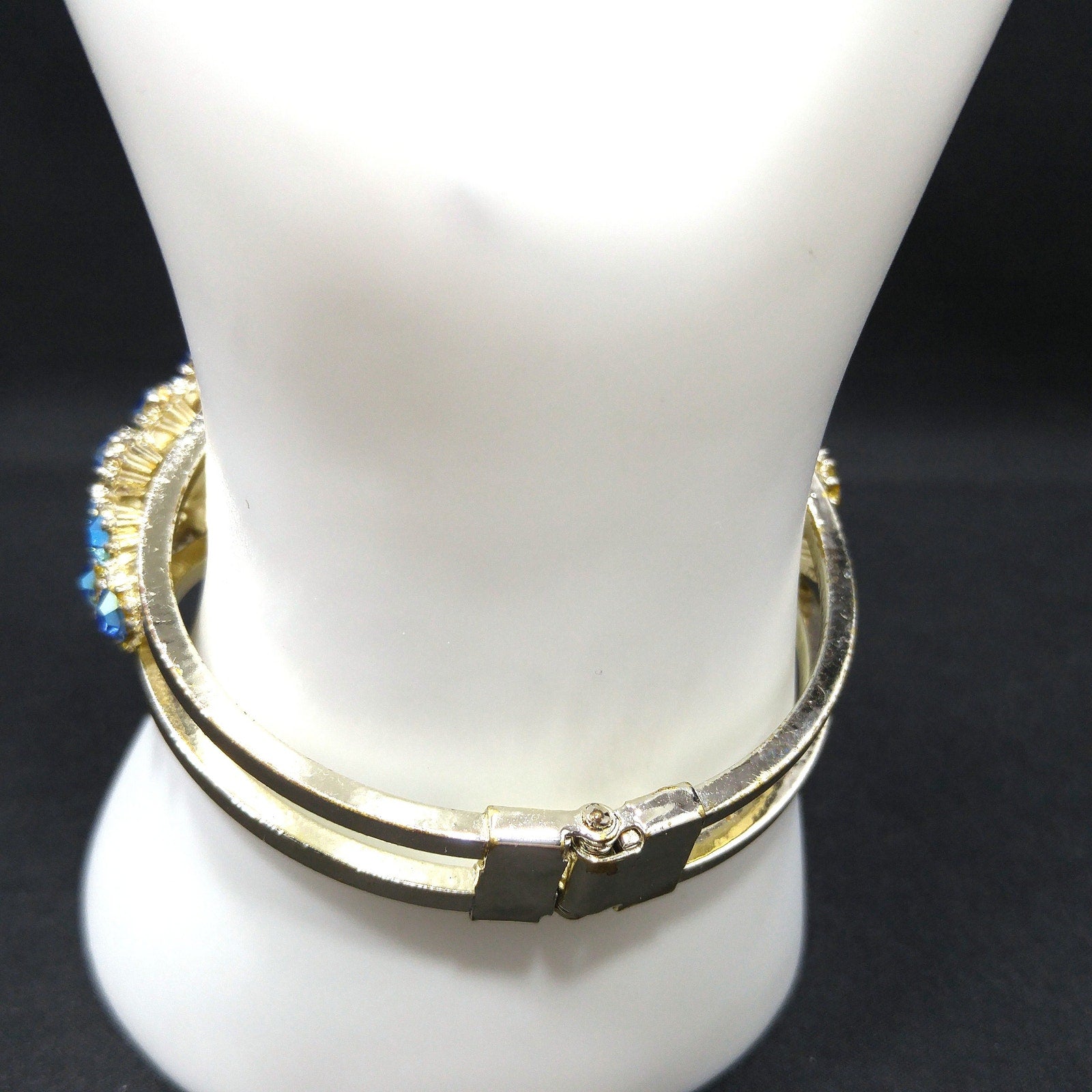 Vintage Blue Aurora Borealis Rhinestone Milk Glass Clamper Bracelet 1960s