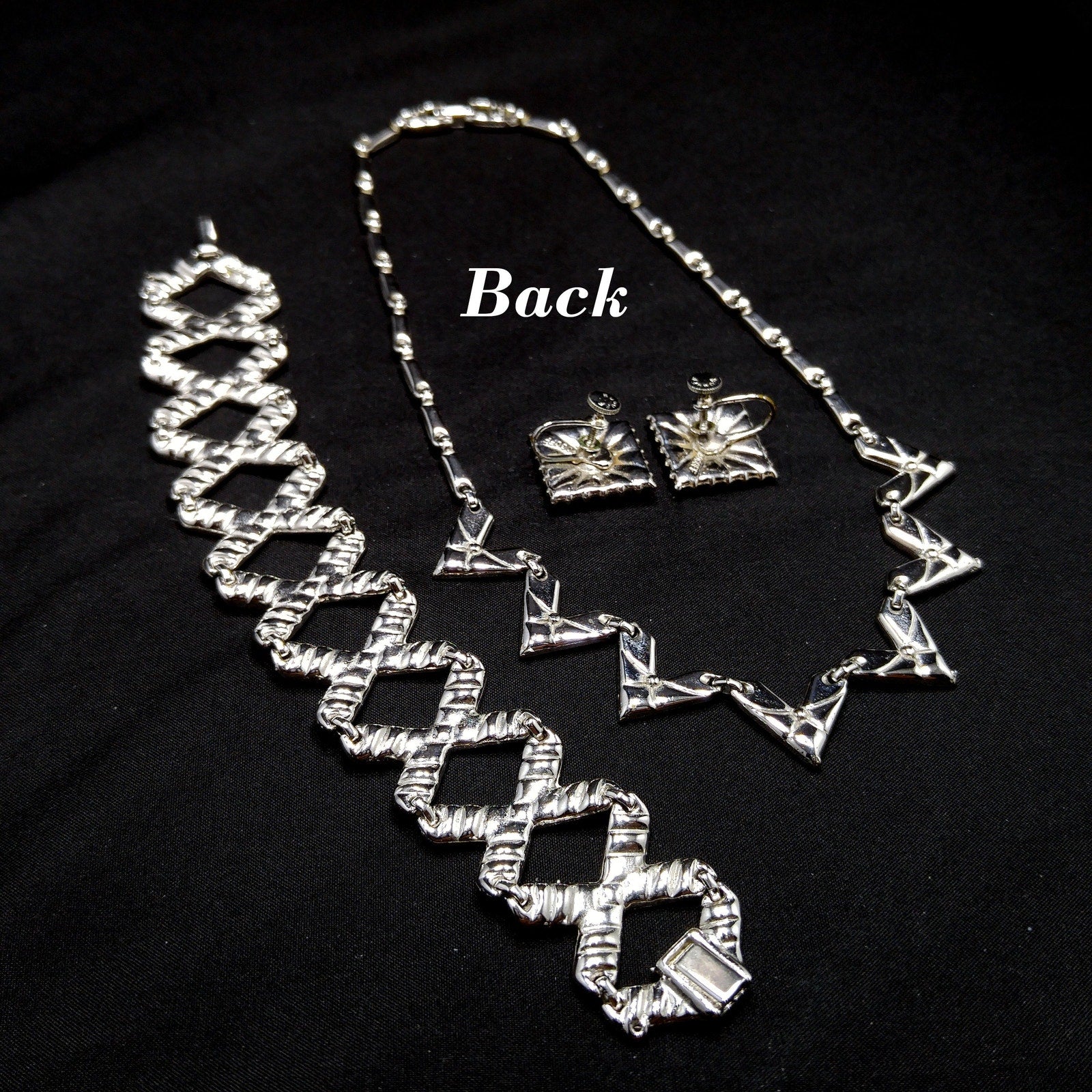 The necklace and bracelet are beautifully articulated for fluid movement and sparkle from every angle, while the matching square rhinestone earrings complete the coordinated look. This set would be perfect for a bridal ensemble, evening wear, or vintage collector’s display.