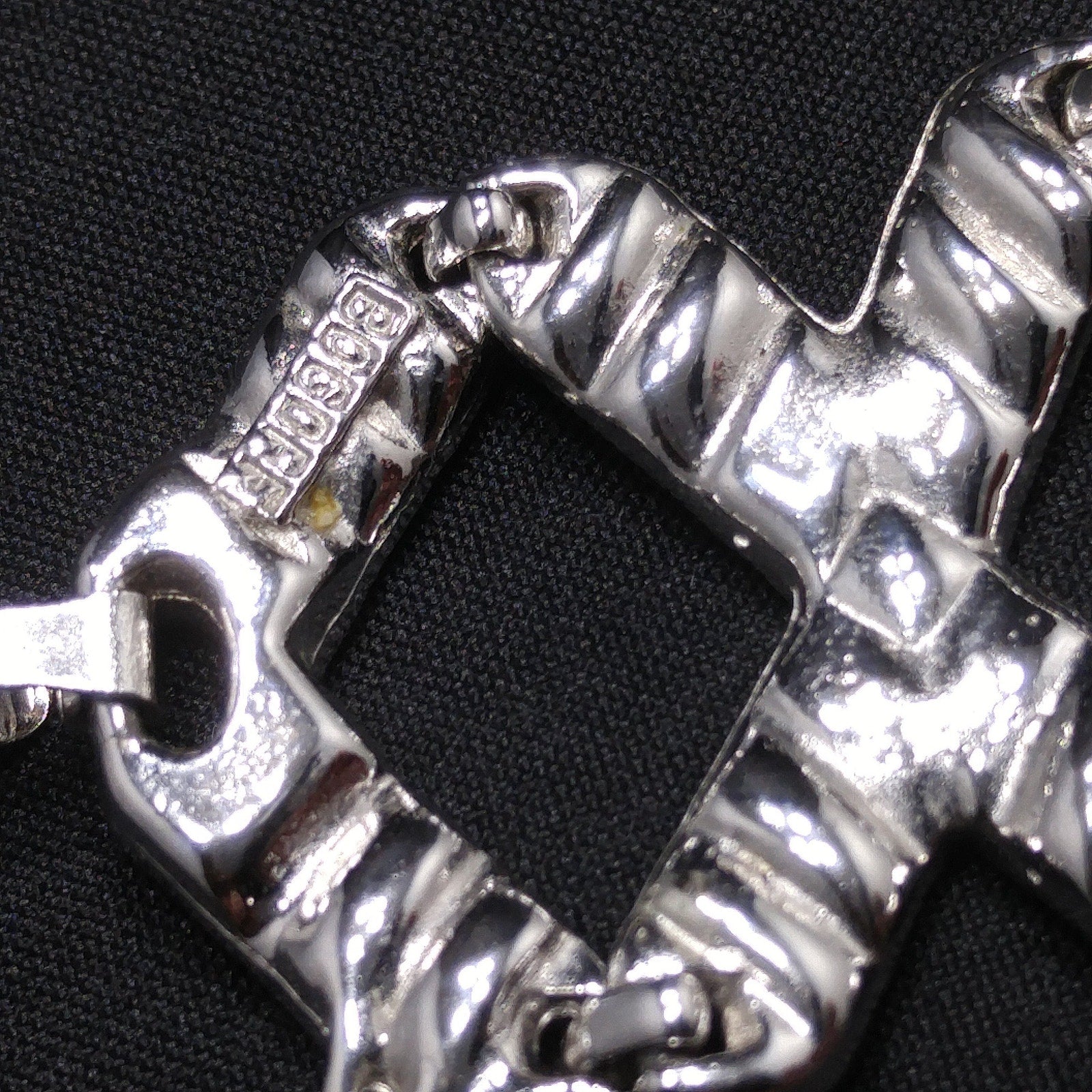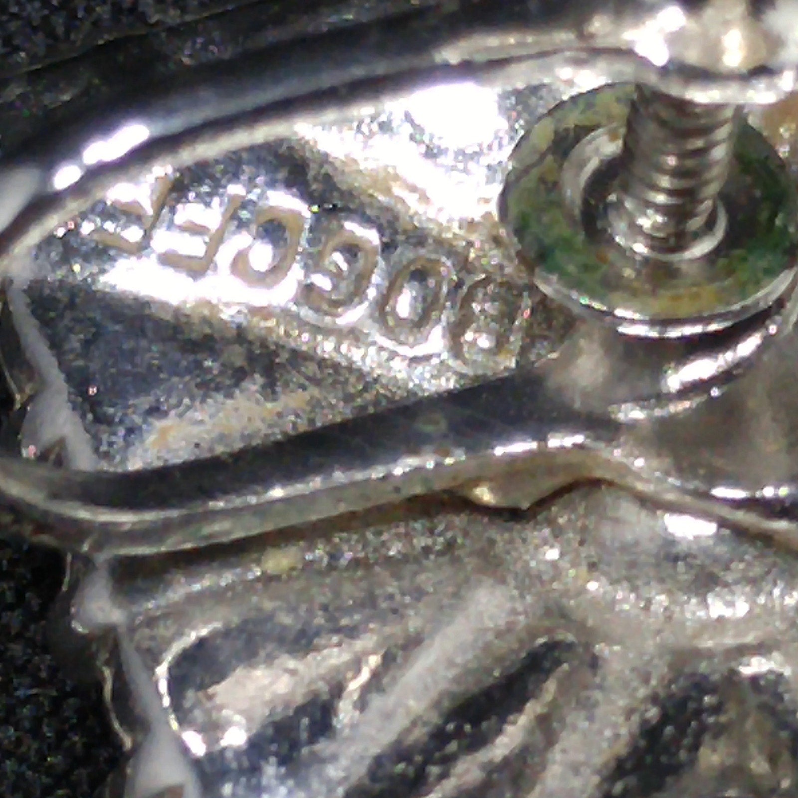 This is a stunning Bogoff vintage clear rhinestone jewelry set (necklace, bracelet, and screw-back earrings) from the late 1940s to 1950s. Each piece features brilliant clear rhinestones set in rhodium-plated silver-tone metal, arranged in an elegant geometric zigzag and square motif — a hallmark of Bogoff’s glamorous mid-century designs.