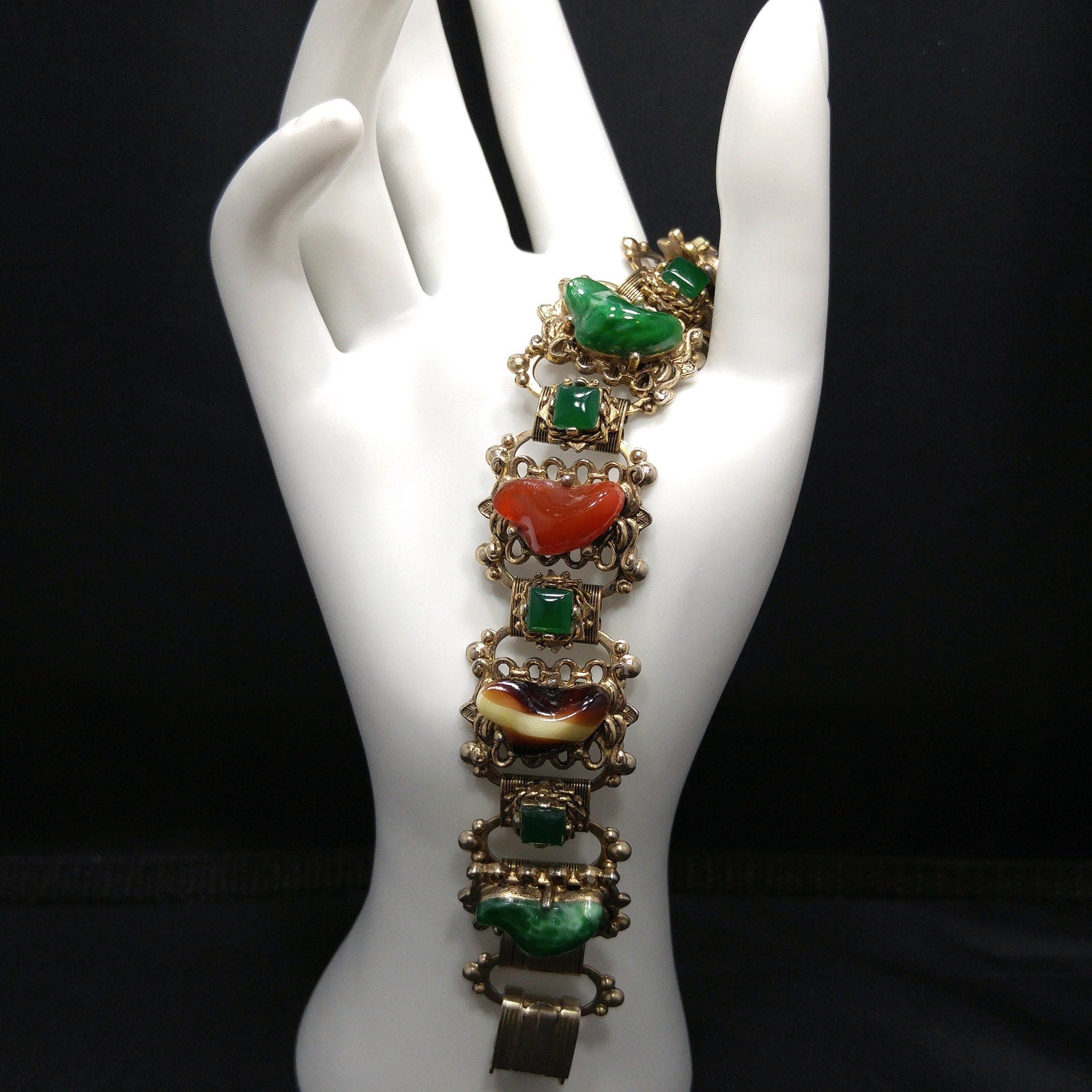 *Description: This is a beautiful book chain bracelet with faux stones in art glass on ten links, both large and small molded glass, from the 1950s to 1960s. One of the unique features is the book chain technique of attaching each link to the next in a book chain fashion. Each larger glass link is divided by a smaller glass link so that they are ten links with glass stones. The glass stones are in green, orange red, and brown and white glass. It is a great vintage bracelet and would be a great addition to your vintage jewelry collection or make a great vintage gift!