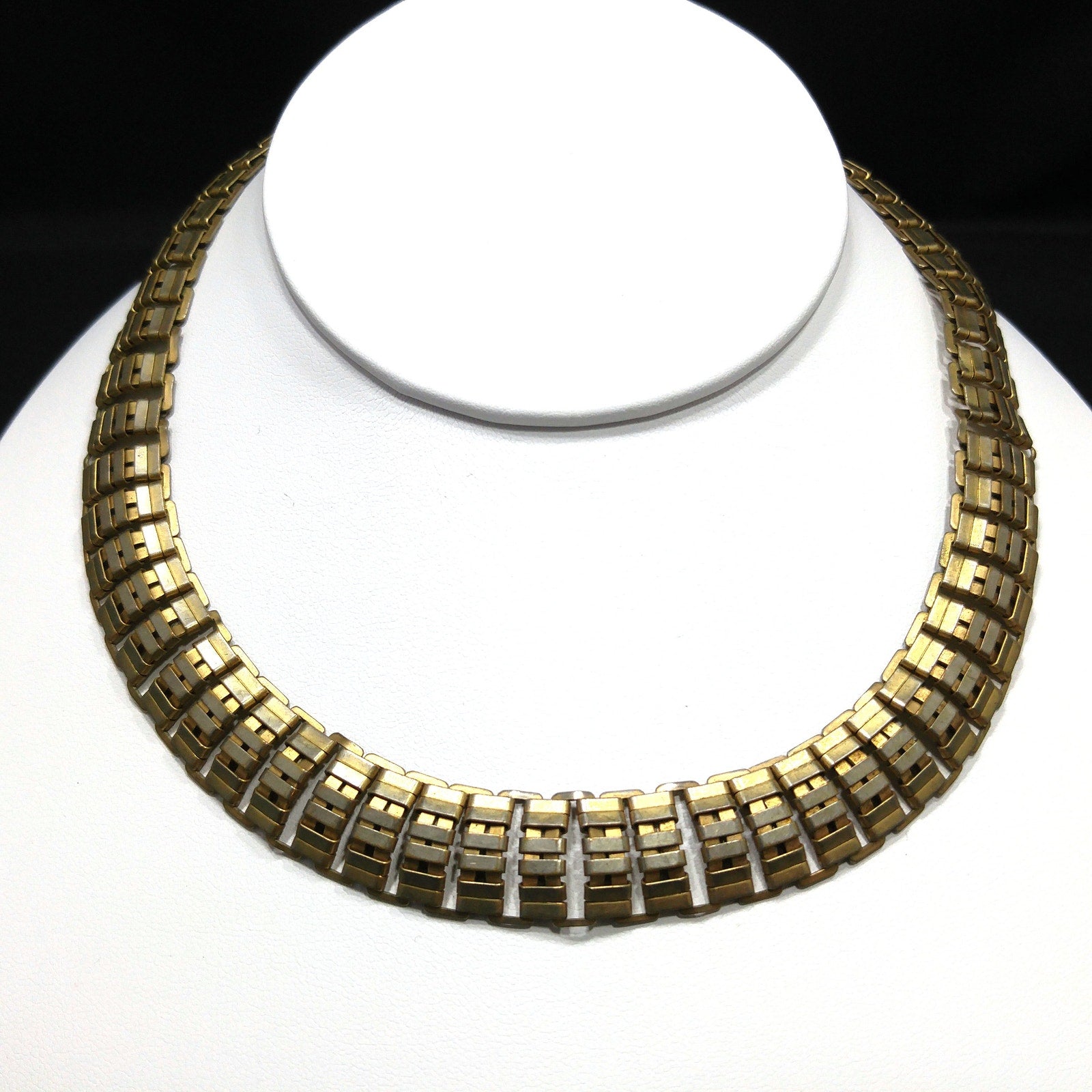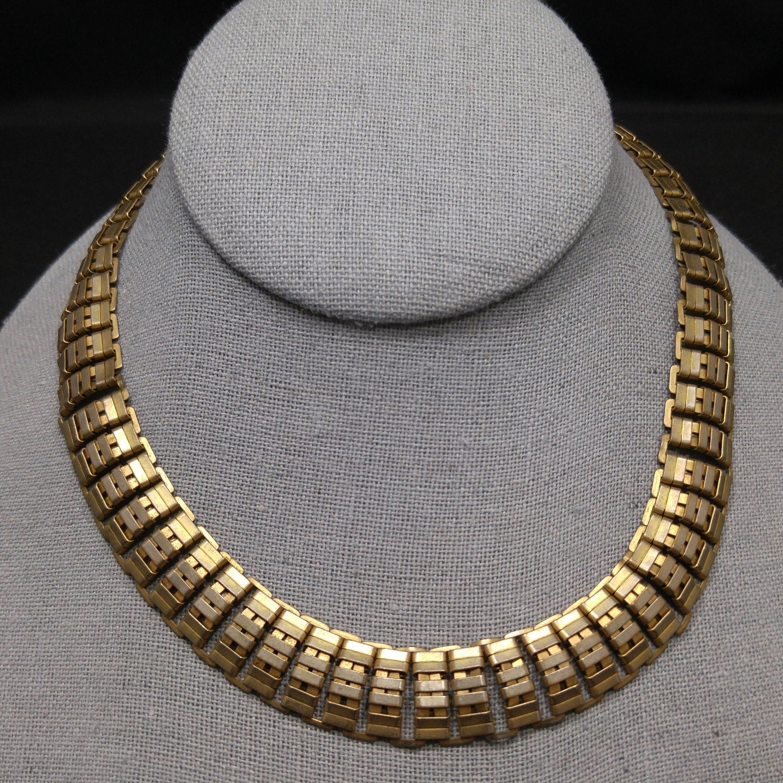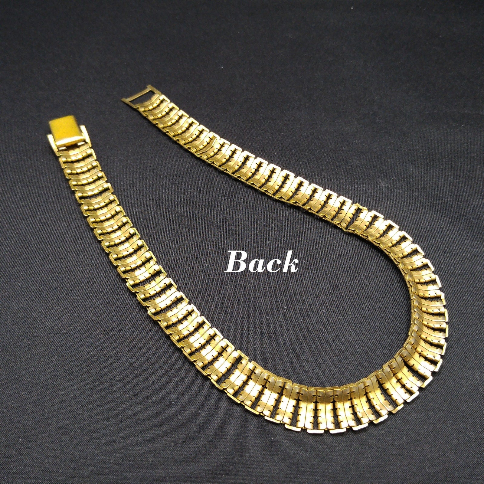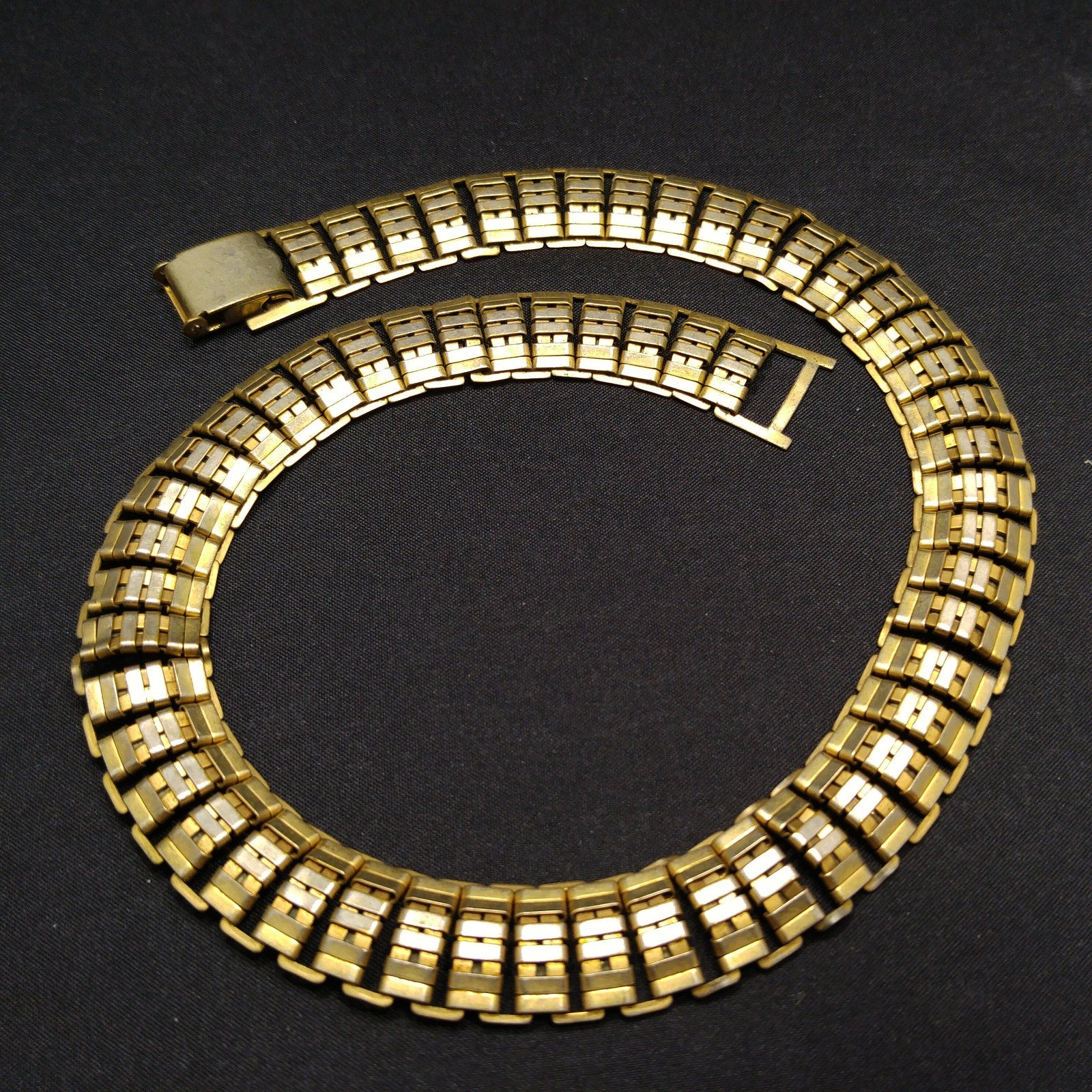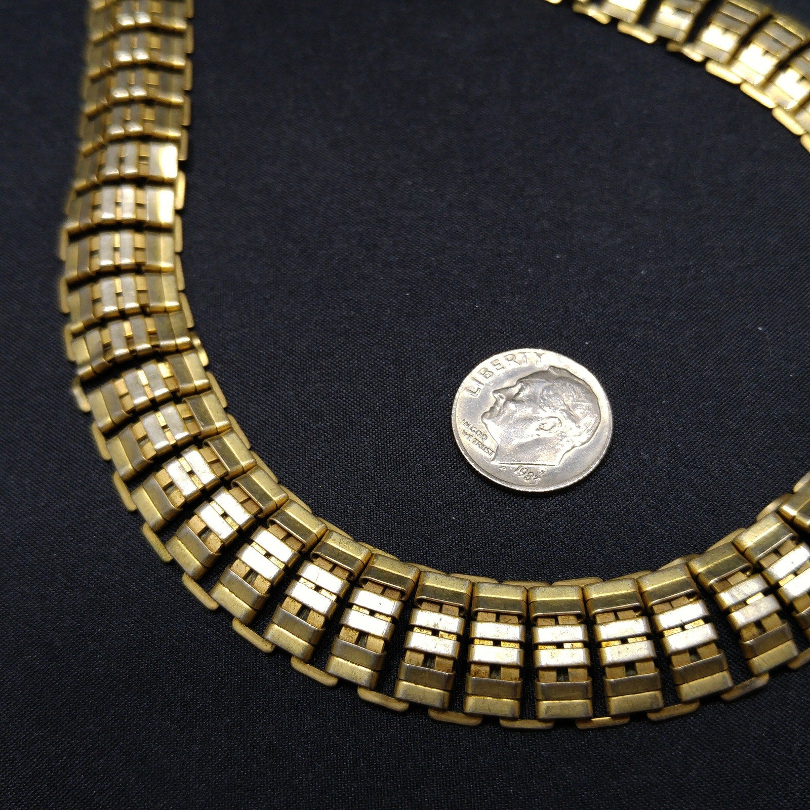 *Description: This is a great vintage link metal choker necklace, made in a book chain style, with a hint of vermeil, when tested, from the 1930s or before. The necklace is 16 inches in length and closes with a wide alligator clasp. This would be a great addition to your vintage jewelry collection or make a great vintage gift!