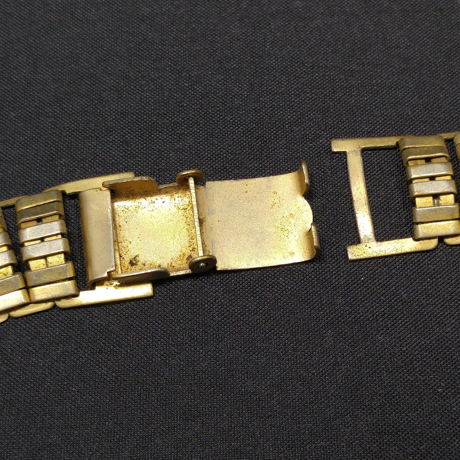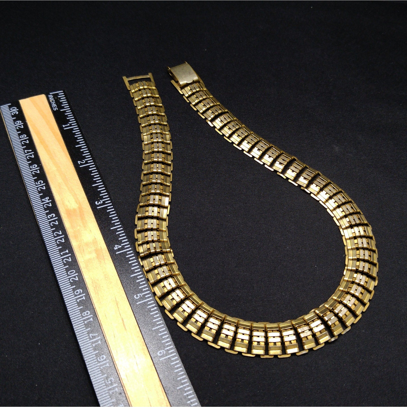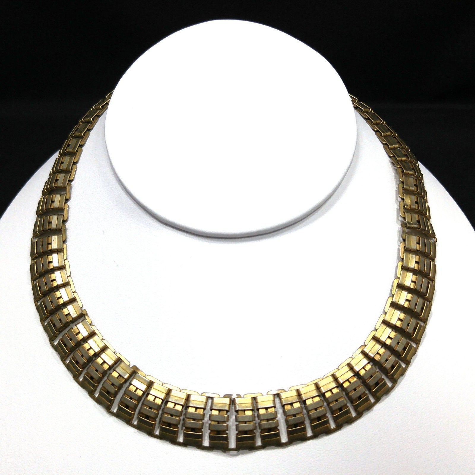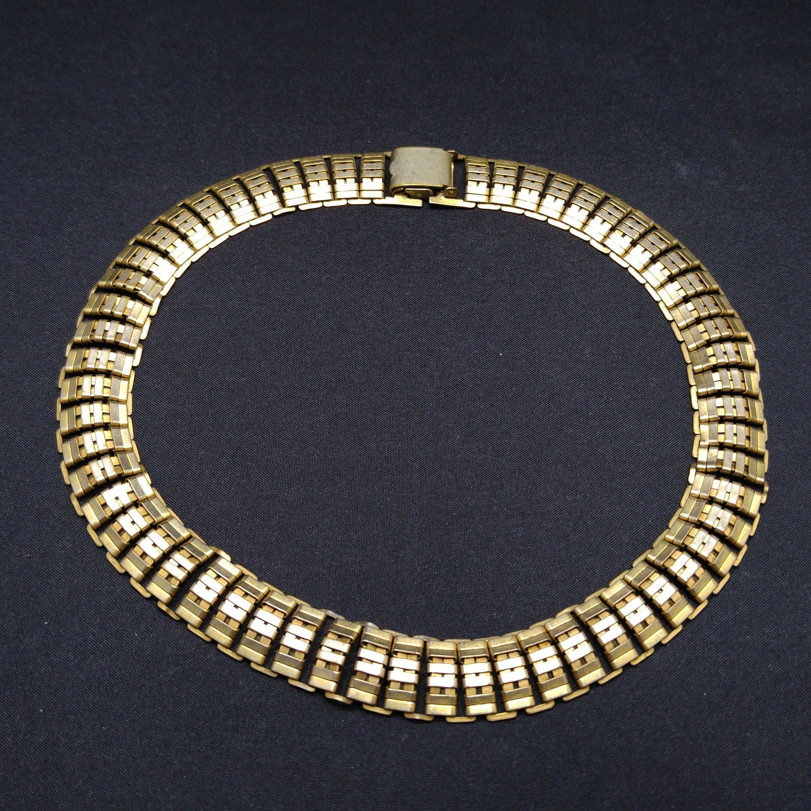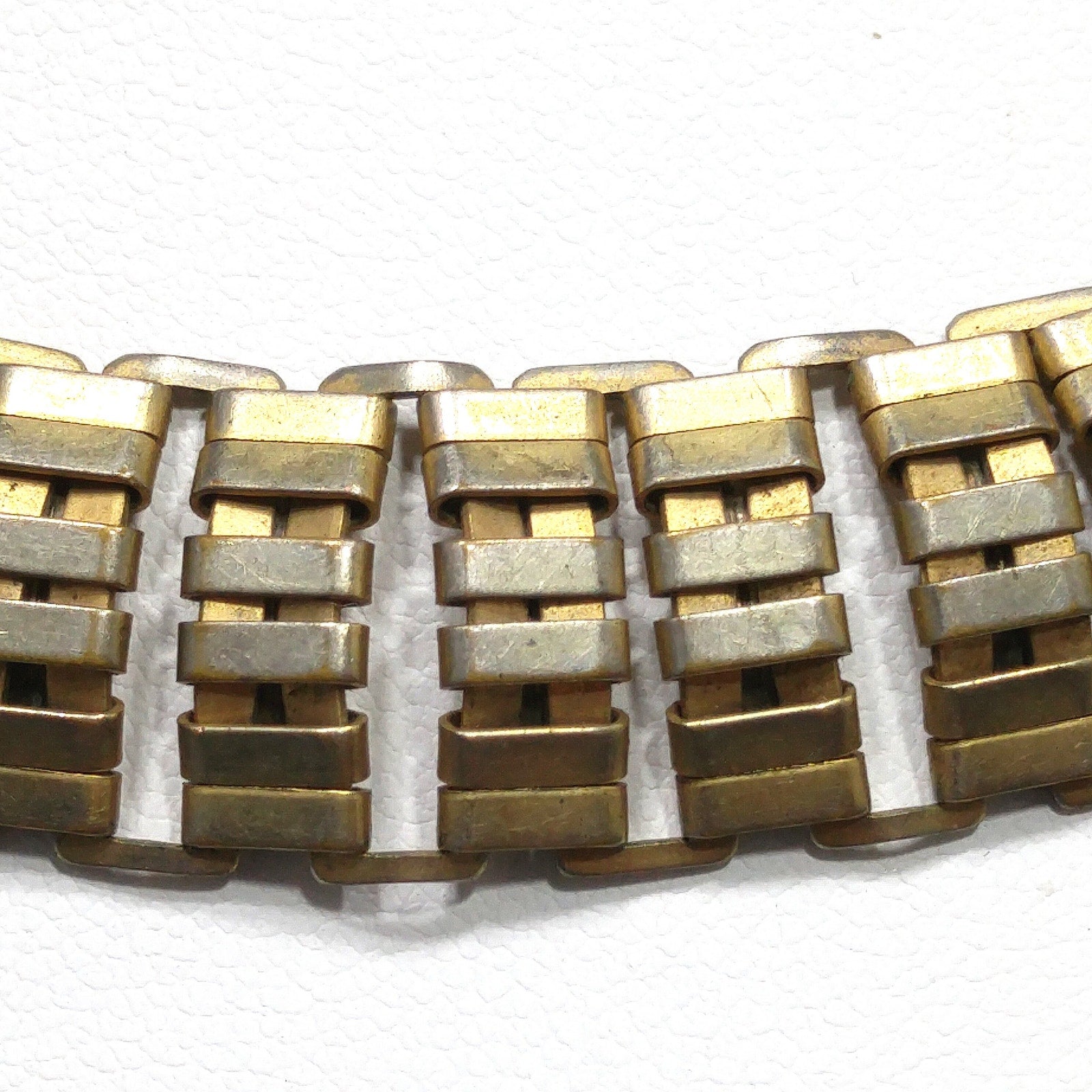 *Description: This is a great vintage link metal choker necklace, made in a book chain style, with a hint of vermeil, when tested, from the 1930s or before. The necklace is 16 inches in length and closes with a wide alligator clasp. This would be a great addition to your vintage jewelry collection or make a great vintage gift!