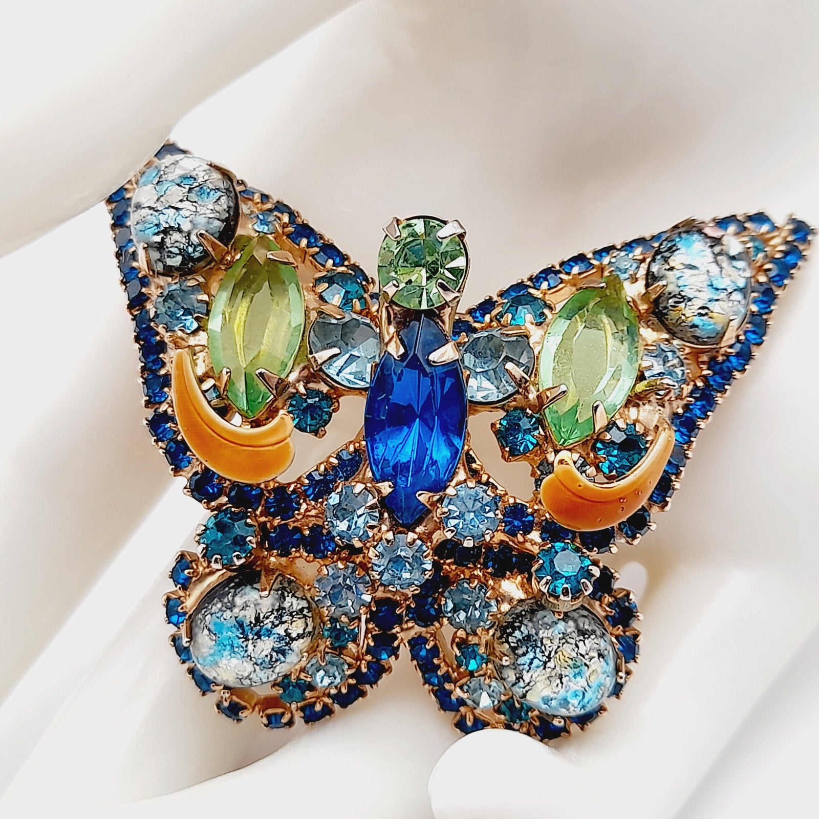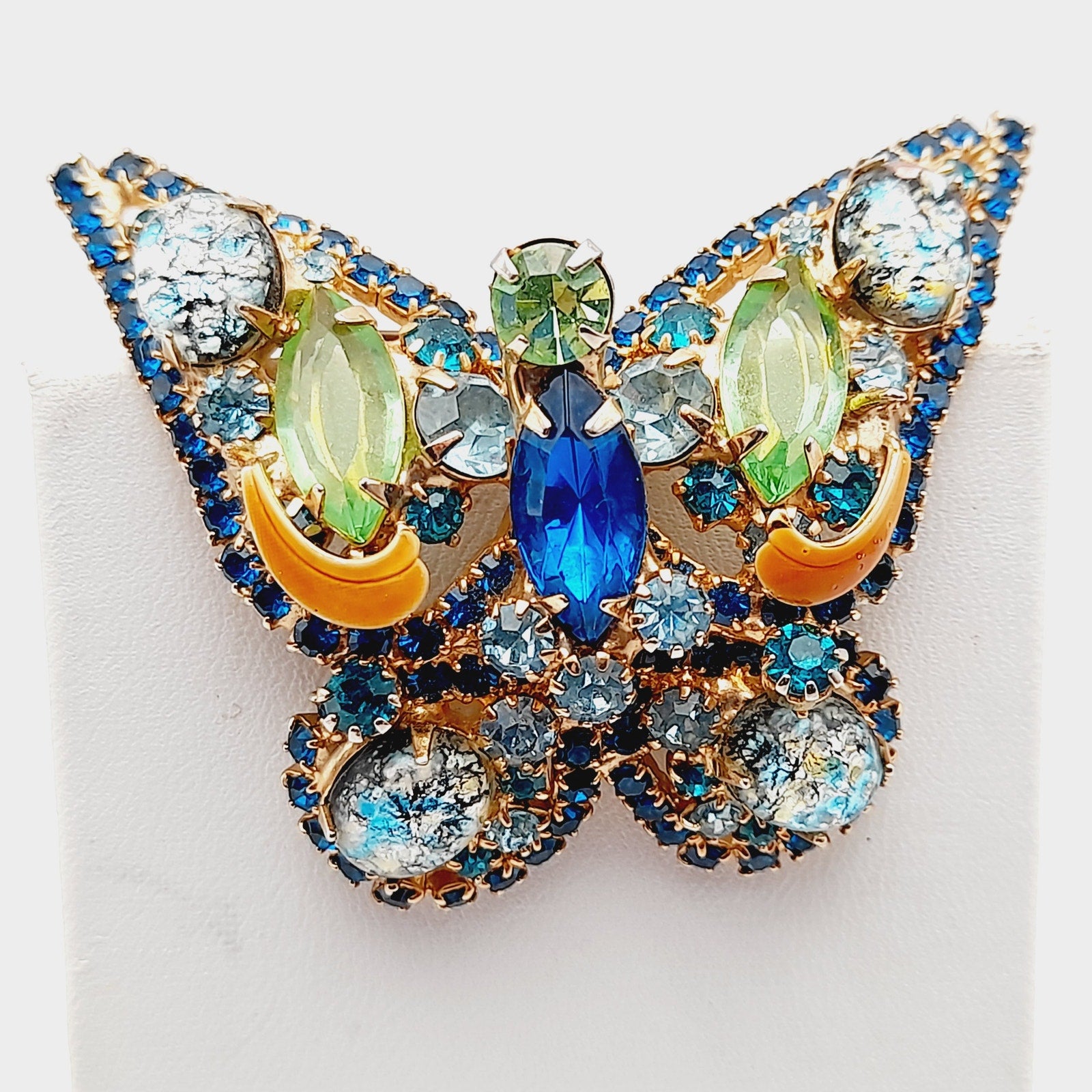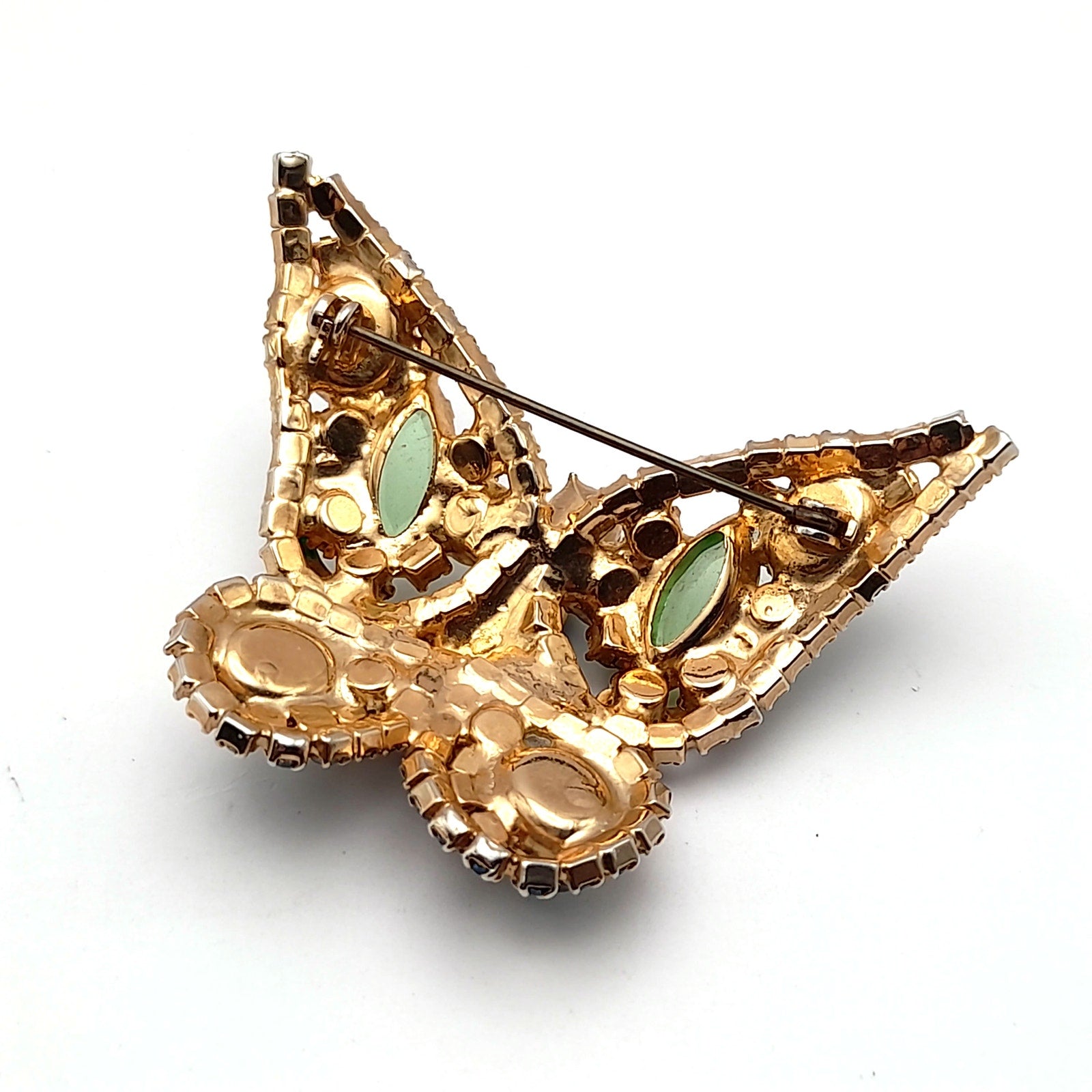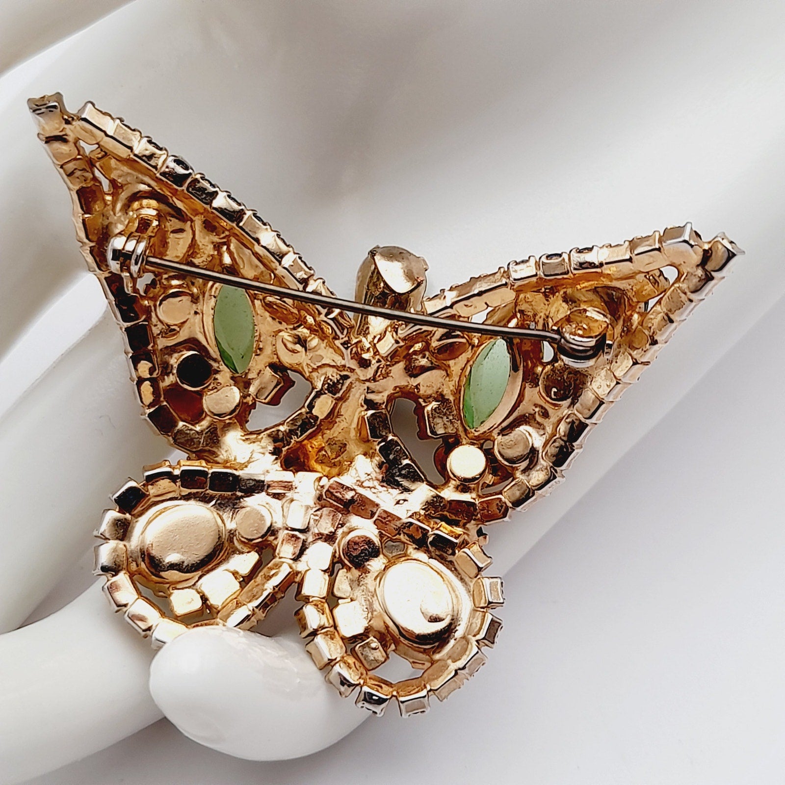 The intricate design features faceted rhinestones, marquise and round cuts, and foil-backed art glass cabochons, all securely prong-set for maximum brilliance. This collectible mid-century rhinestone brooch captures the whimsical elegance of butterfly jewelry, making it perfect for both everyday glamour and special occasions.