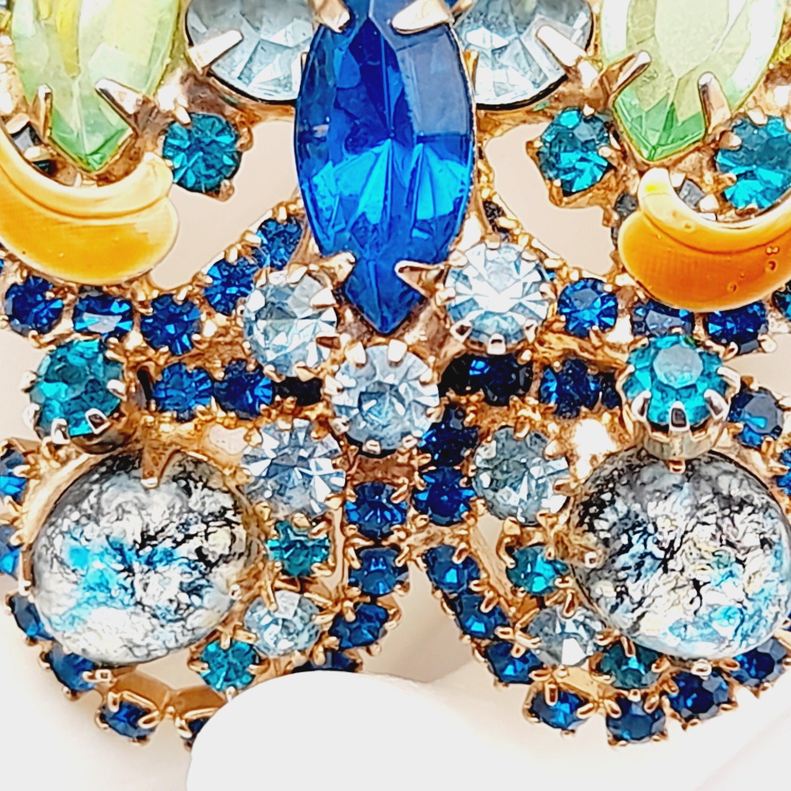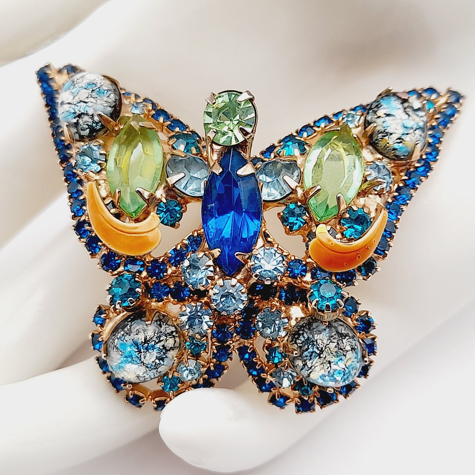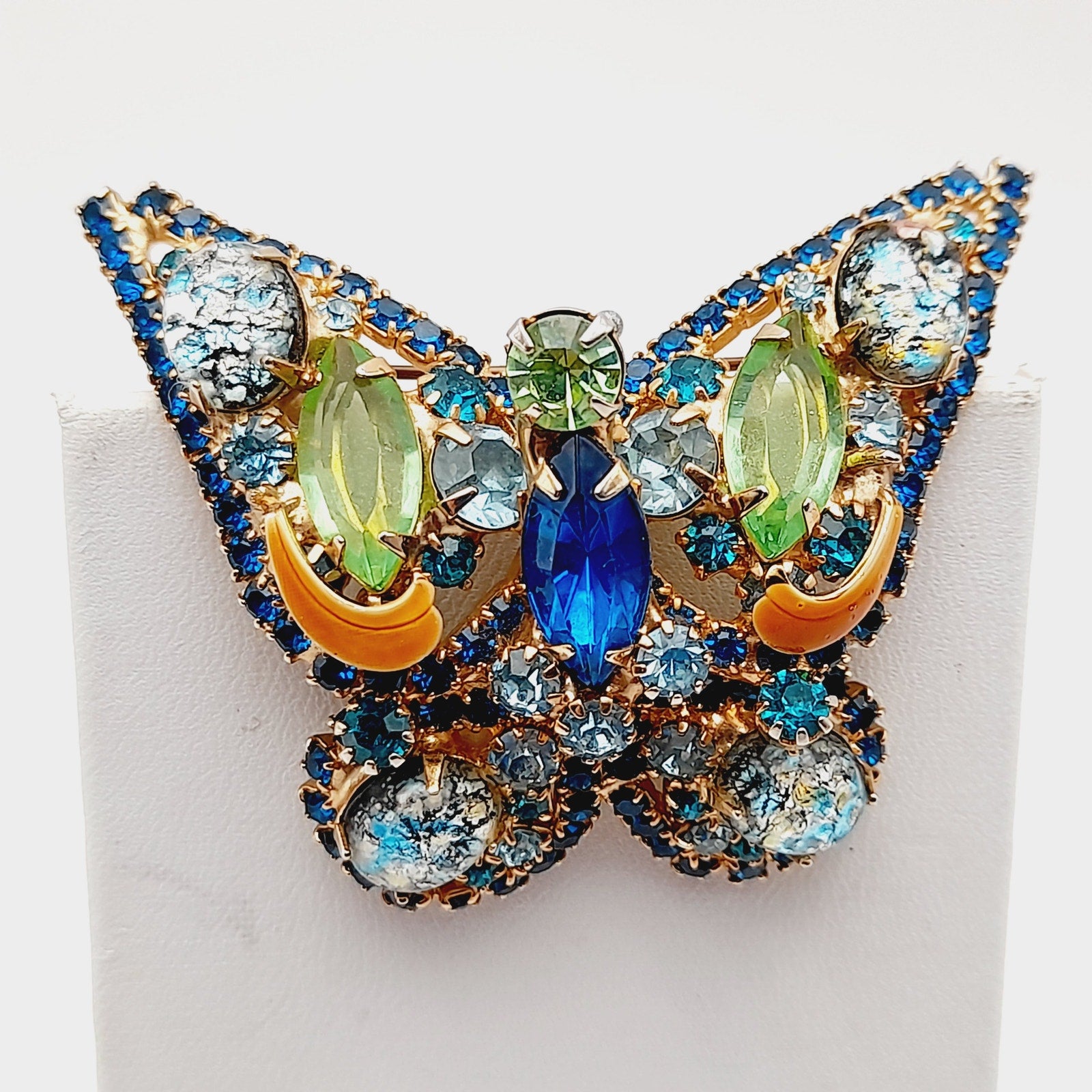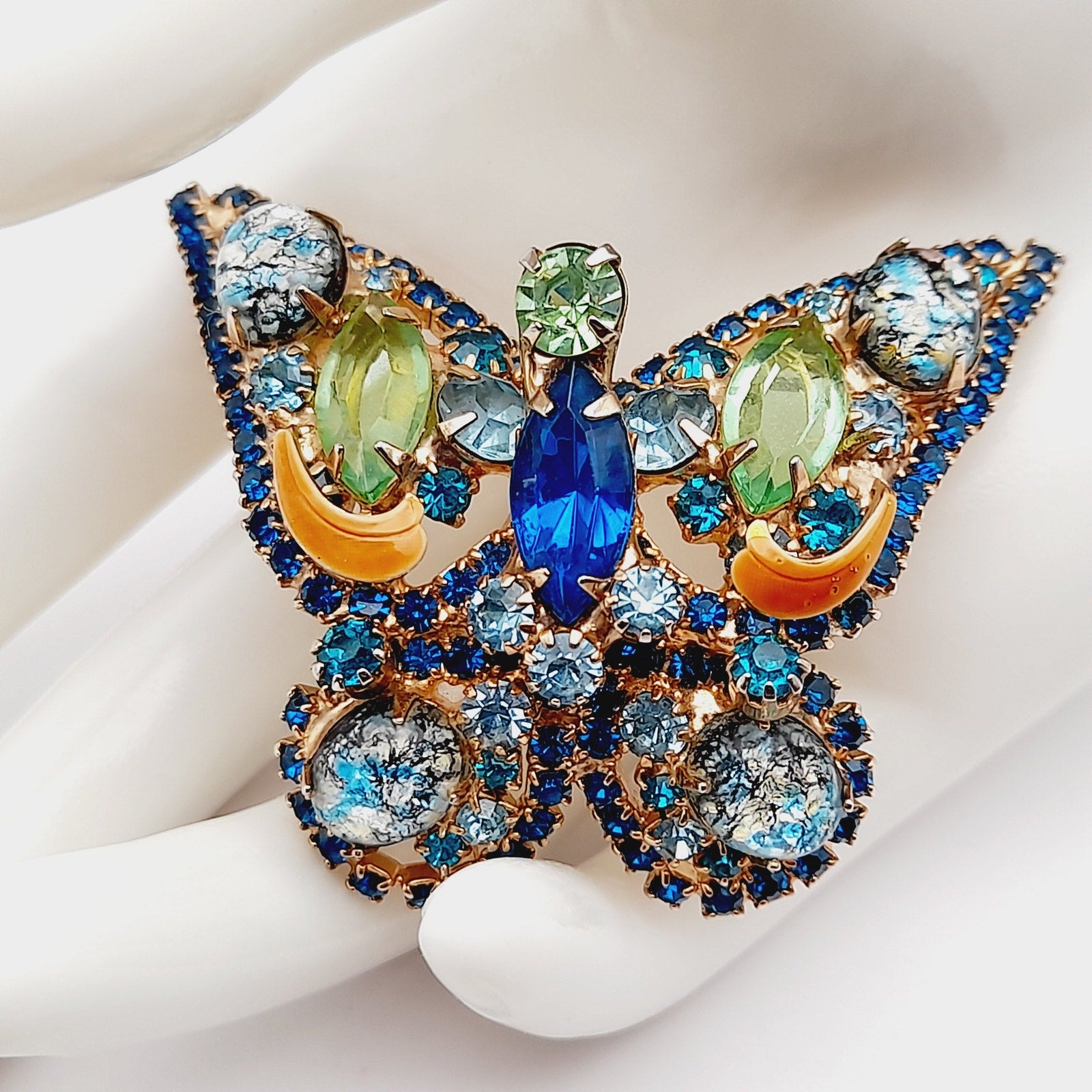 The intricate design features faceted rhinestones, marquise and round cuts, and foil-backed art glass cabochons, all securely prong-set for maximum brilliance. This collectible mid-century rhinestone brooch captures the whimsical elegance of butterfly jewelry, making it perfect for both everyday glamour and special occasions.
