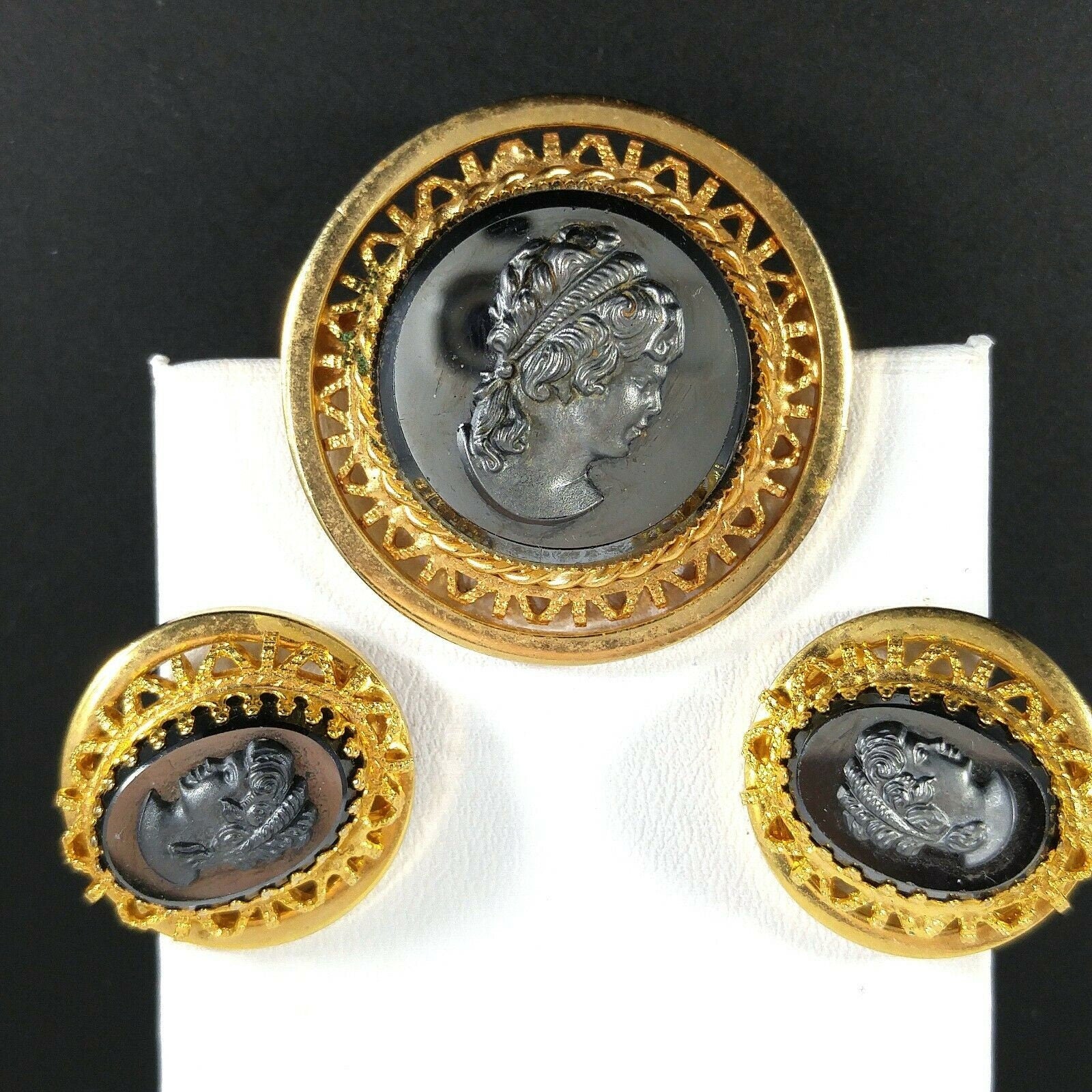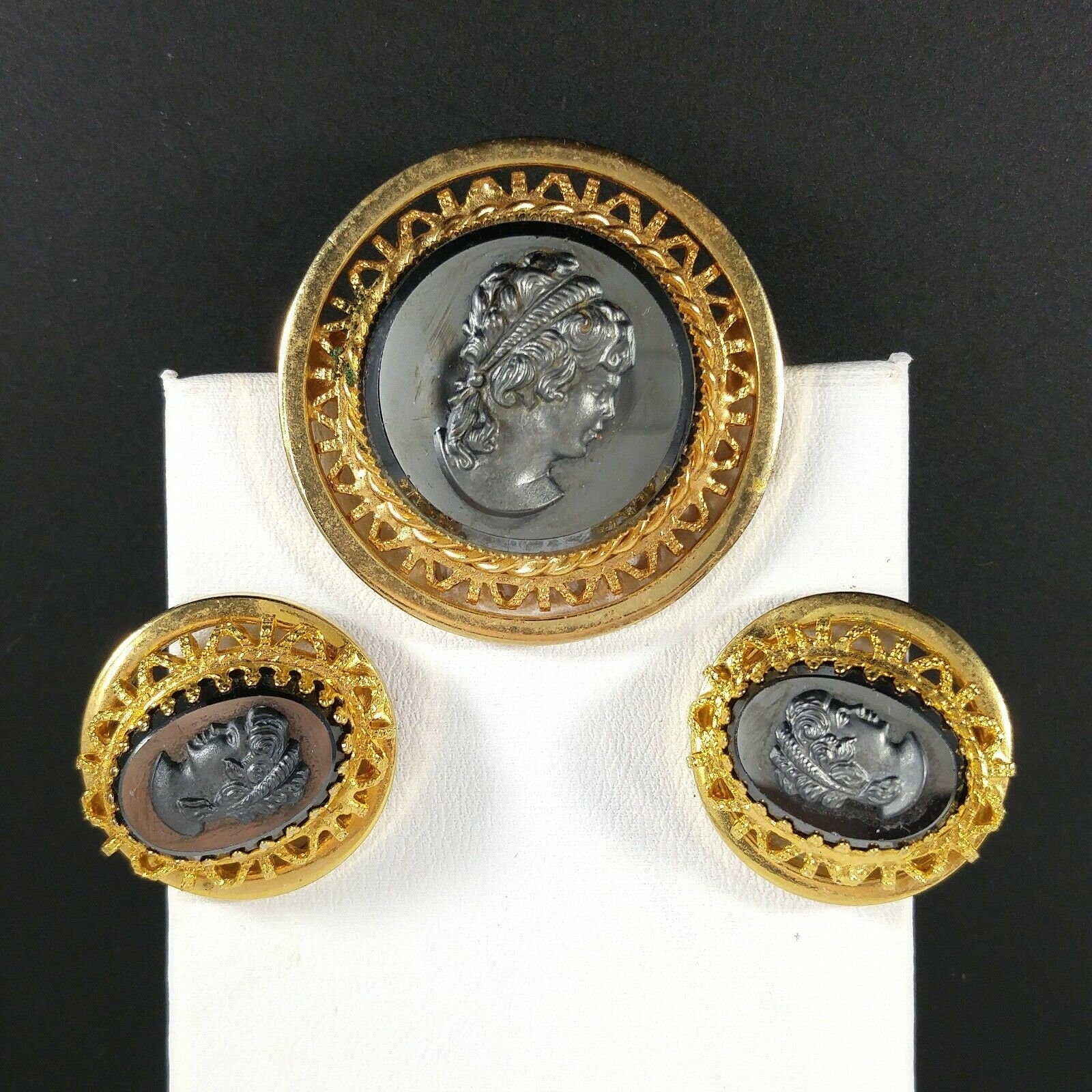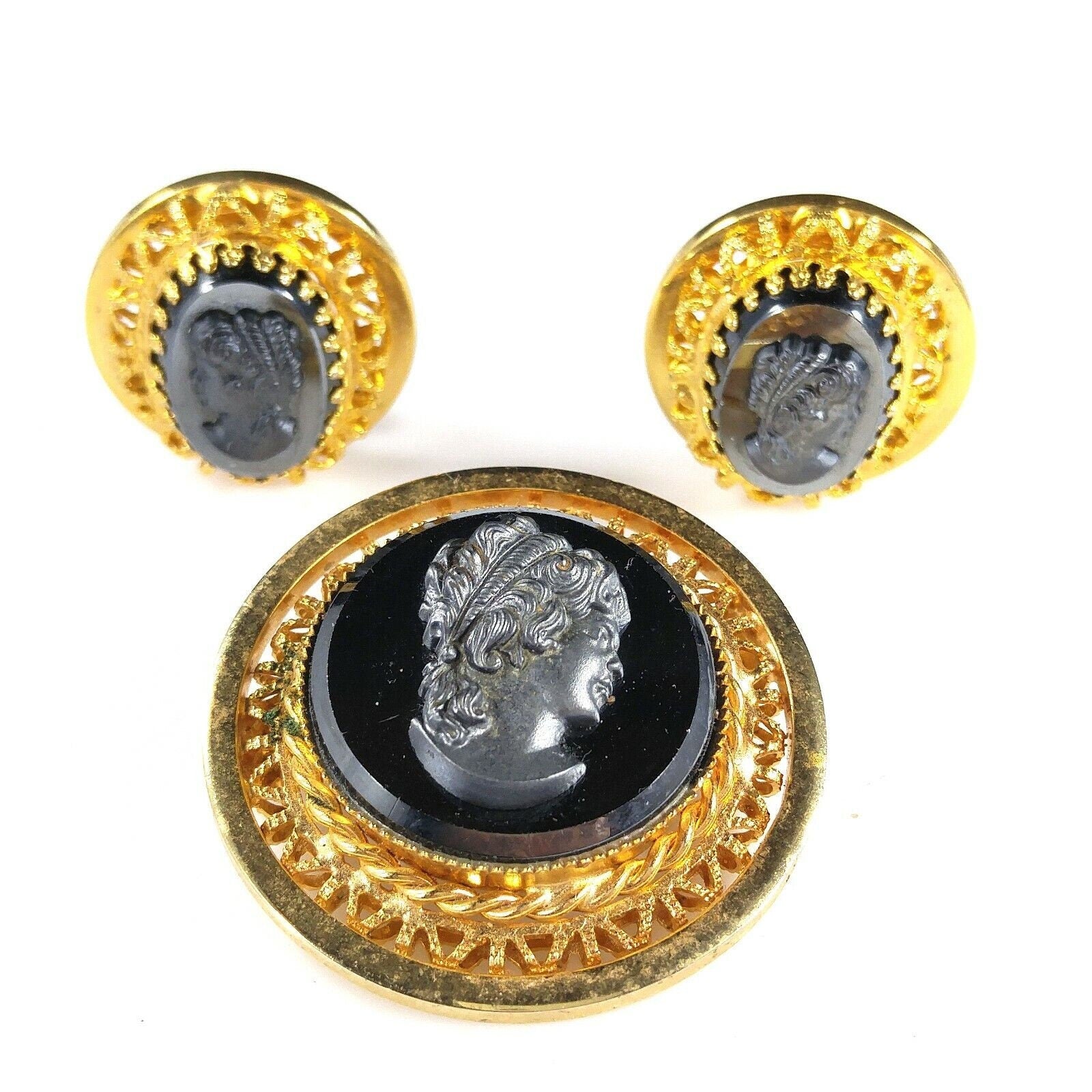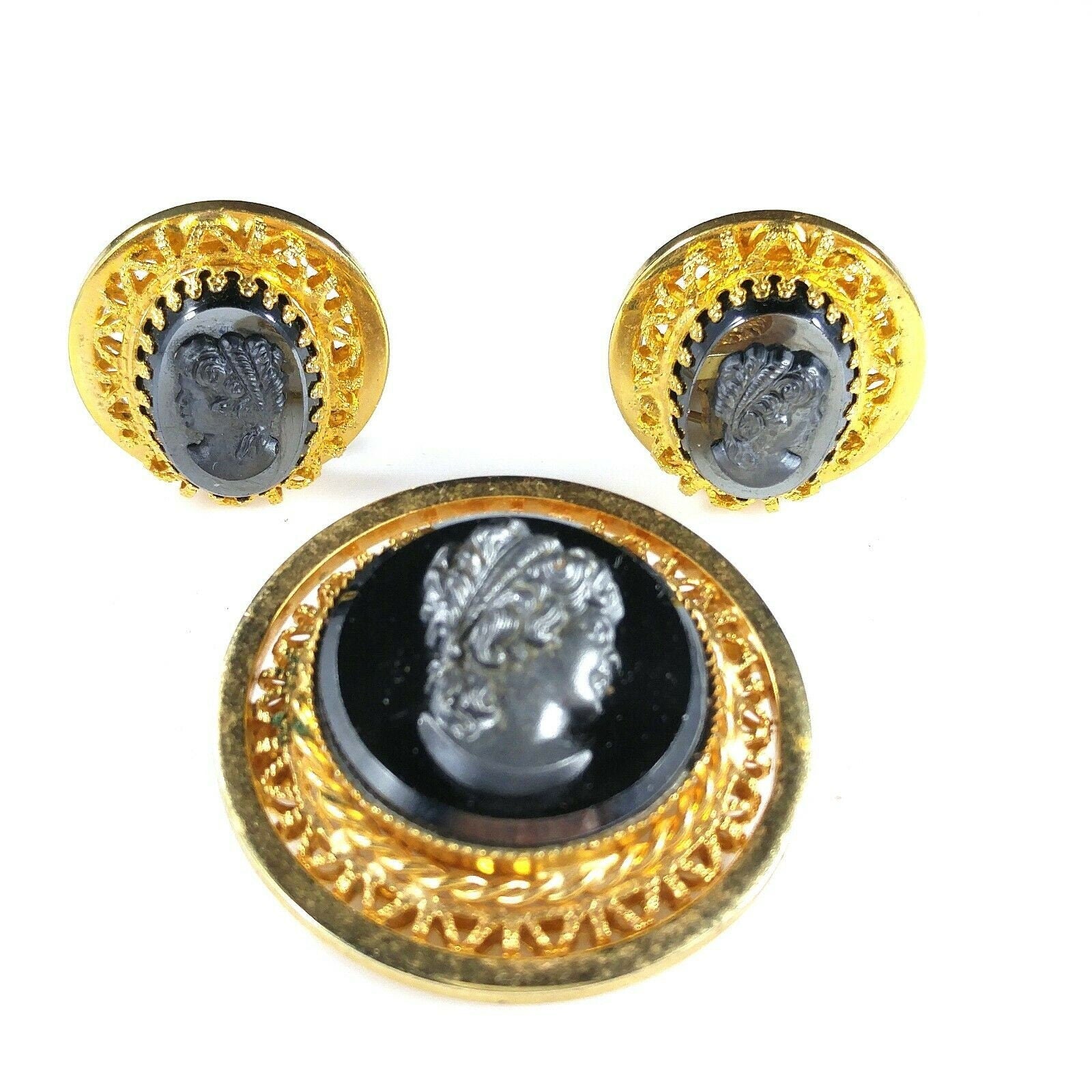 *Description: This is a beautiful cameo brooch and clip on earrings set in faux hematite and gold tone filigree from the 1950s. The set is in the West Germany style but is unsigned. This would be a great addition to your vintage jewelry collection or make a great vintage gift!