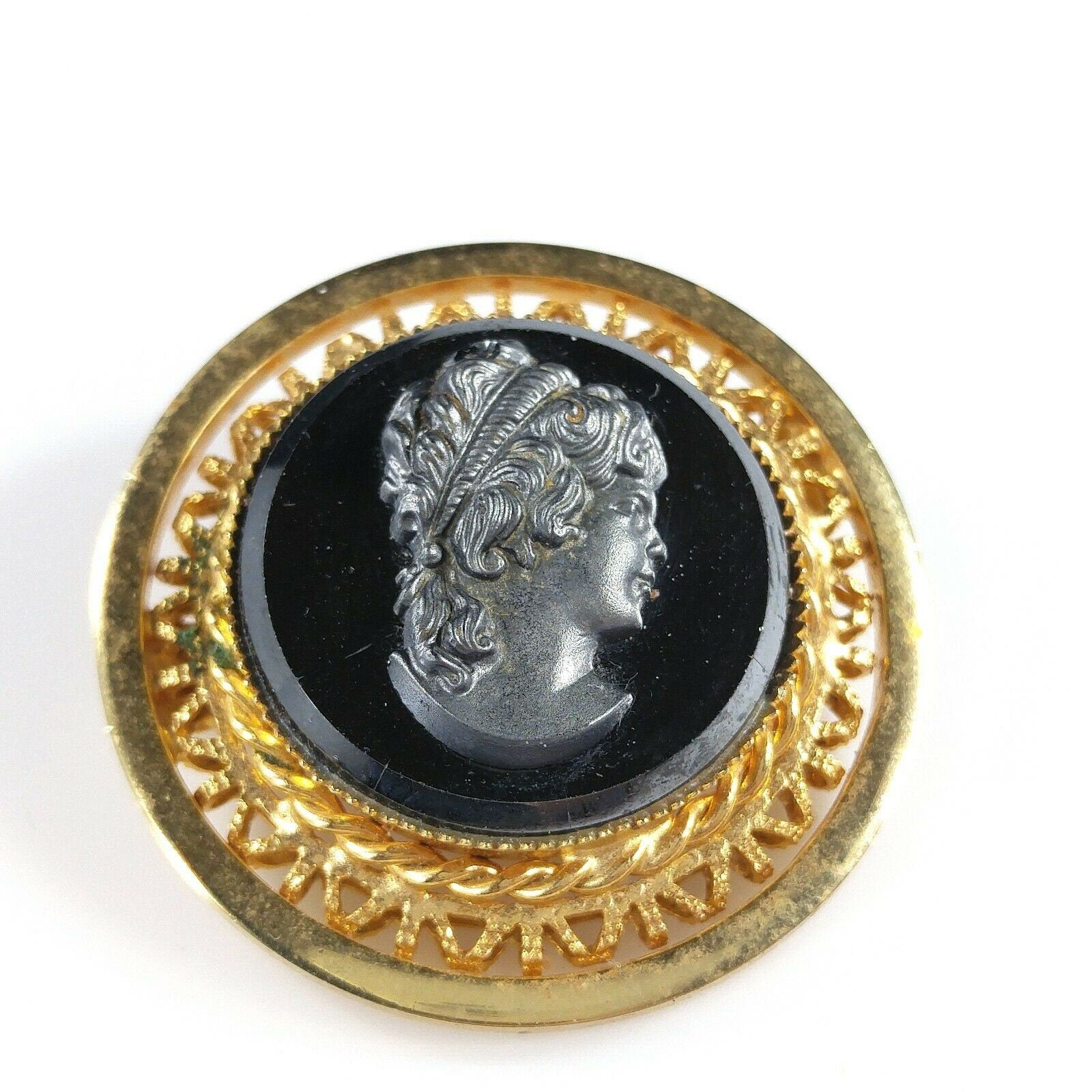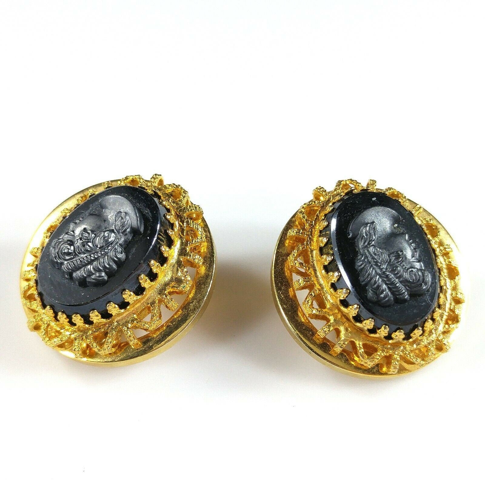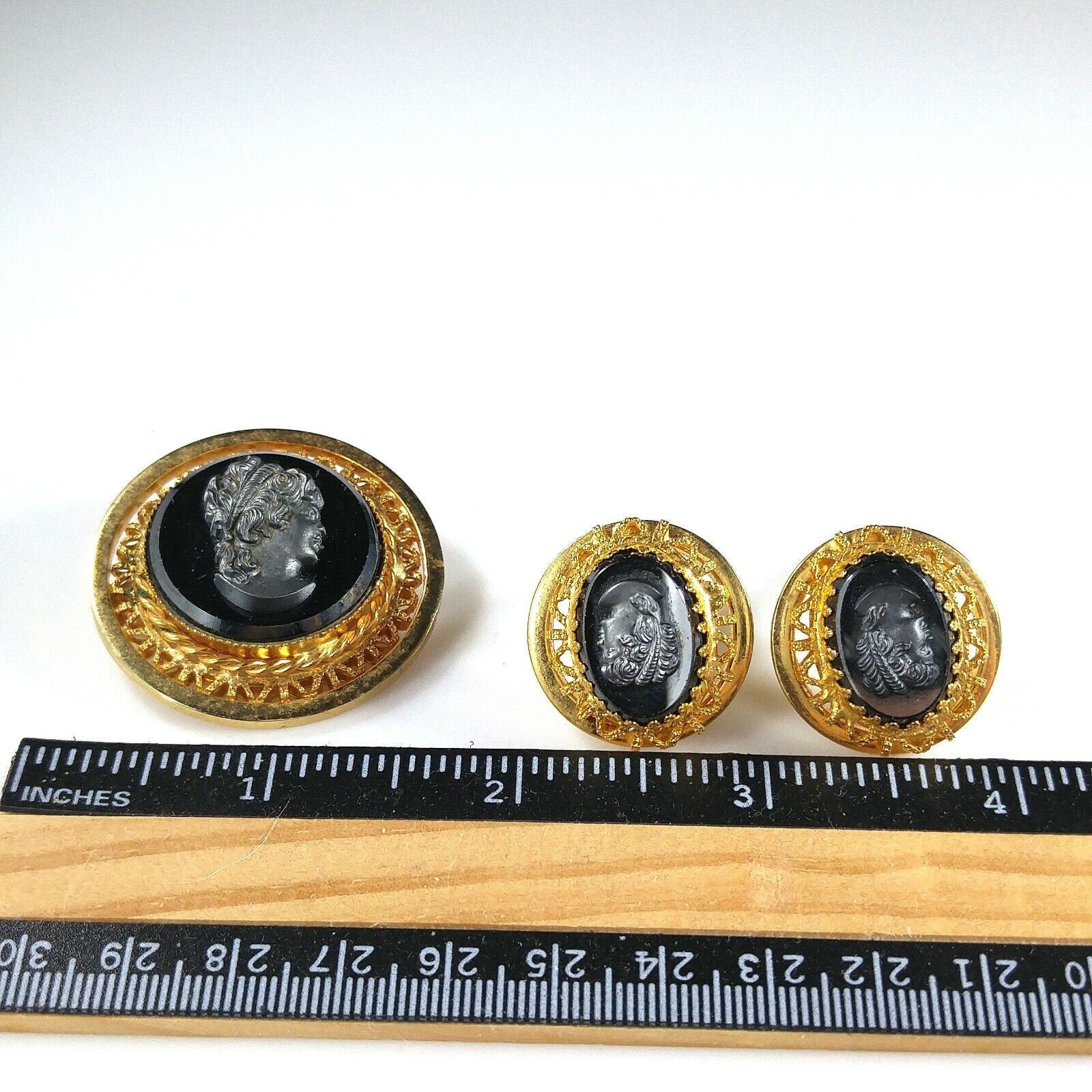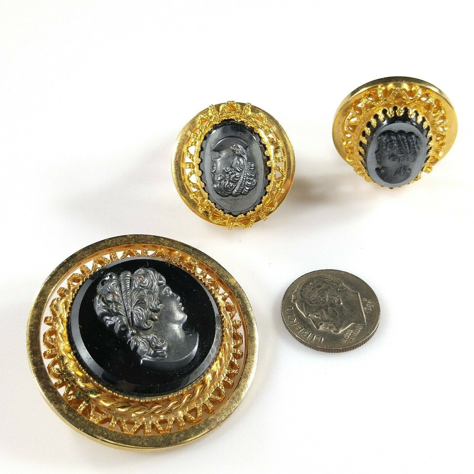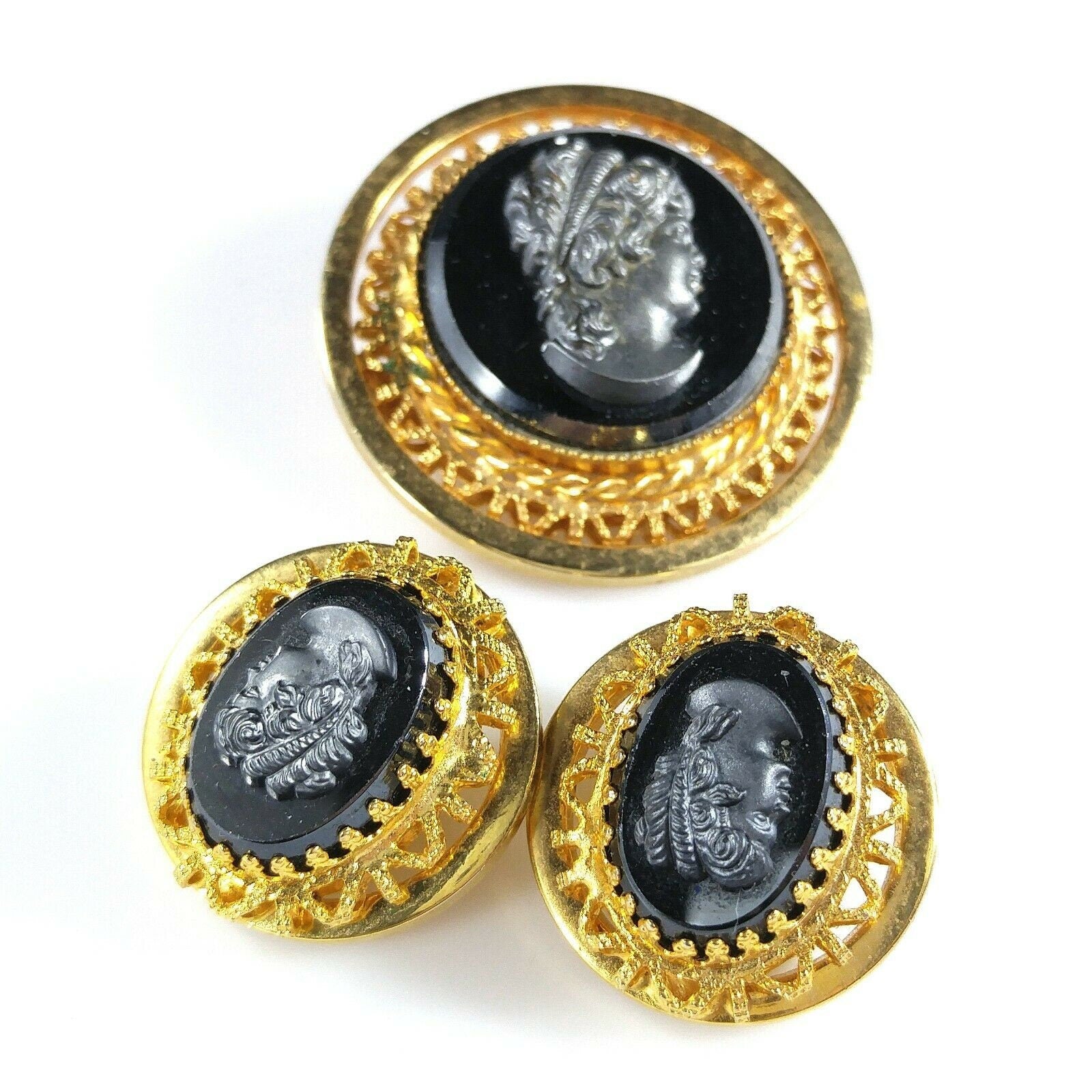 *Description: This is a beautiful cameo brooch and clip on earrings set in faux hematite and gold tone filigree from the 1950s. The set is in the West Germany style but is unsigned. This would be a great addition to your vintage jewelry collection or make a great vintage gift!