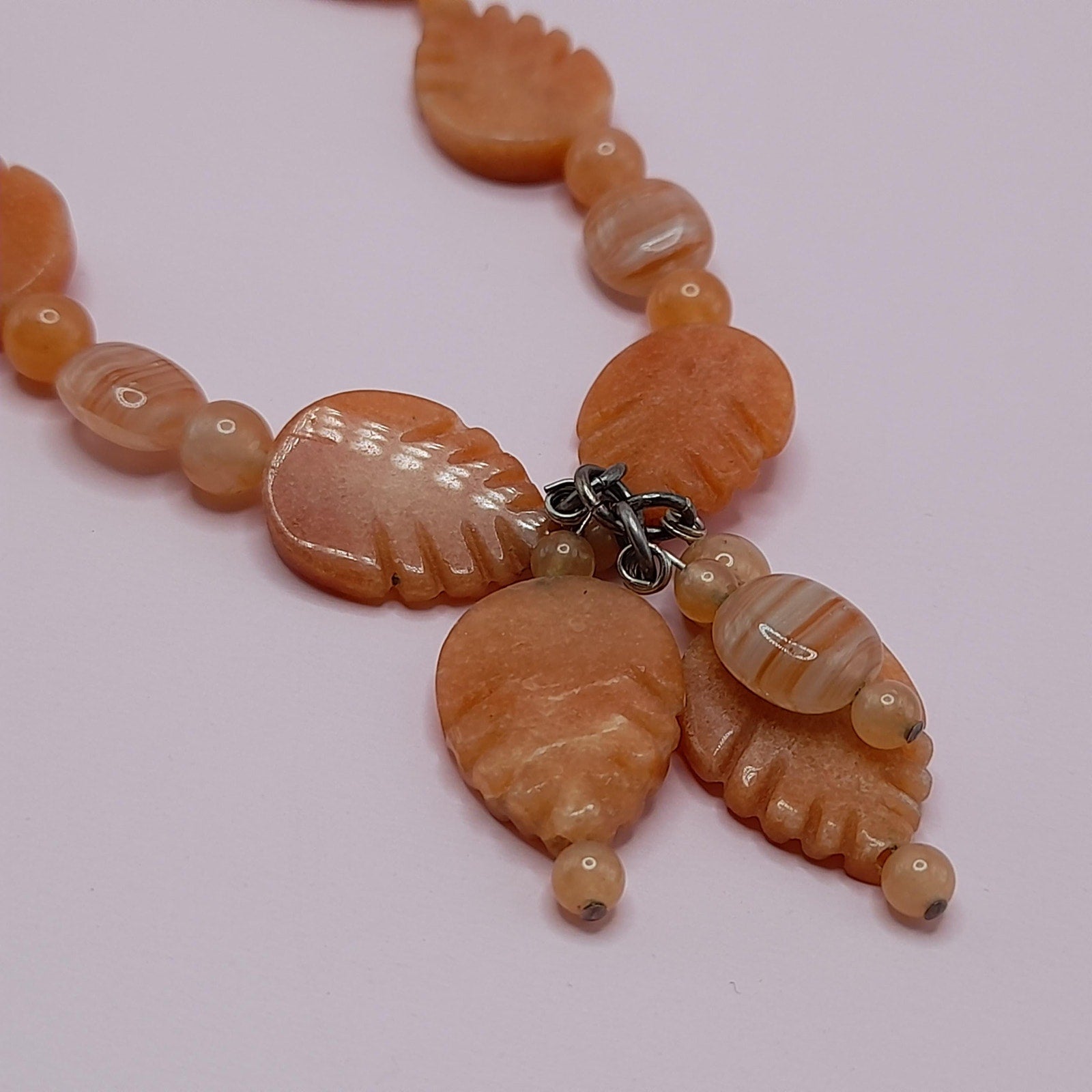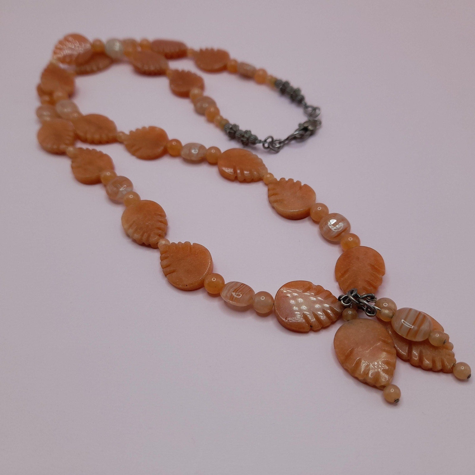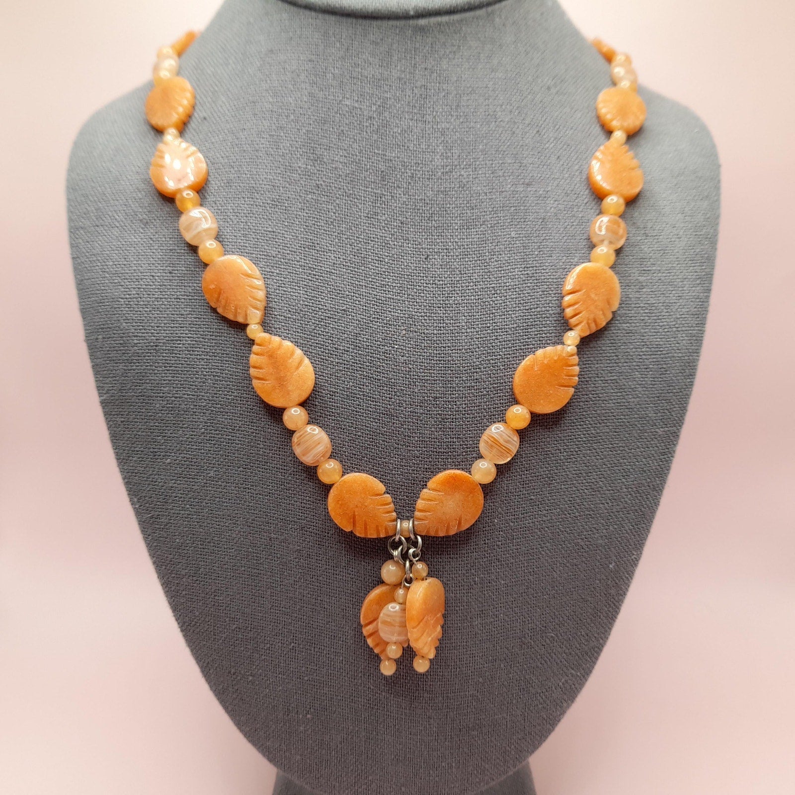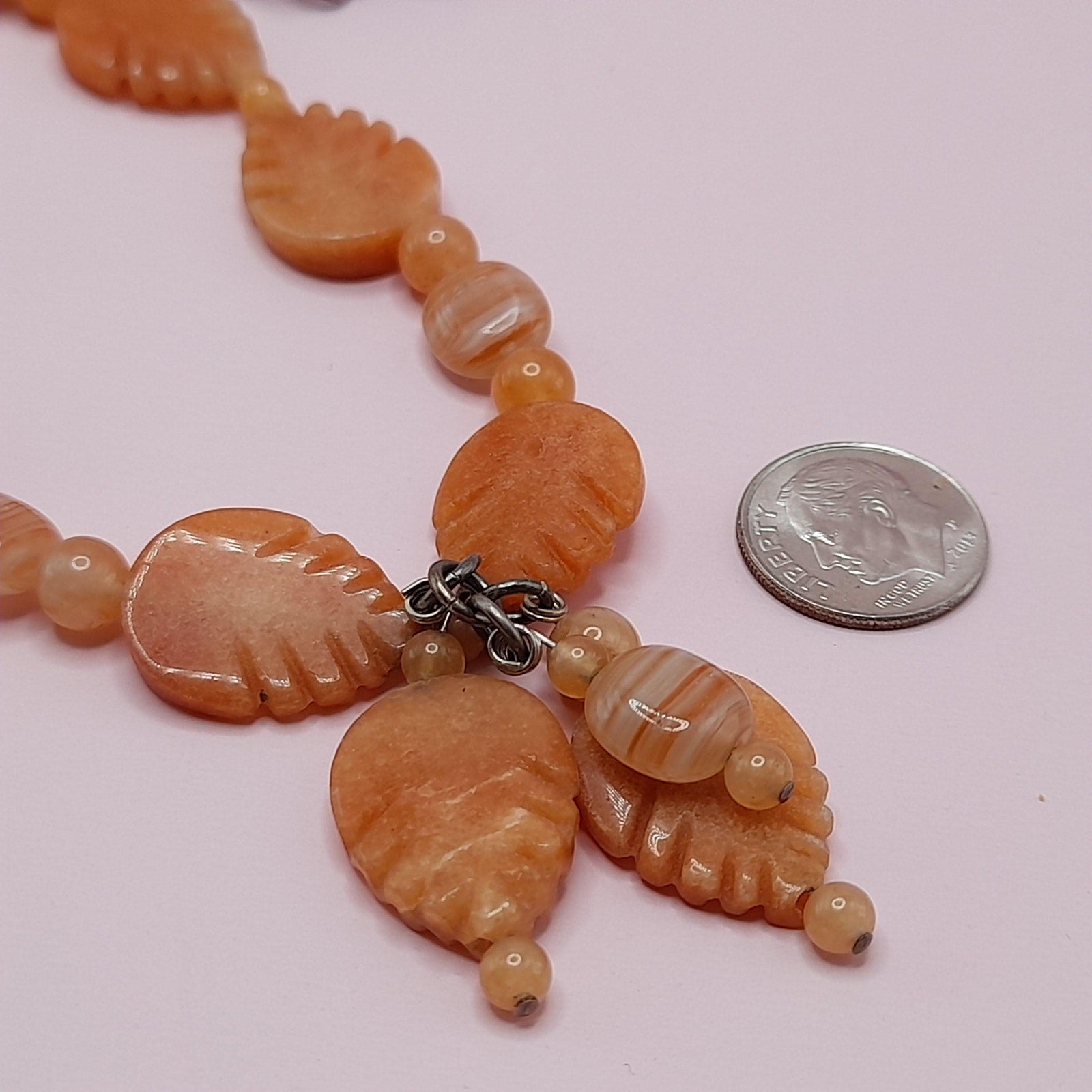 *Description: This is a beautiful carnelian gemstone fancy leaf bead necklace from the 1990s. The clasp is lobster clasp with a small heart. The beads are carnelian gemstone which I checked on my Presidium gem tester. This would be a great addition to your vintage jewelry collection or make a great vintage gift!