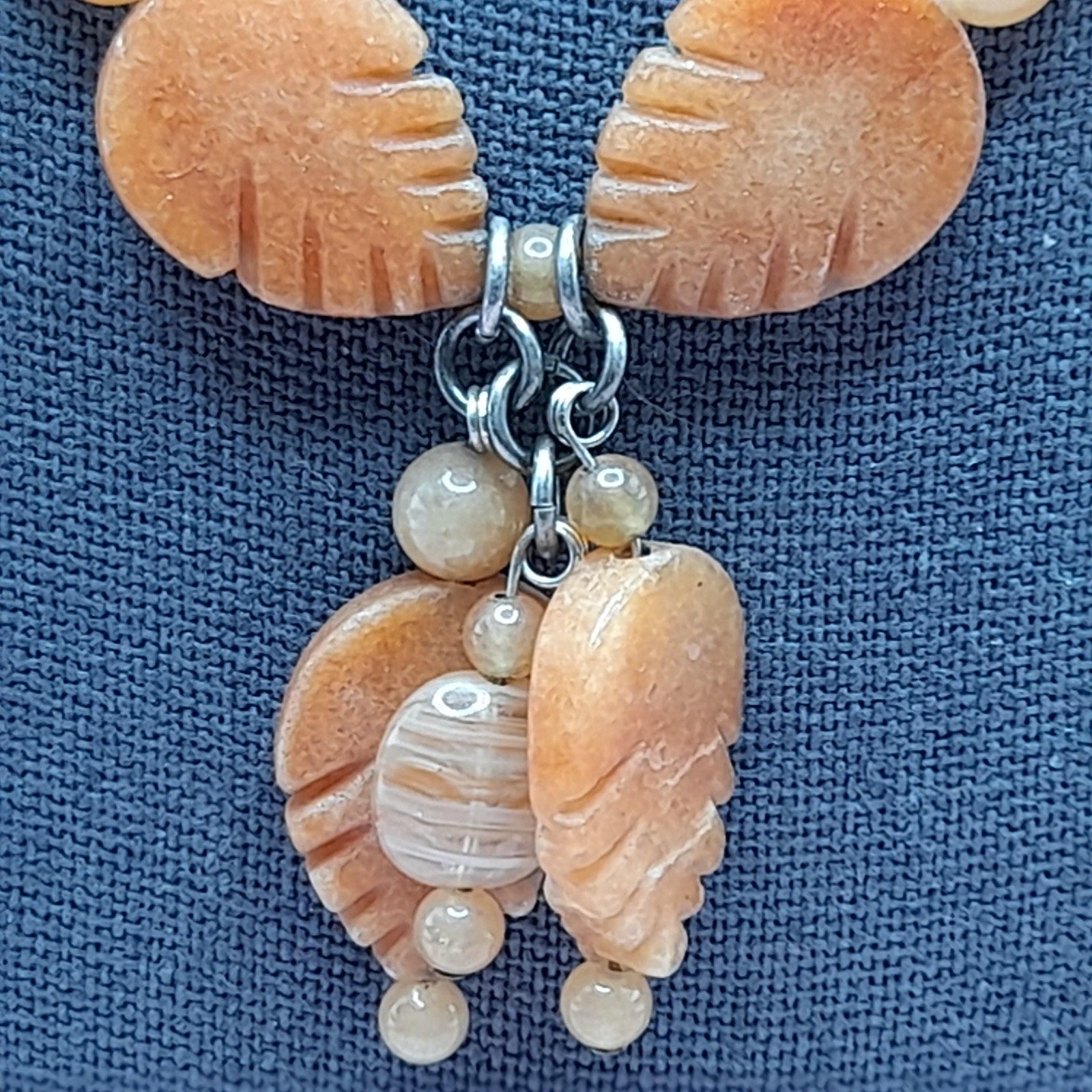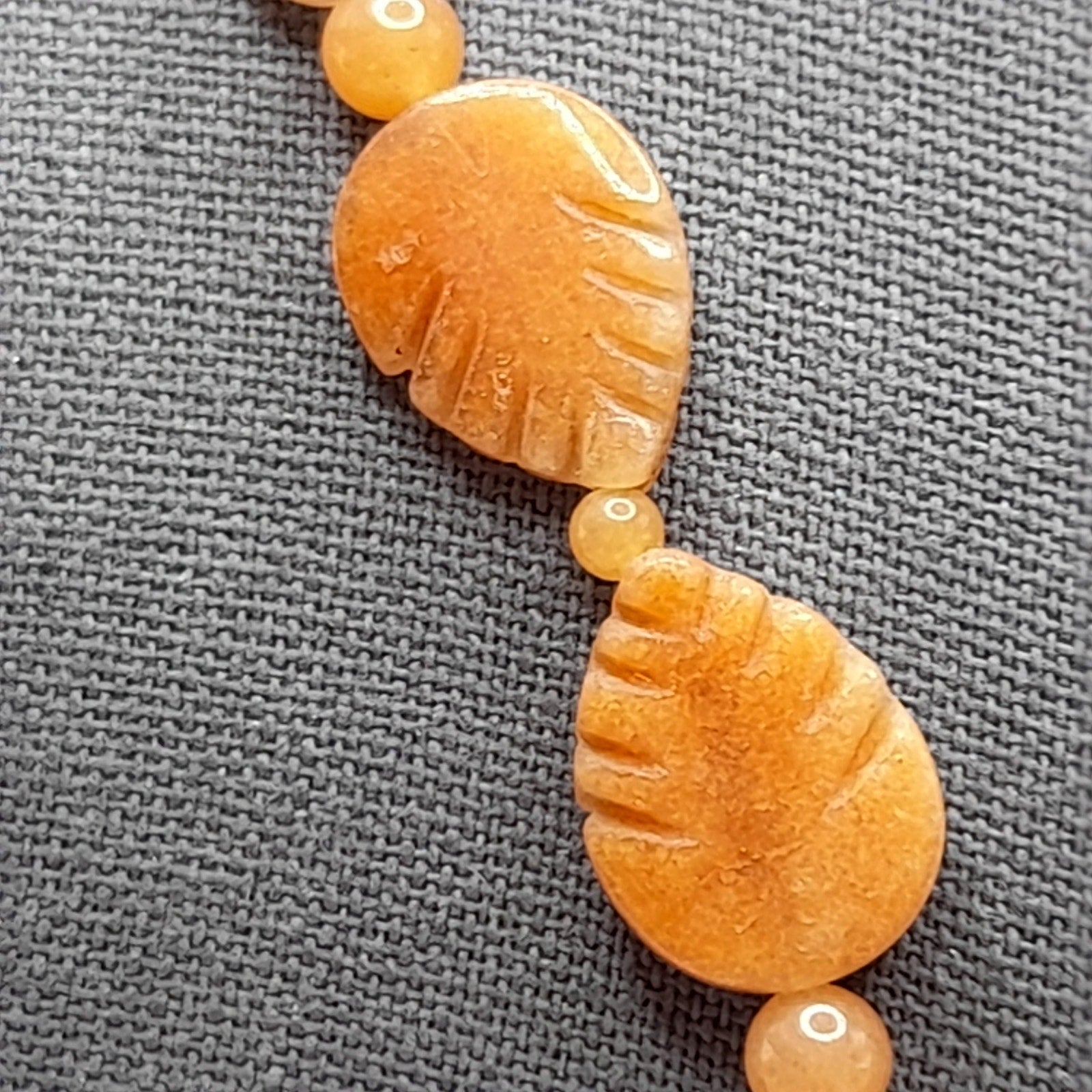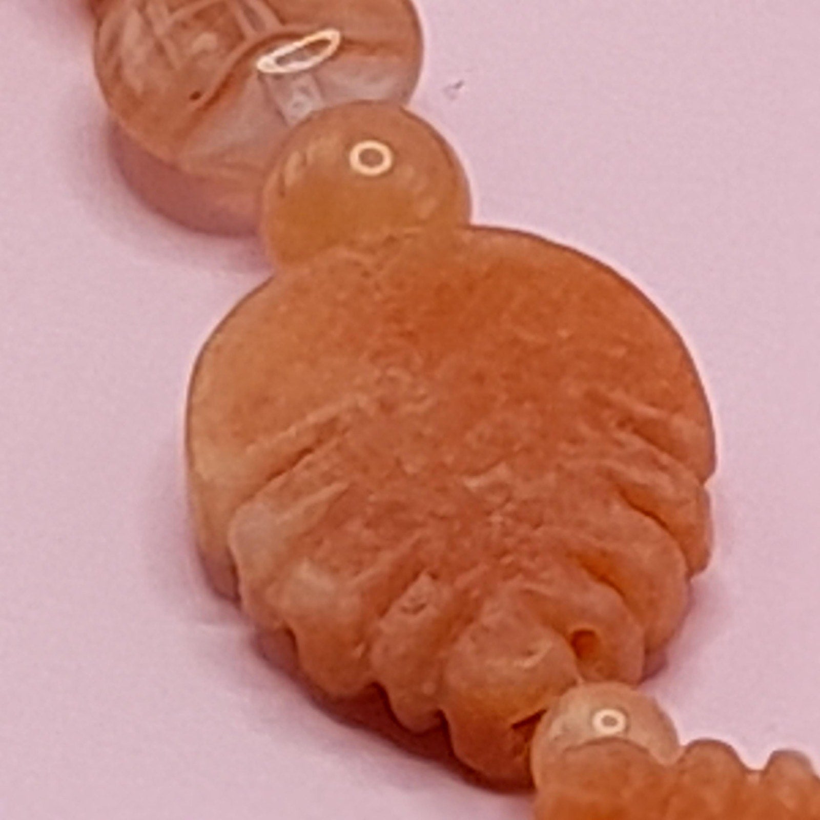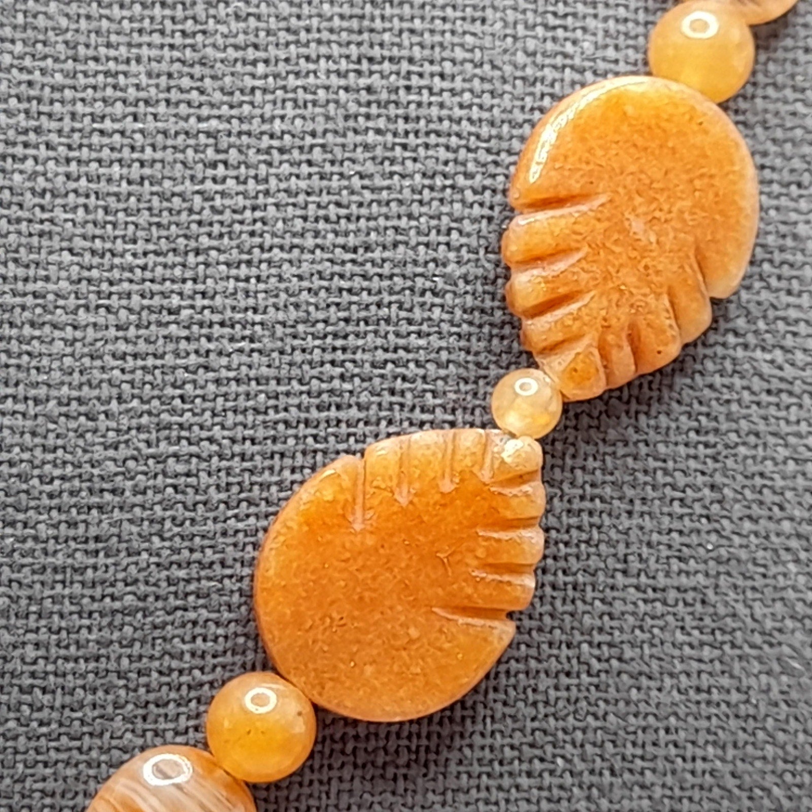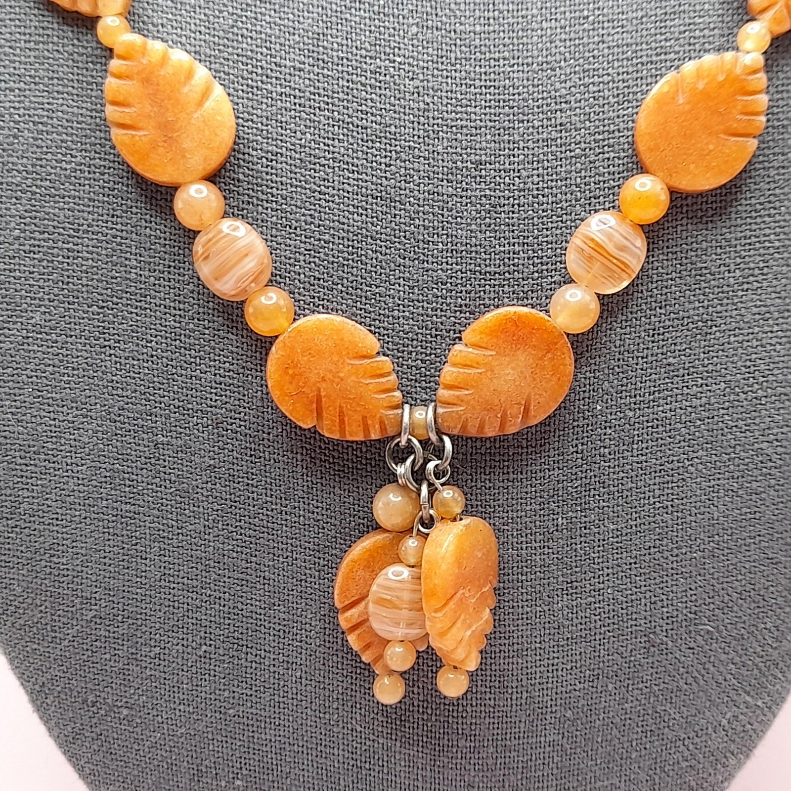 *Description: This is a beautiful carnelian gemstone fancy leaf bead necklace from the 1990s. The clasp is lobster clasp with a small heart. The beads are carnelian gemstone which I checked on my Presidium gem tester. This would be a great addition to your vintage jewelry collection or make a great vintage gift!