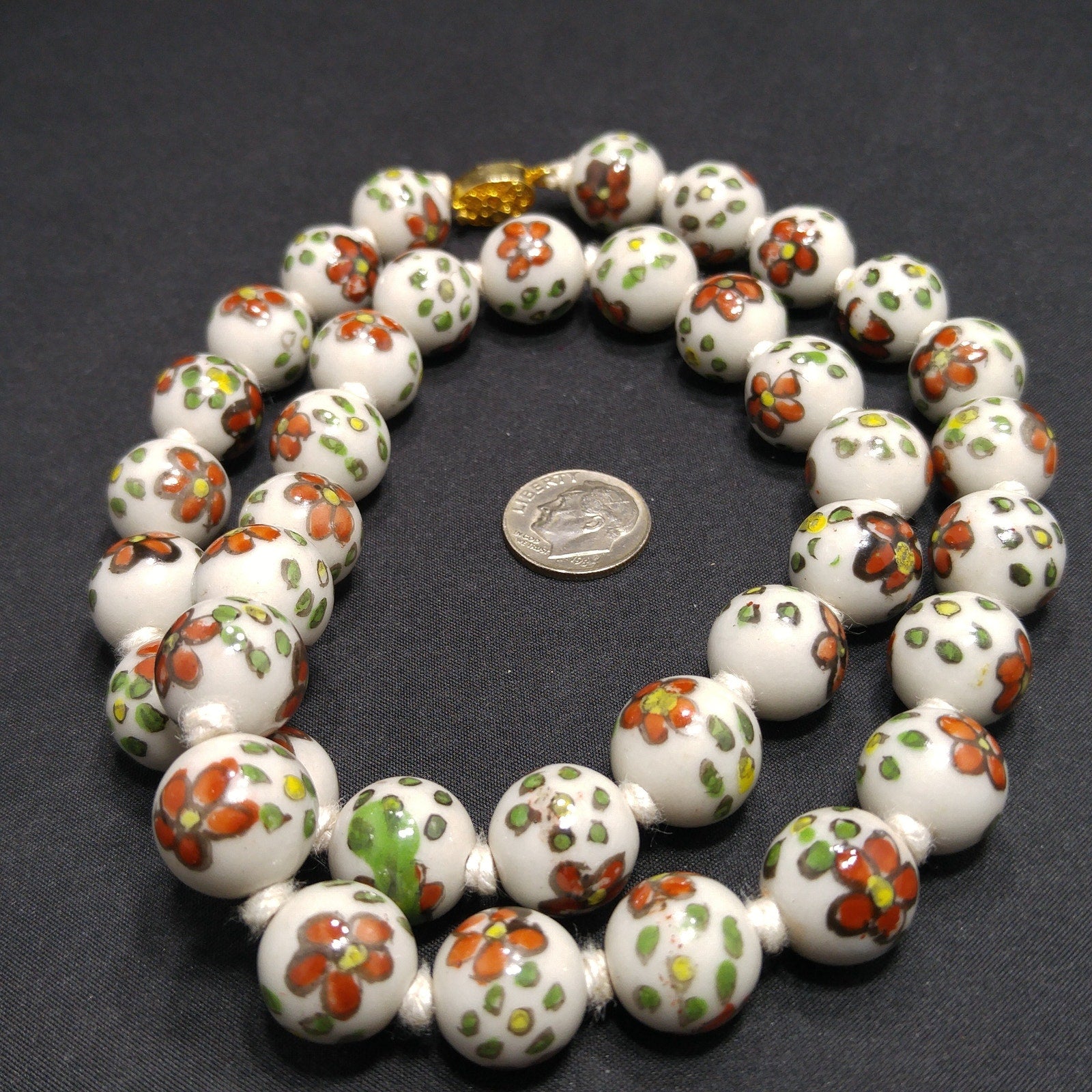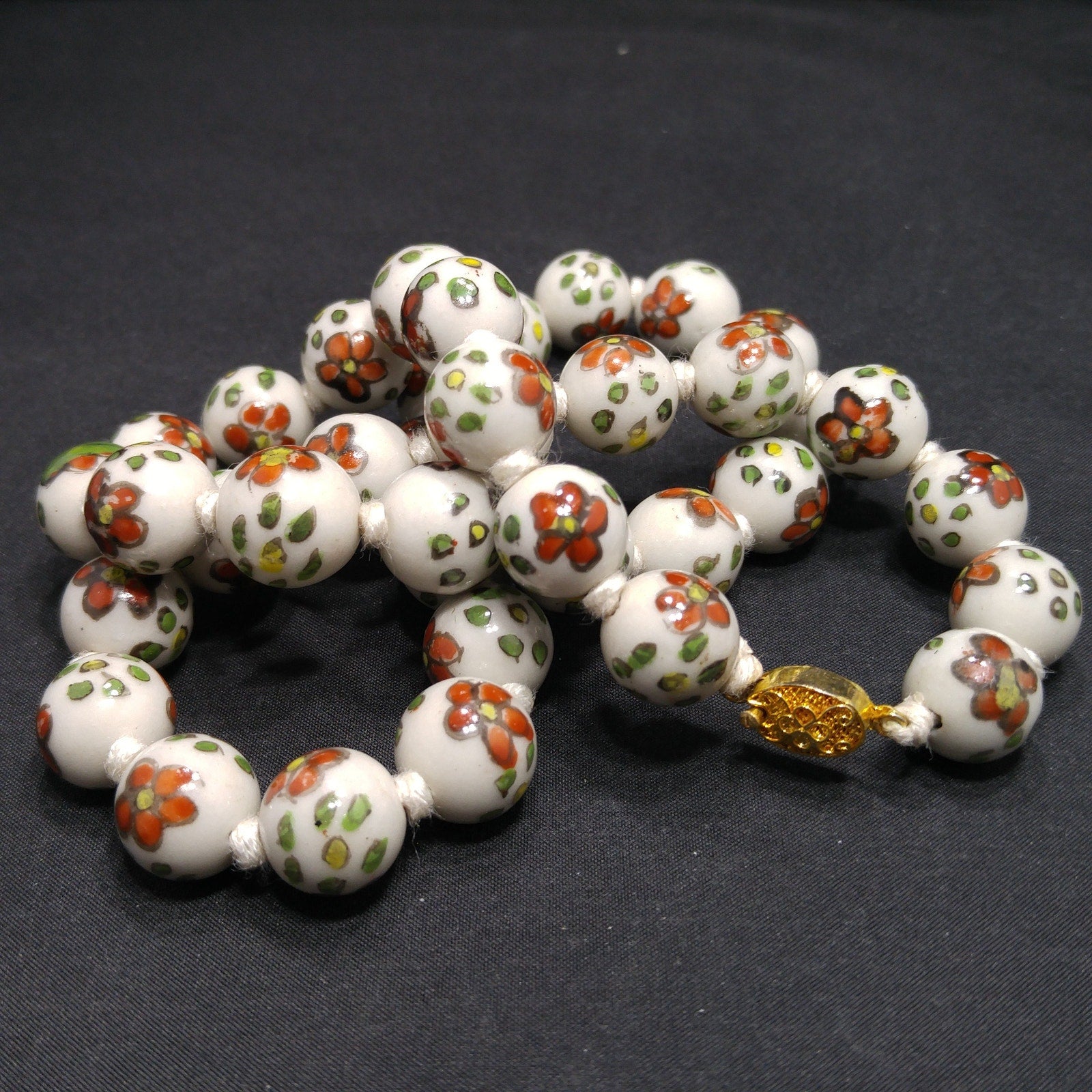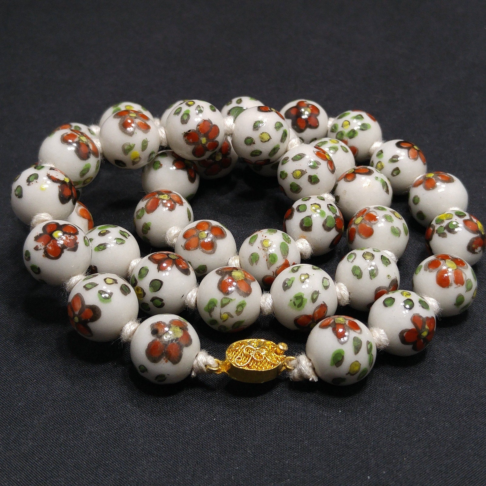 *Description: This necklace is from the 1960s and is a Chinese hand painted, hand knotted floral ceramic beaded necklace with a filigree gold tone sliding clasp. The beads are a white background with flowers of red with yellow centers and green with yellow centers. The flowers are outlined and all slightly different in design. Each round bead is 14mm and the hand knotted thread is white in color. They are a heavier necklace, weighing in at 4 ounces. This would be a great addition to your vintage jewelry collection or make a great vintage gift!