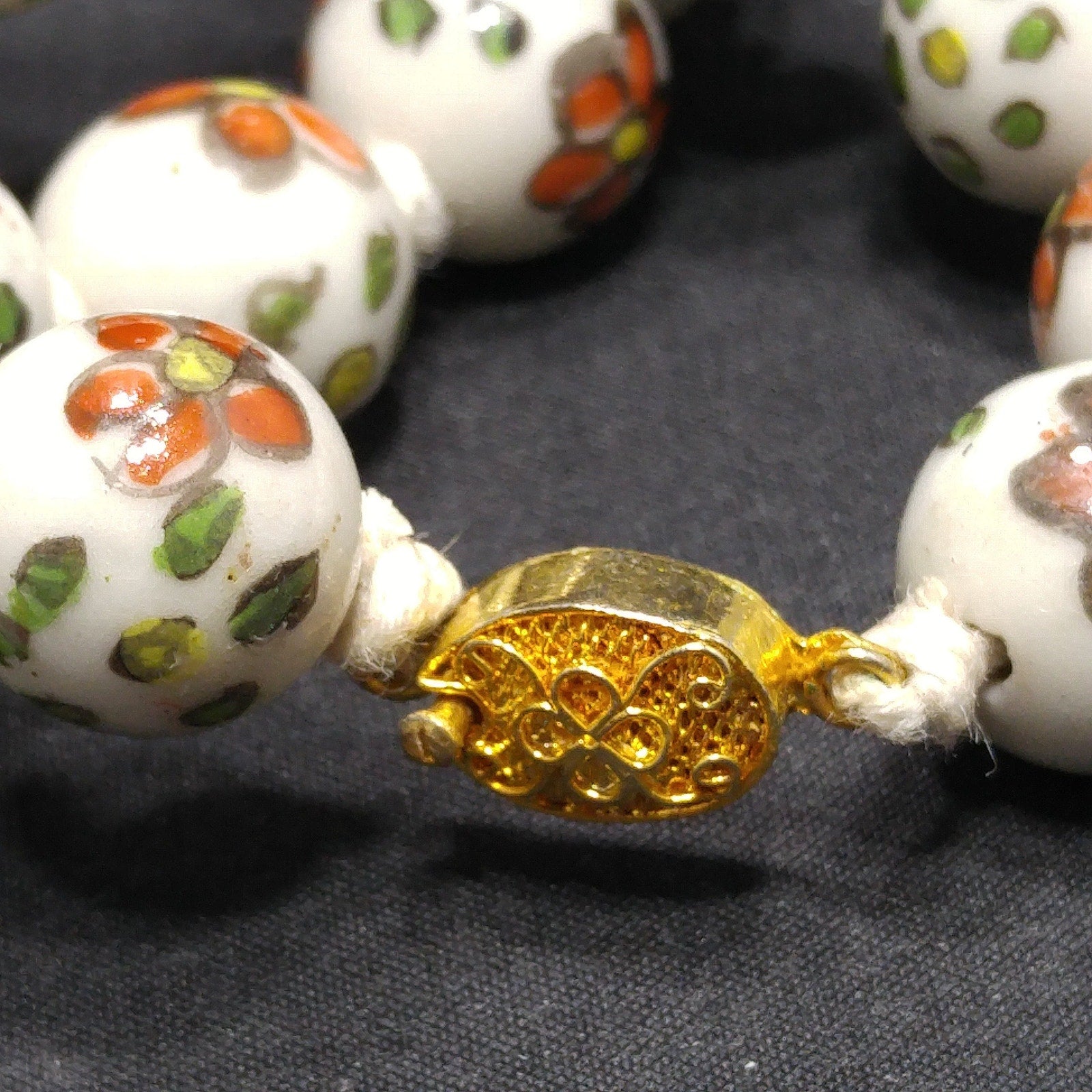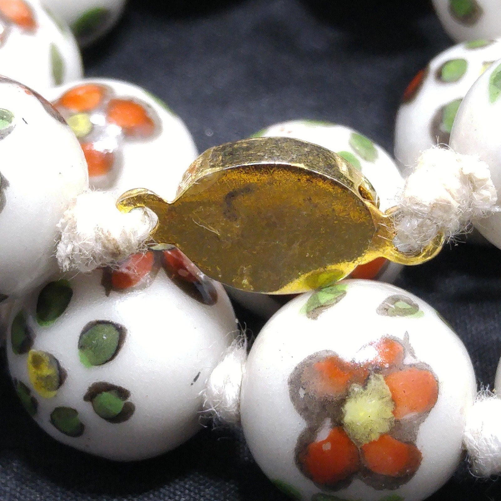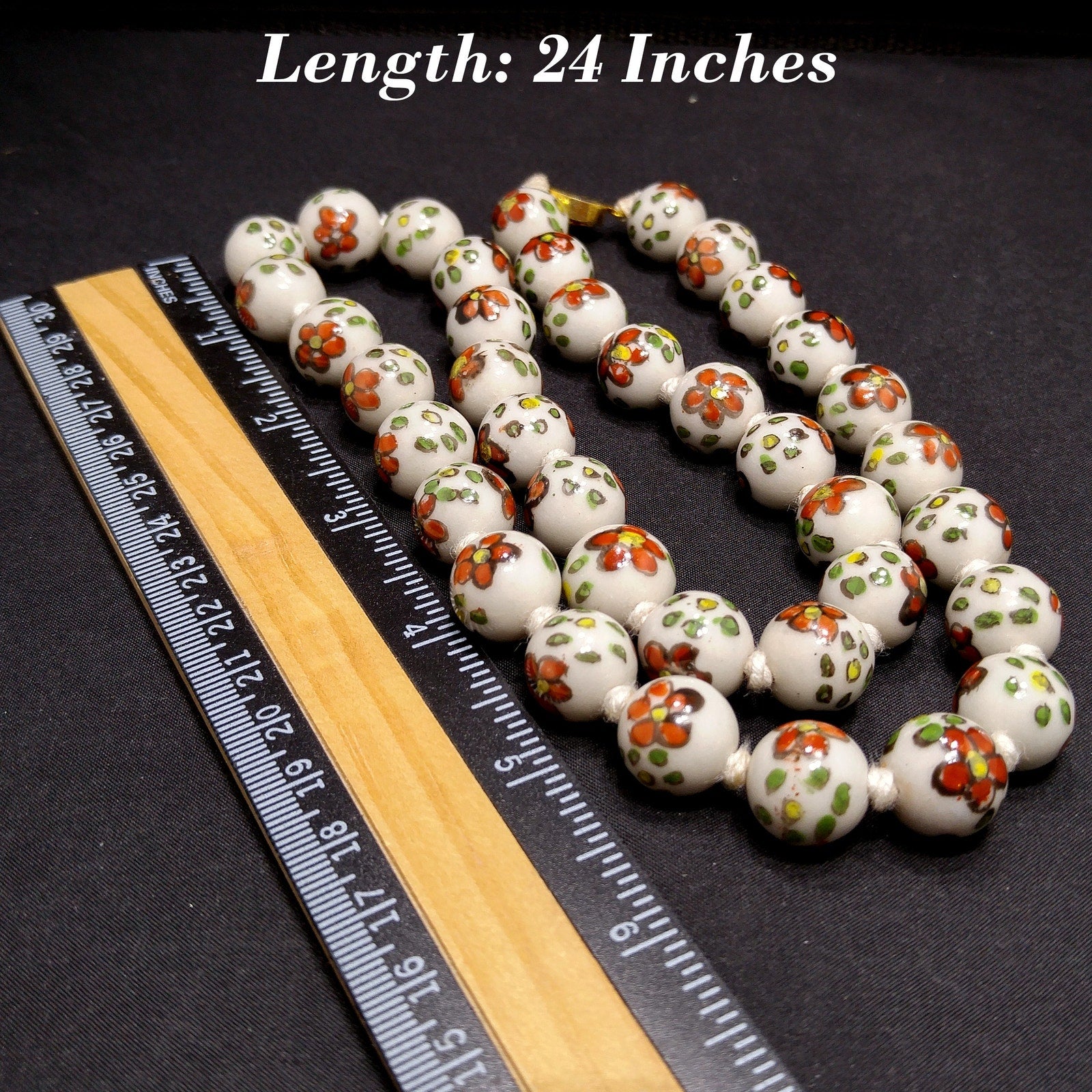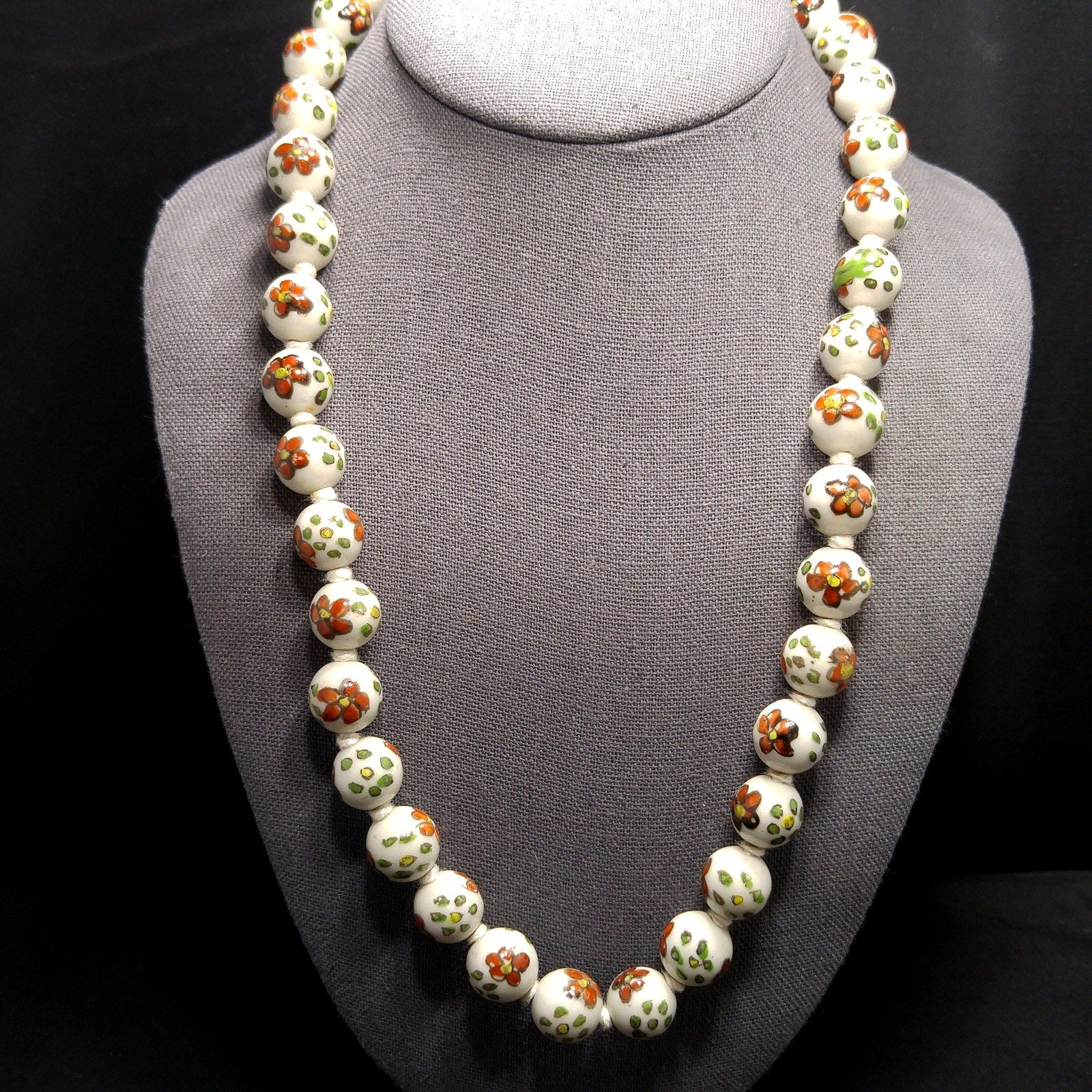 *Description: This necklace is from the 1960s and is a Chinese hand painted, hand knotted floral ceramic beaded necklace with a filigree gold tone sliding clasp. The beads are a white background with flowers of red with yellow centers and green with yellow centers. The flowers are outlined and all slightly different in design. Each round bead is 14mm and the hand knotted thread is white in color. They are a heavier necklace, weighing in at 4 ounces. This would be a great addition to your vintage jewelry collection or make a great vintage gift!