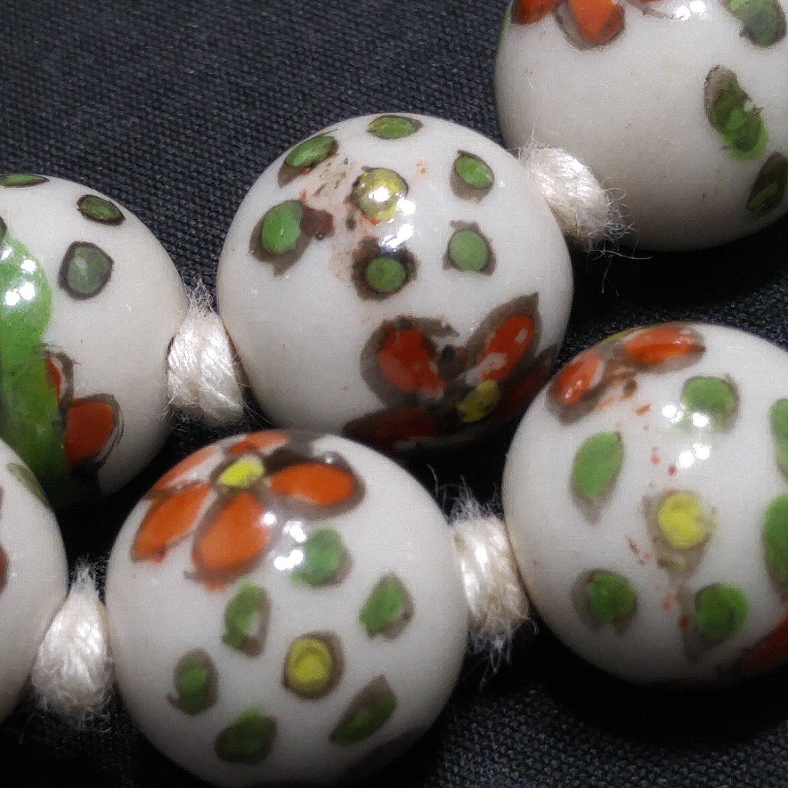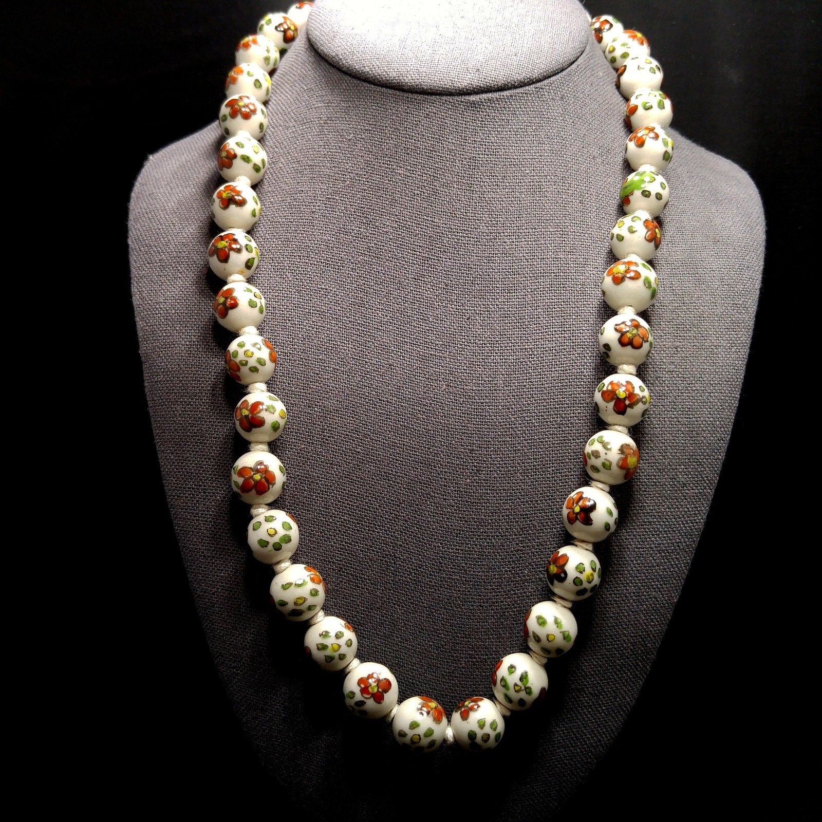 Vintage Ceramic Hand Painted Bead Necklace, Chinese Import, Hand-Knotted, 1960s