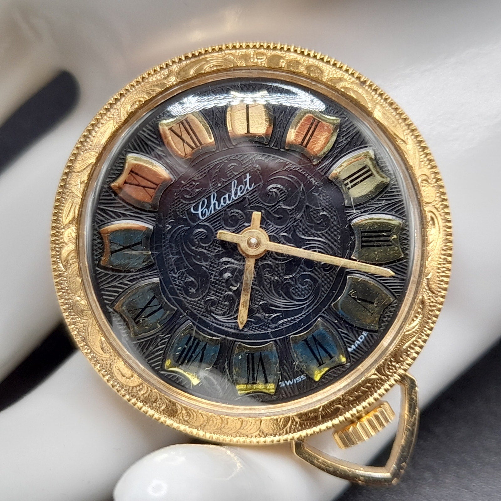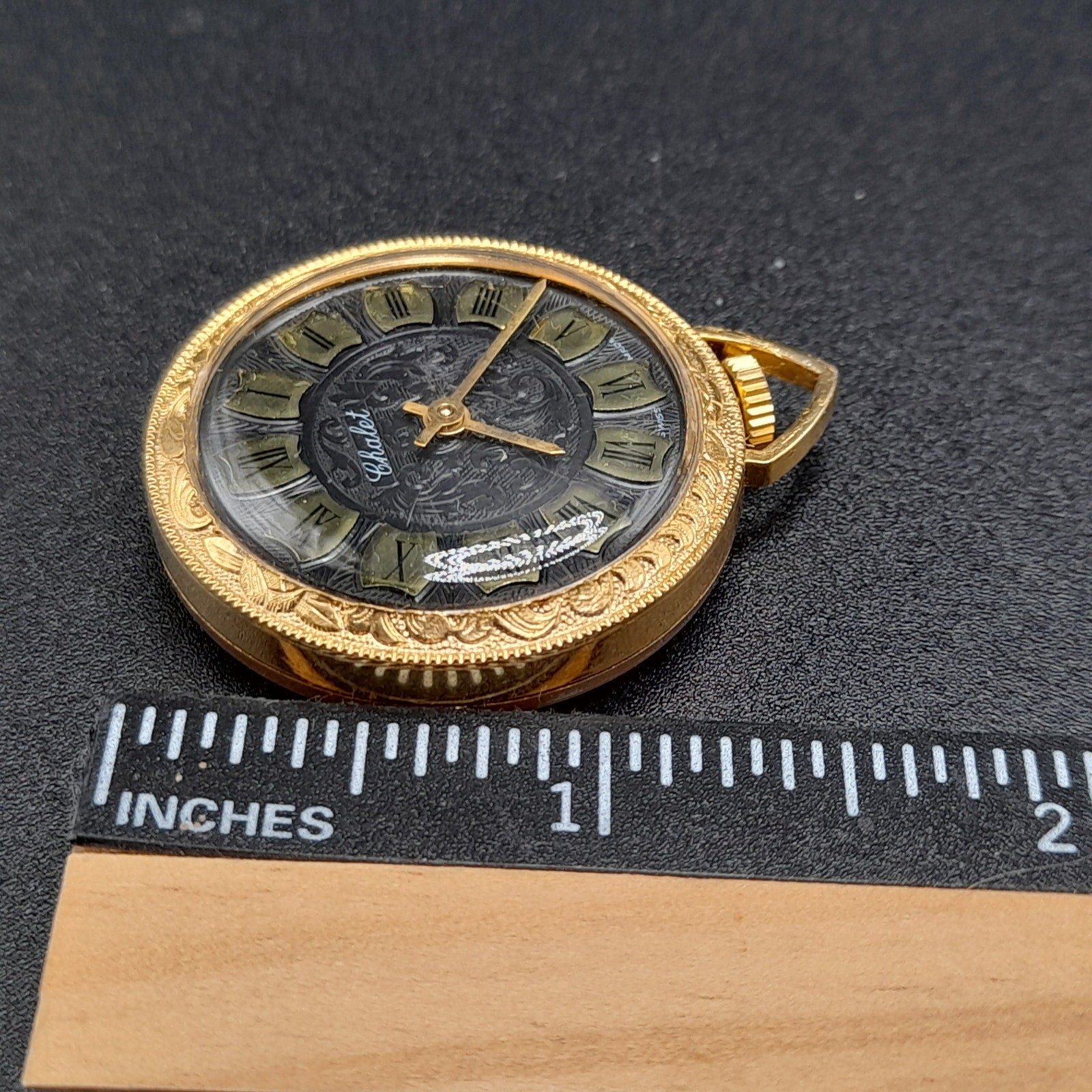 *Description: This is a vintage watch pendant by Chalet and stamped Swiss Made. The watch is a wind up and I ran it for two hours. The background is black design with Roman Numerals. There is no chain. This would be a great addition to your jewelry collection or make a great gift!