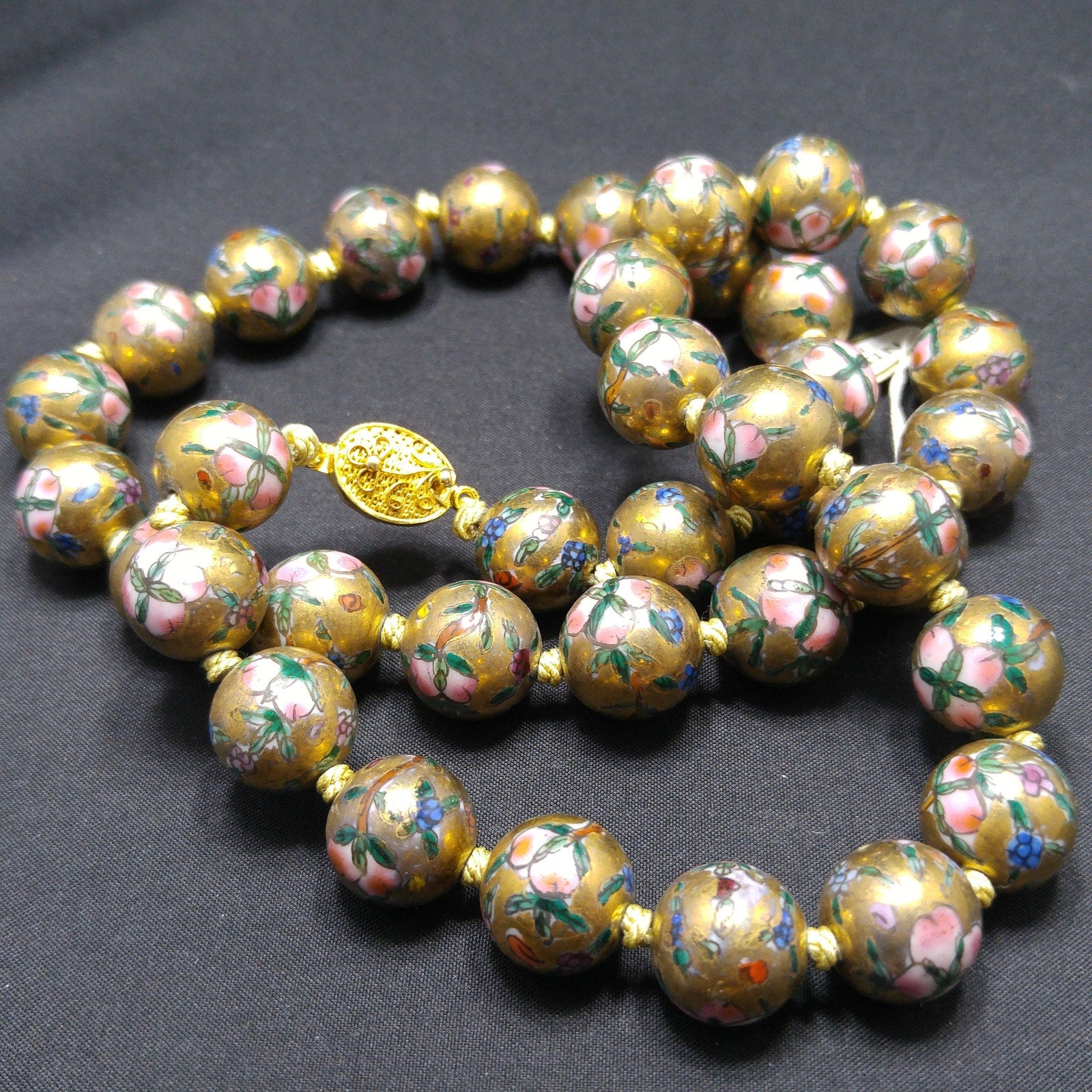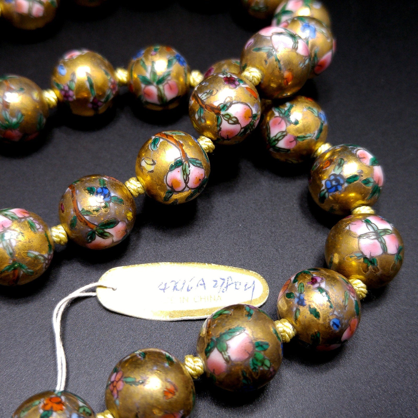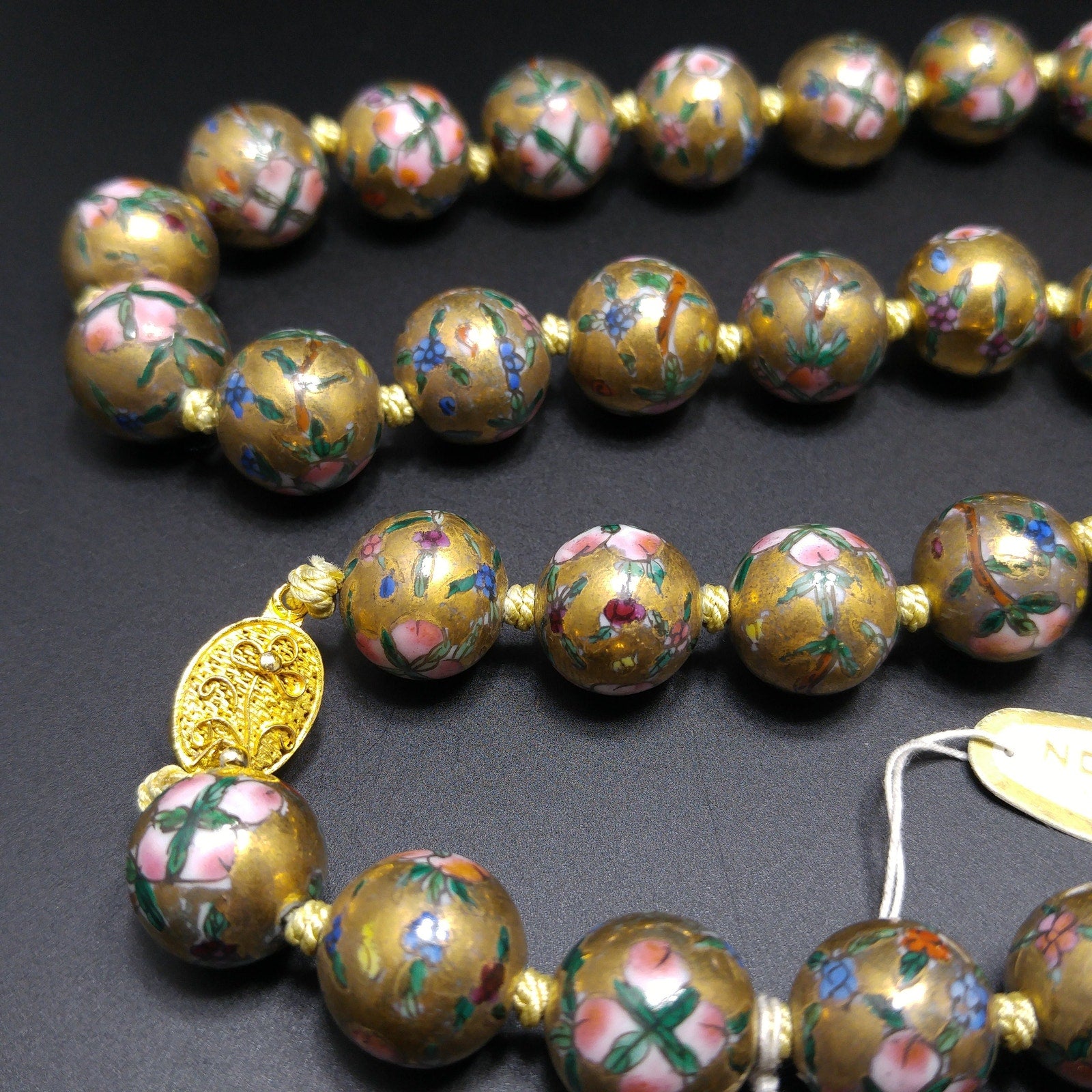 *Description: This necklace is a Chinese hand painted, hand knotted, floral beaded necklace with a filigree gold tone box clasp, with its original paper tag, from around the 1940s. The beads are a gold background with flowers in pink, green, red, and blue. Each round bead is 15mm and the hand knotted string is gold in color. It is a heavier necklace; weighing in at 4.1 ounces. The gold paint is very striking on each bead and gives the necklace a great vintage look. These Chinese handmade necklaces were imported from China in the 1940s and continued to the 1960s. This would be a great addition to your vintage jewelry collection or make a great vintage gift!