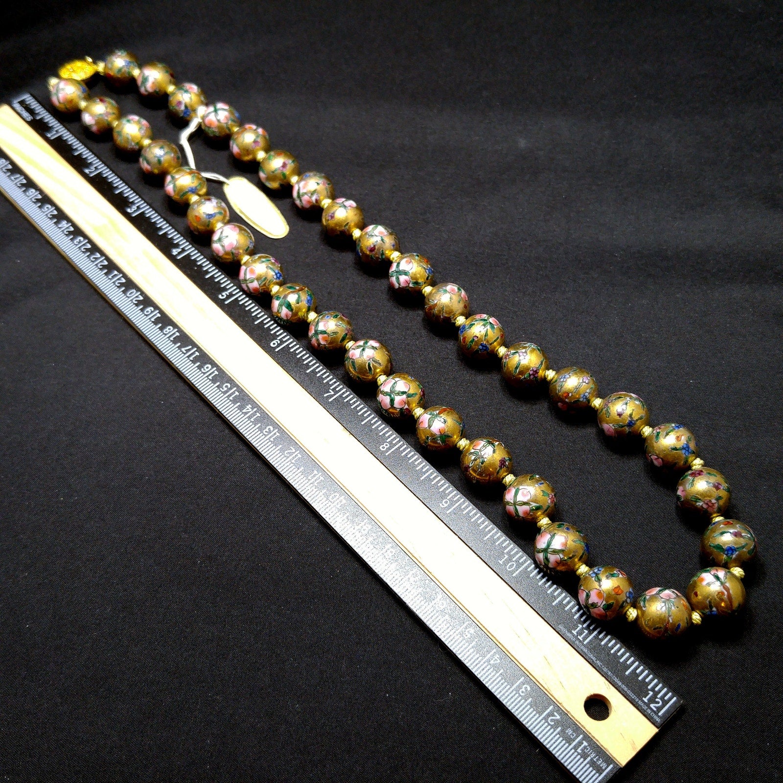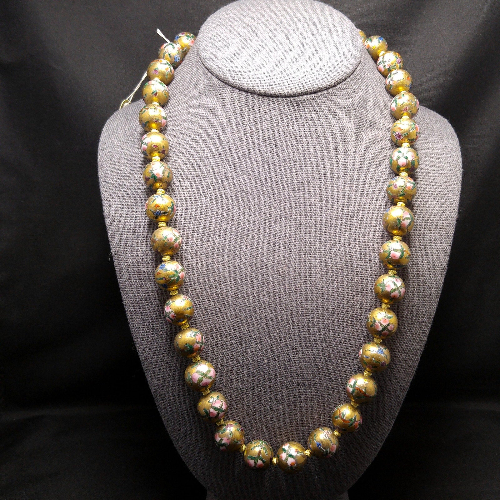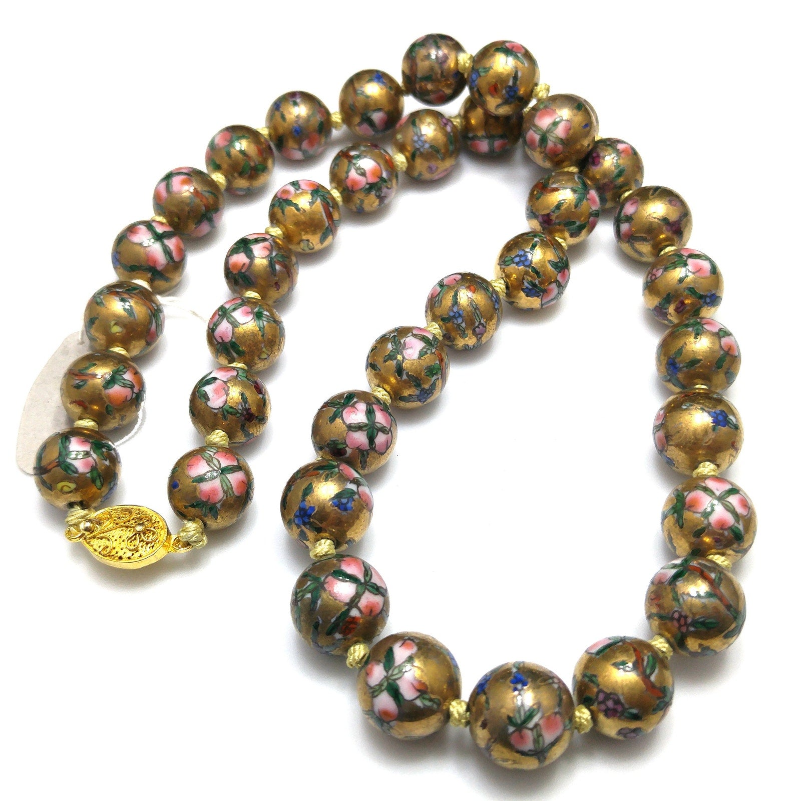 *Description: This necklace is a Chinese hand painted, hand knotted, floral beaded necklace with a filigree gold tone box clasp, with its original paper tag, from around the 1940s. The beads are a gold background with flowers in pink, green, red, and blue. Each round bead is 15mm and the hand knotted string is gold in color. It is a heavier necklace; weighing in at 4.1 ounces. The gold paint is very striking on each bead and gives the necklace a great vintage look. These Chinese handmade necklaces were imported from China in the 1940s and continued to the 1960s. This would be a great addition to your vintage jewelry collection or make a great vintage gift!