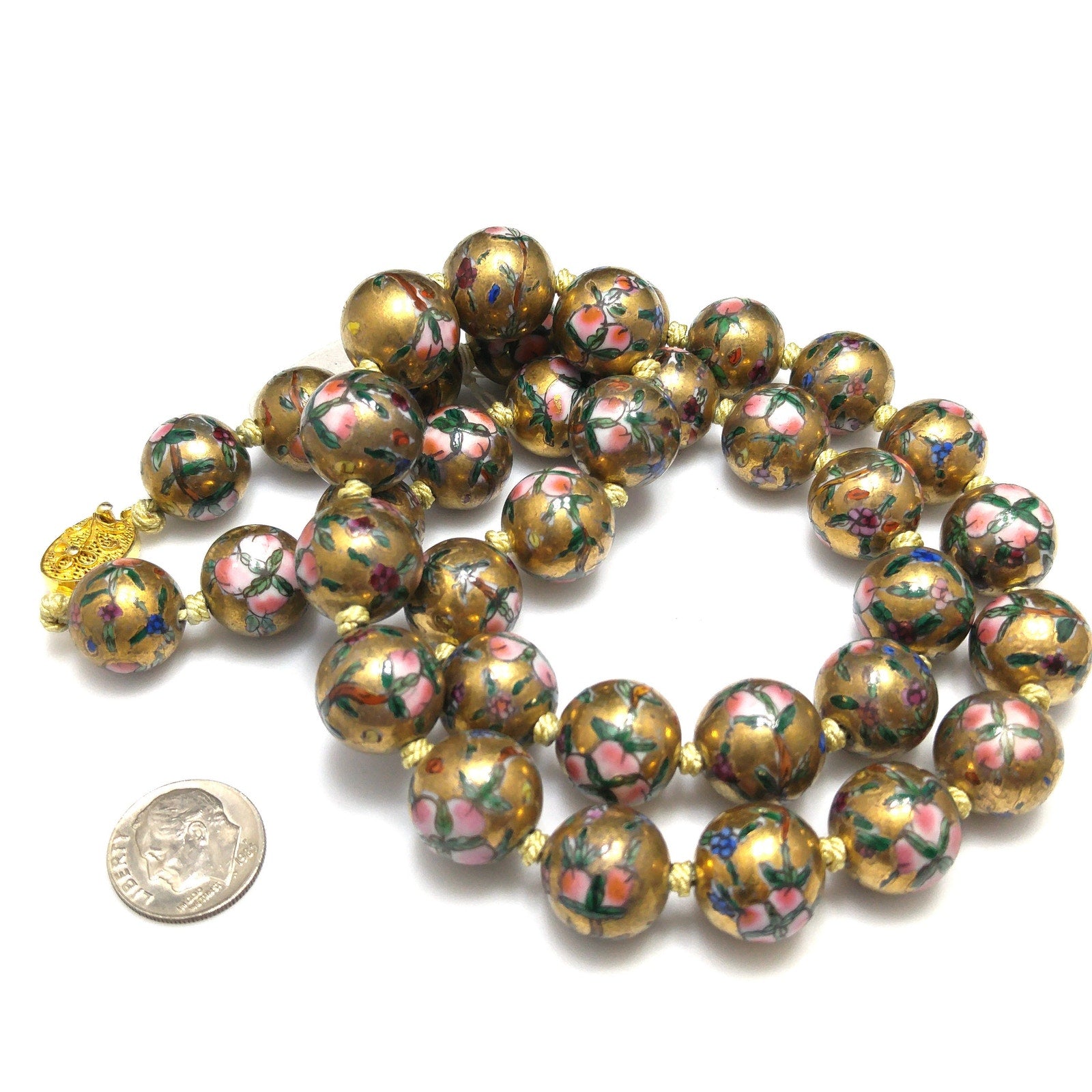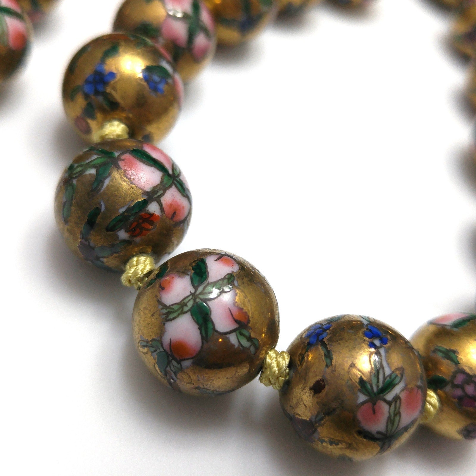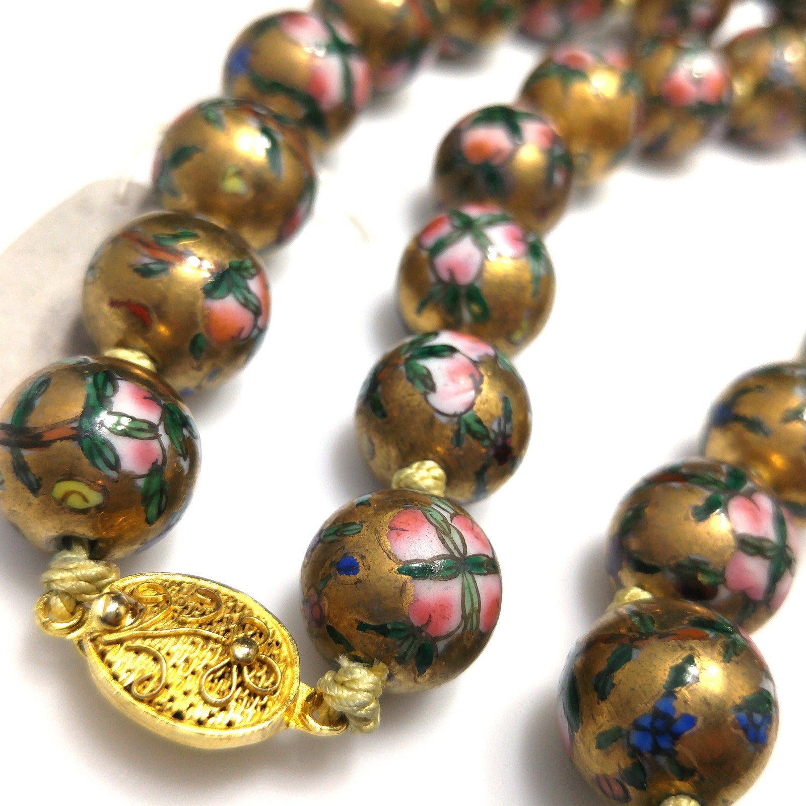 Vintage Chinese Beaded Necklace, Hand Painted & Knotted Floral Beads, 1940s Vintage Jewelry
