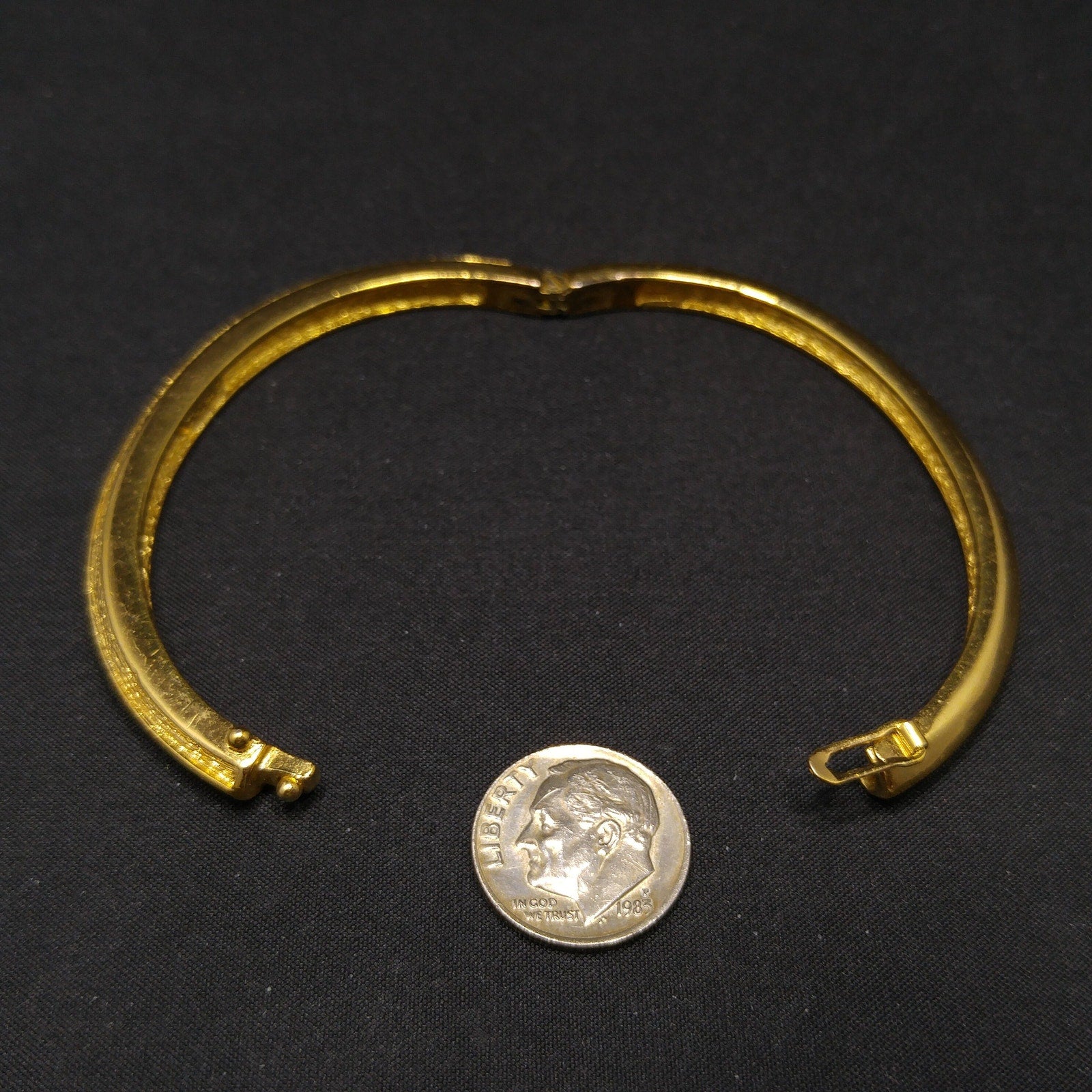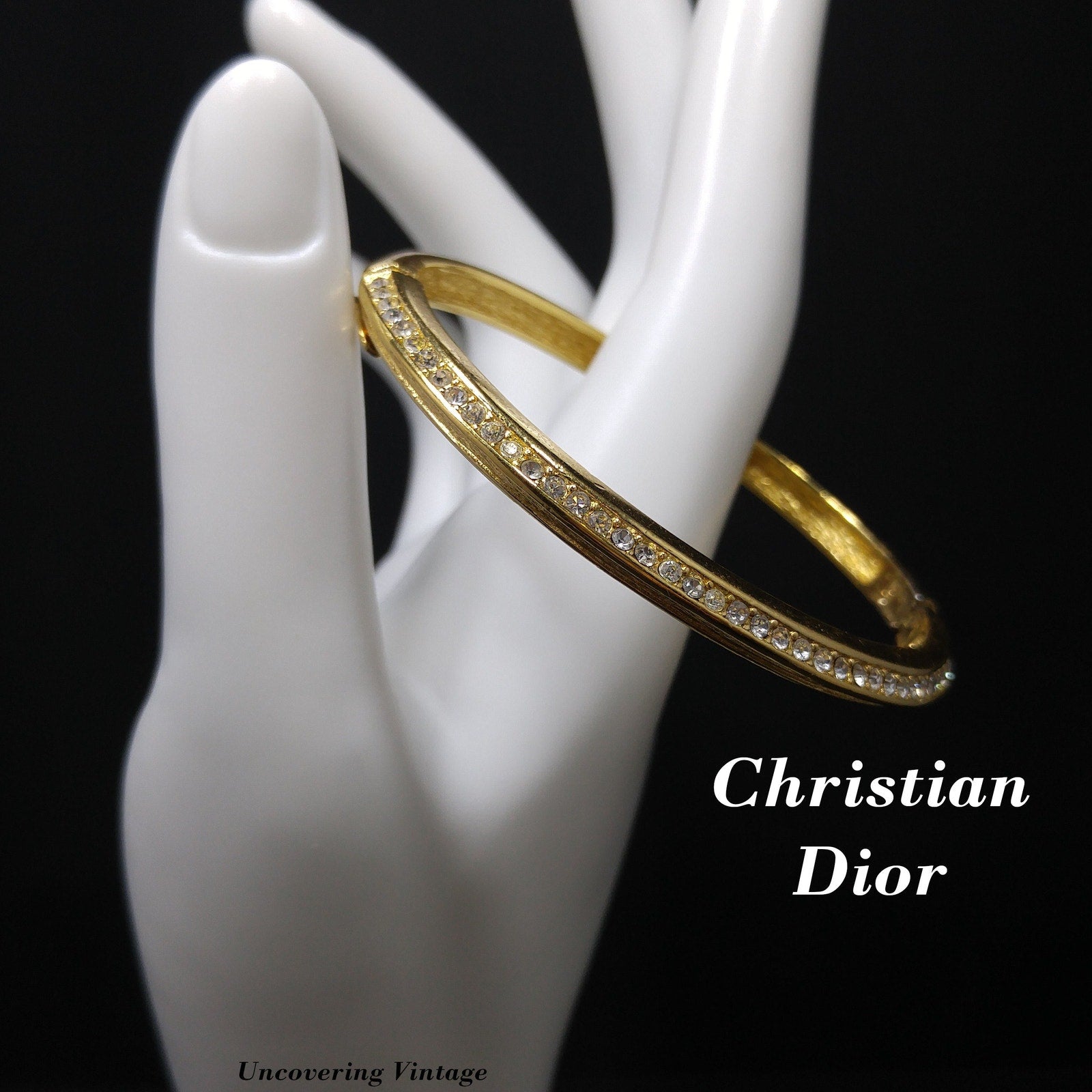 The bracelet is hinged for easy on-and-off wear and includes a secure snap clasp with safety latch for added protection. Inside, it is stamped “Chr. Dior ©”, indicating its authenticity as a genuine designer piece from Dior’s 1980s jewelry collection.