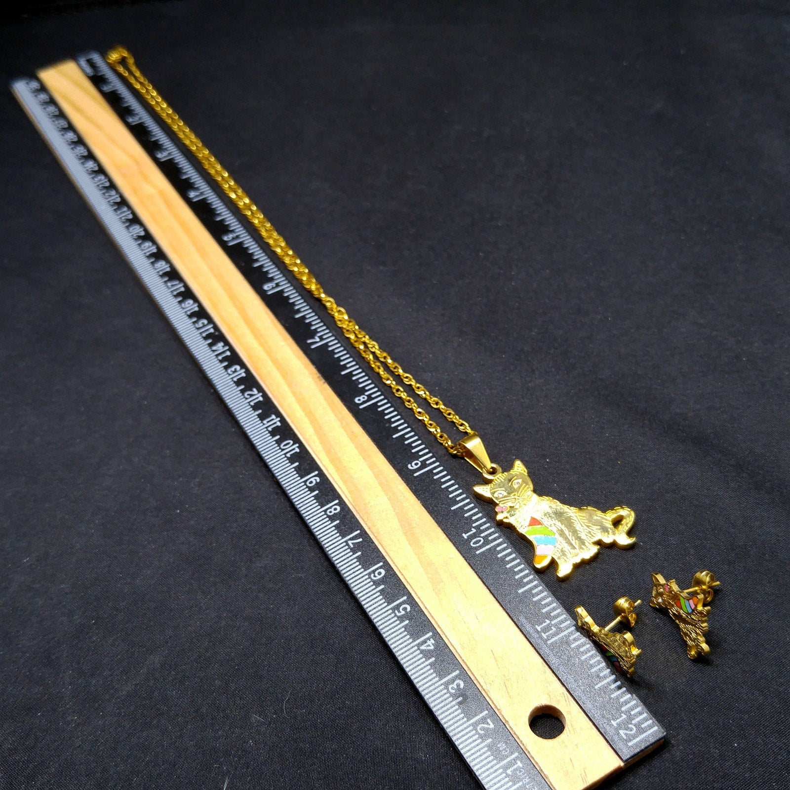 Celebrate the holiday season with this charming Christmas cat jewelry set, featuring a festive pendant necklace and matching post earrings. The necklace showcases a whimsical cat pendant decorated in holiday style, paired with coordinating cat earrings for a complete set.