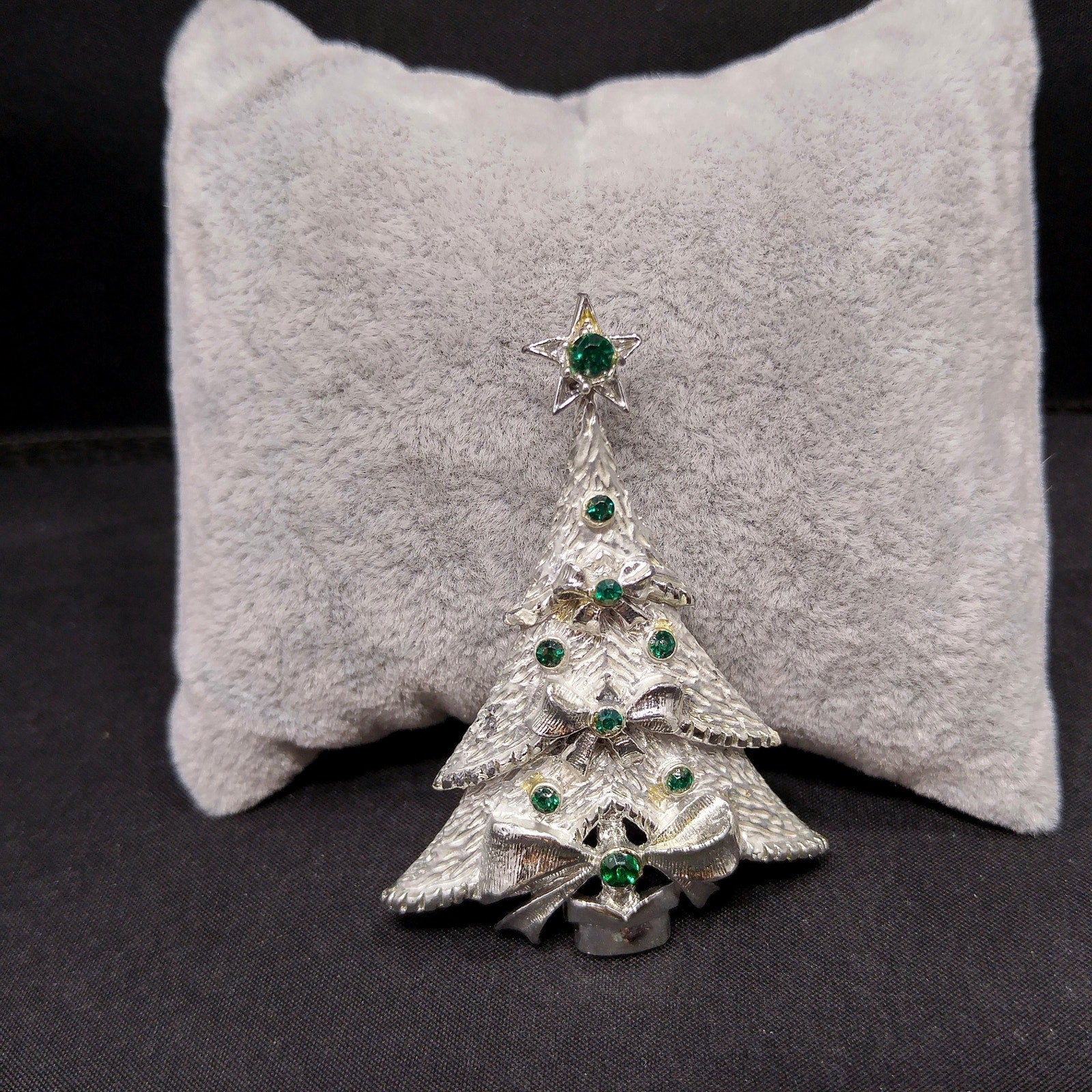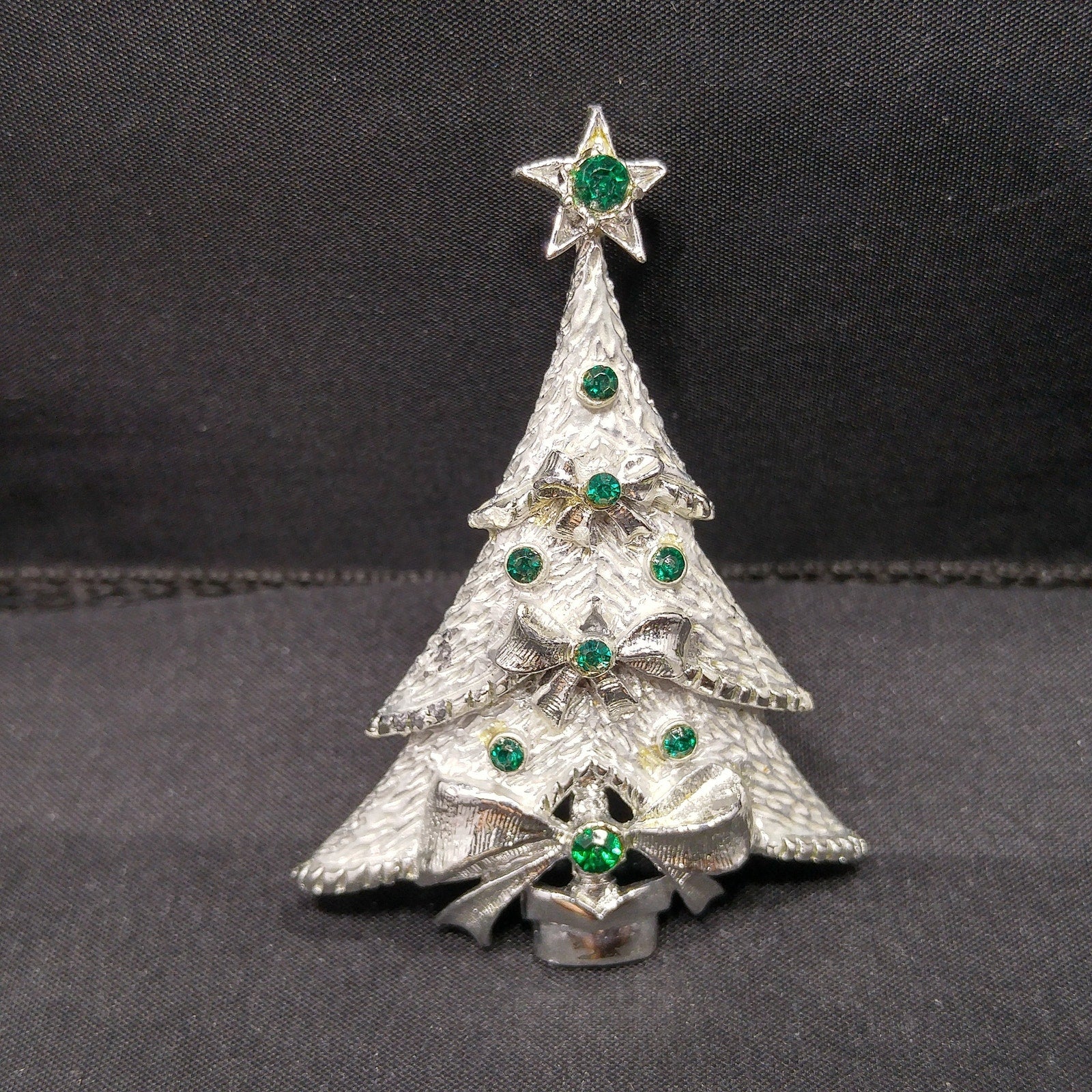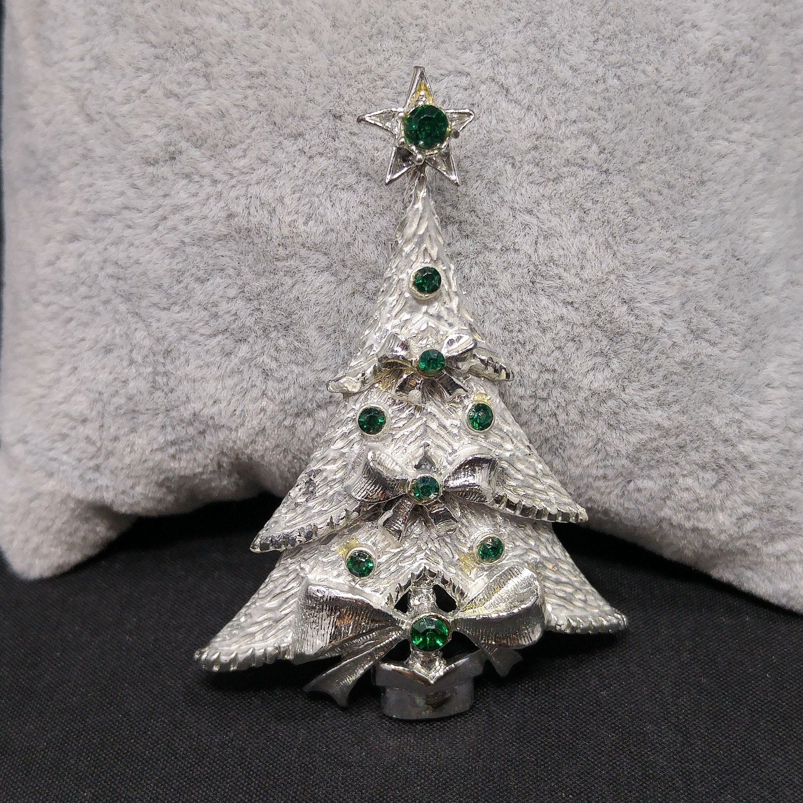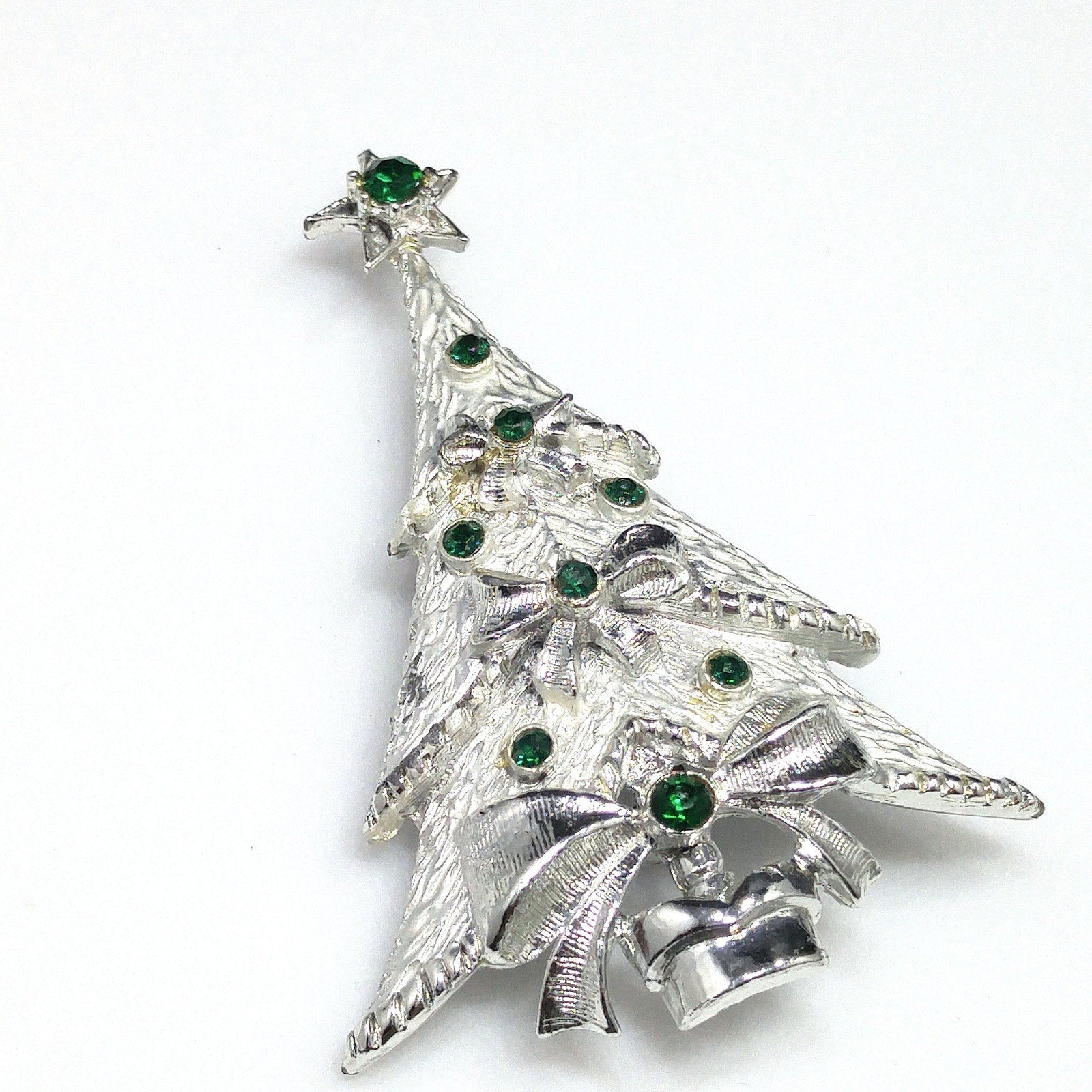 Design: Silver-tone Christmas tree with emerald green rhinestones and bow detail