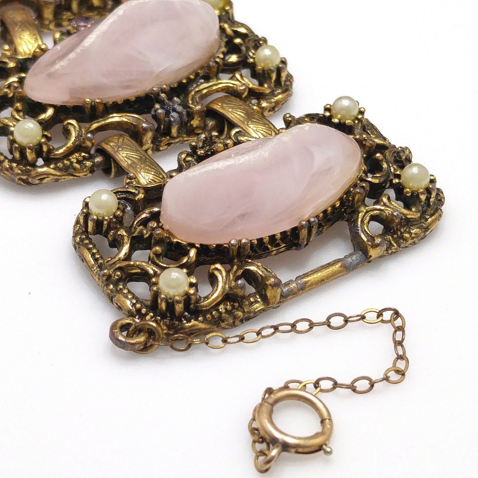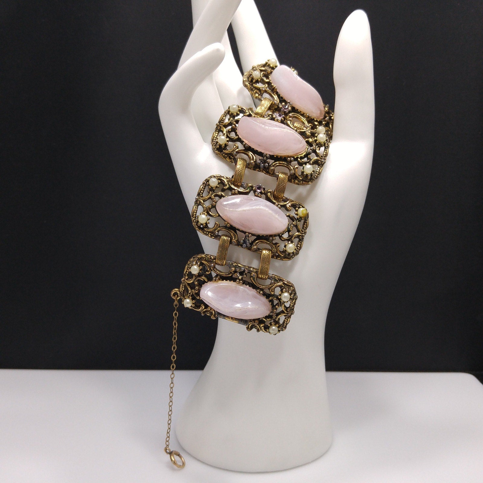 *Description: This is a chunky pink art glass link bracelet from the 1940s to 1950s. The pink glass on each link is 3/8 of an inch tall and is a variegated pink. In addition to the large 1 1/8 Inch long pink art glass on each link is also faux pearls. On some of the links there are also pink rhinestones but on a few places near the clasp, these pink rhinestones are missing. Please review photos carefully. This bracelet has a lot of wear due to age and being well loved. Also, due to the chunky weight of the bracelet, probably some of the wear was added. This bracelet is in the Selini style, however, is unsigned. This would be a great addition to your vintage jewelry collection or make a great vintage gift!