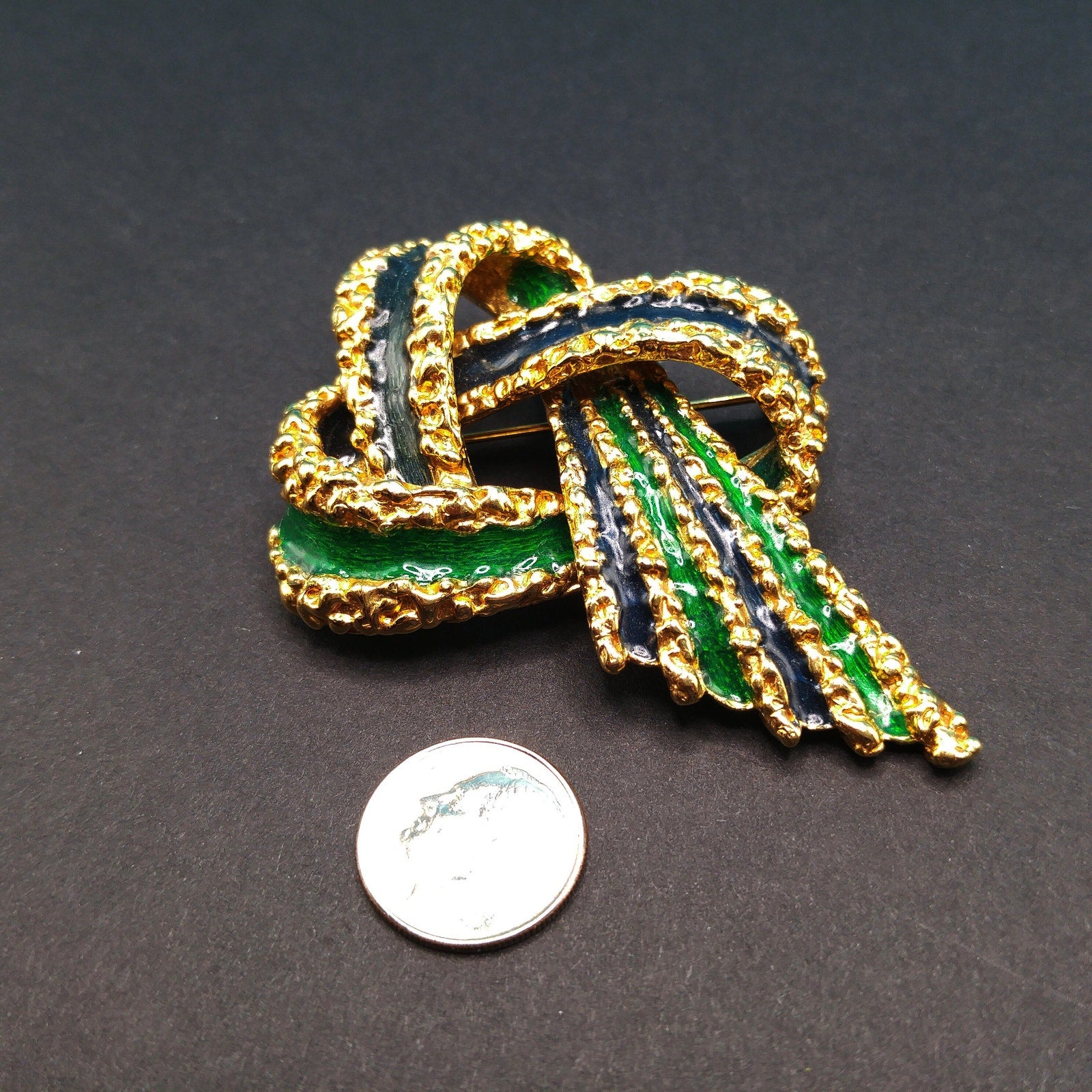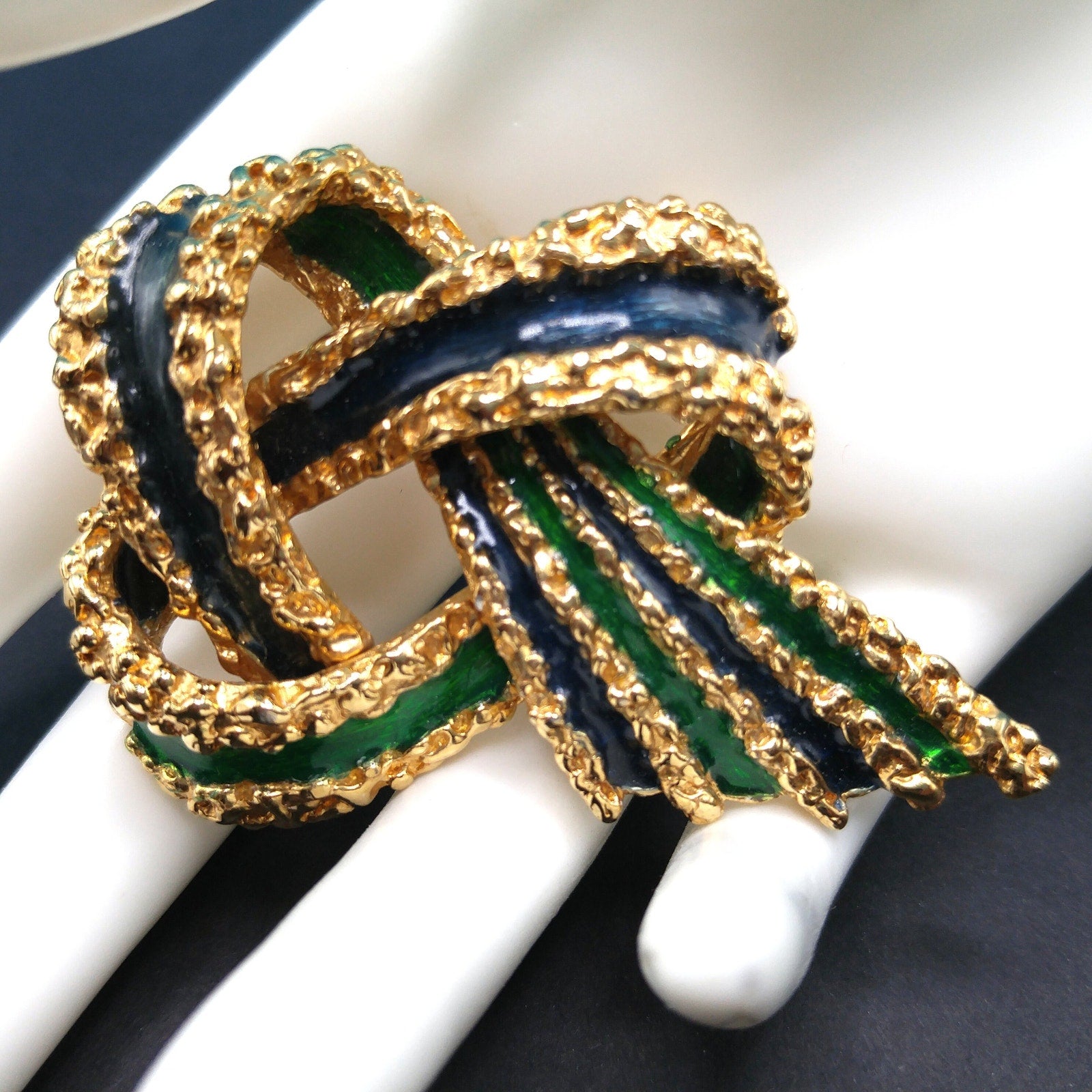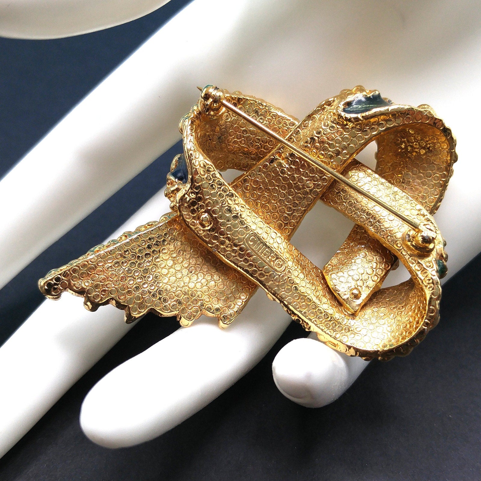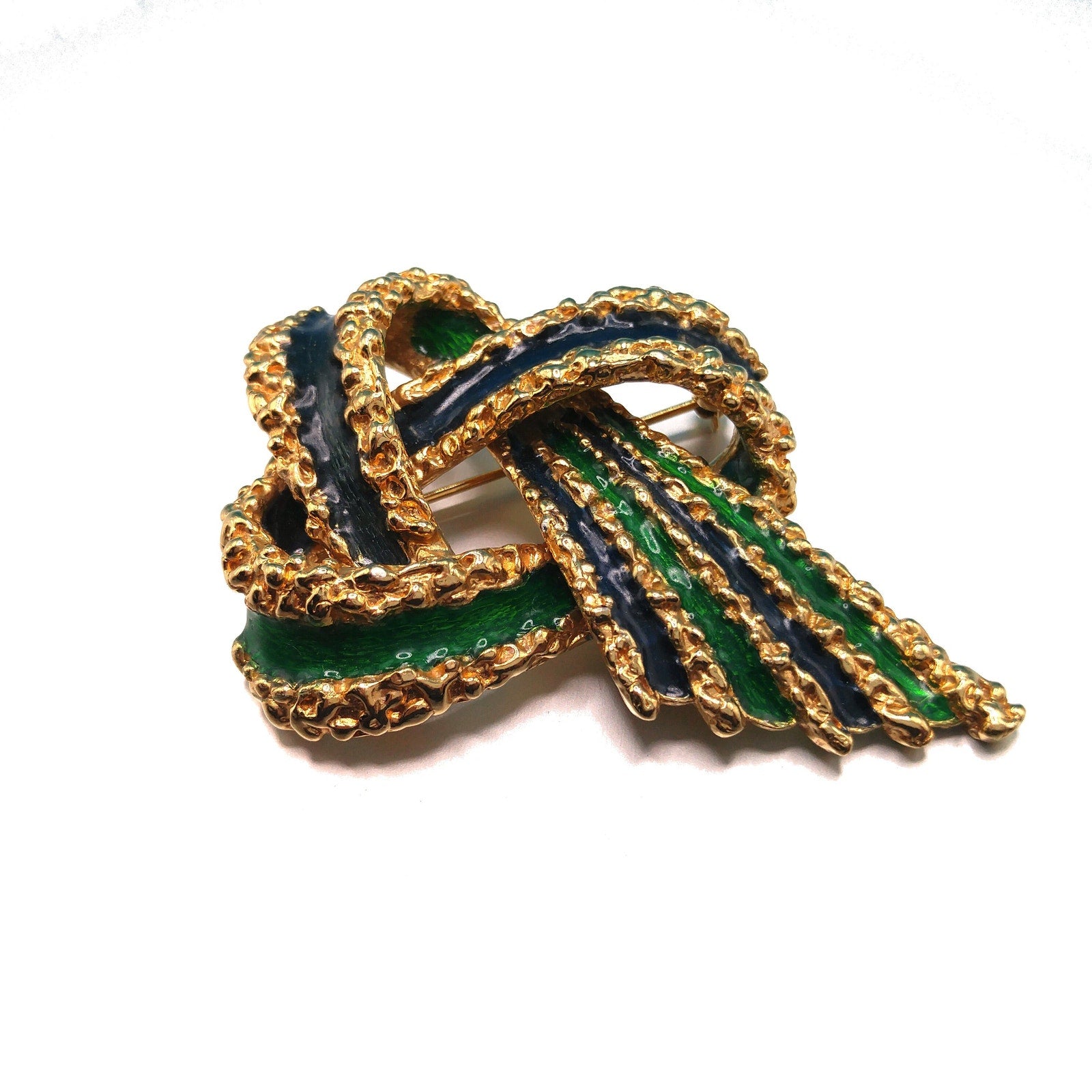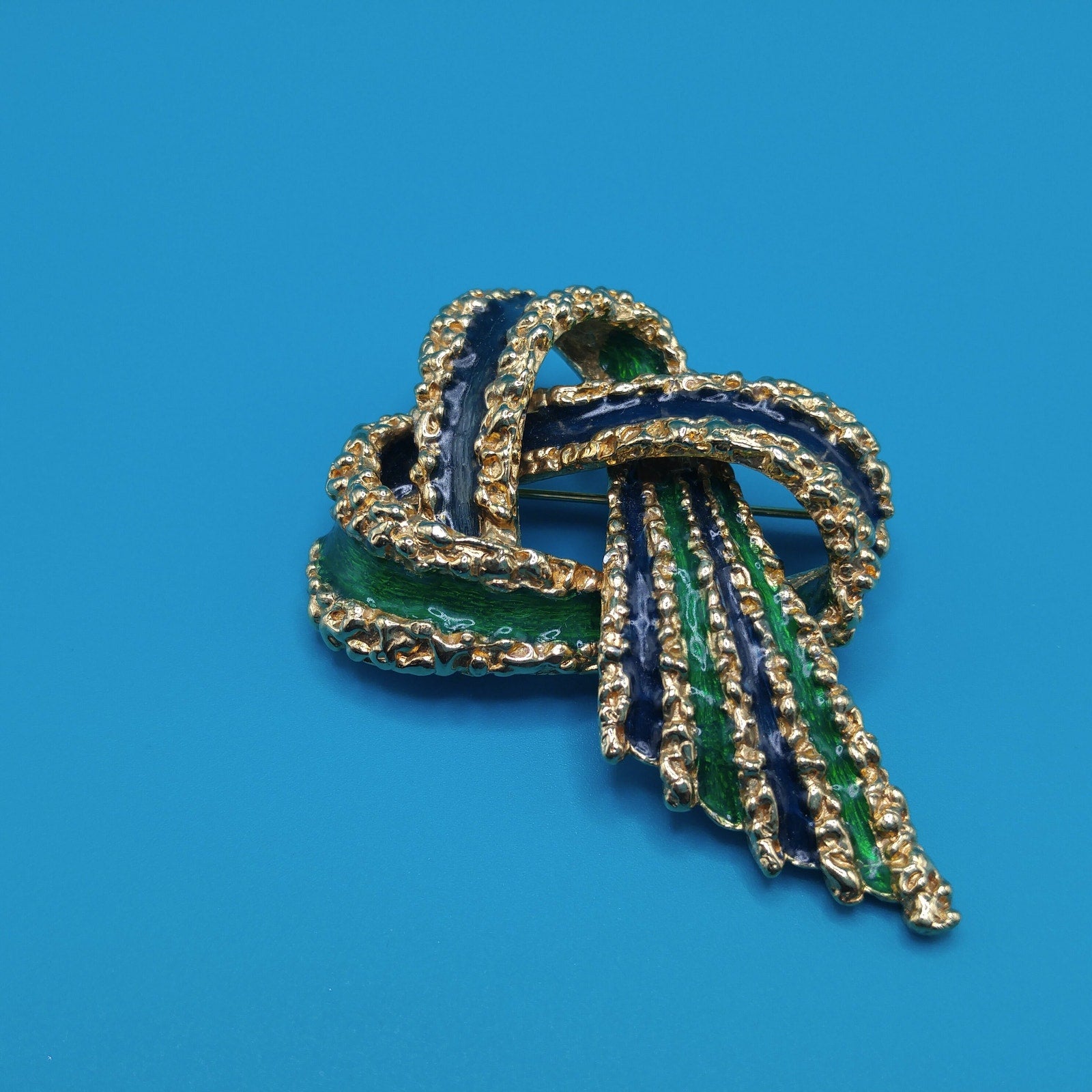 This is a beautiful vintage Ciner Brutalist-style ribbon brooch from the 1960s featuring bold navy blue and emerald green enamel with rich gold-plated textured detailing. The design showcases interlaced ribbon loops accented with intricate raised beading and dimensional curves — a hallmark of Ciner’s exceptional craftsmanship.