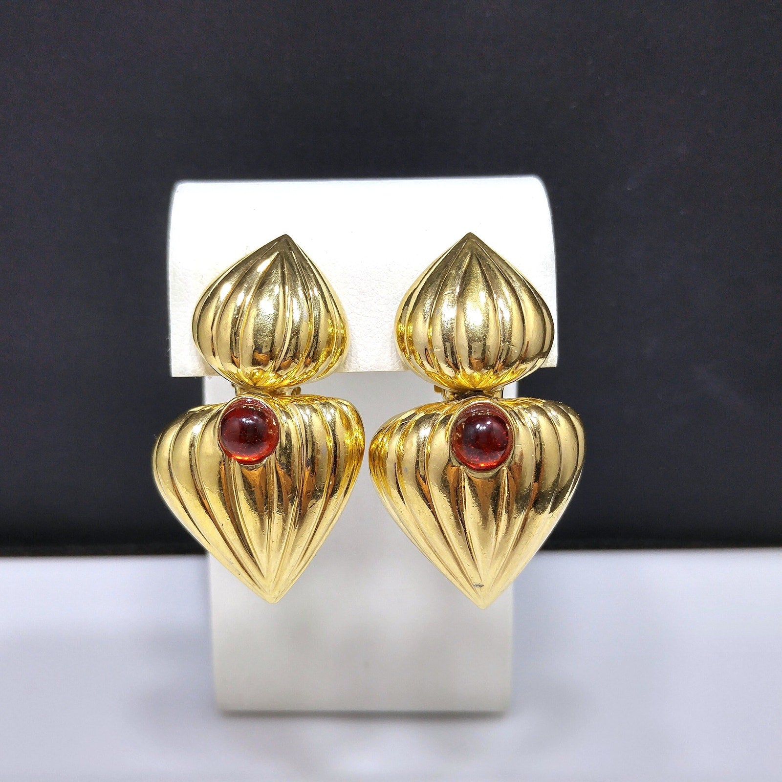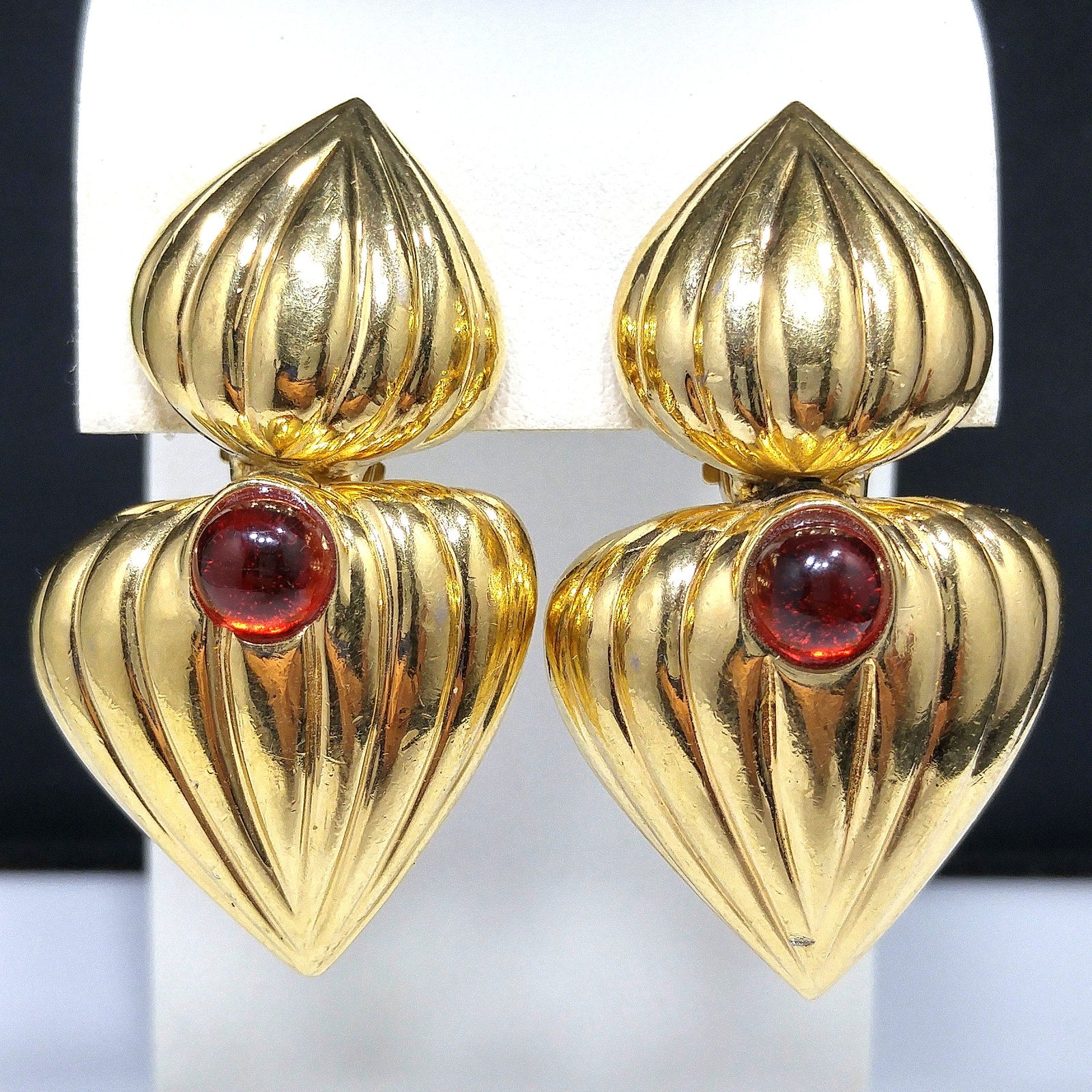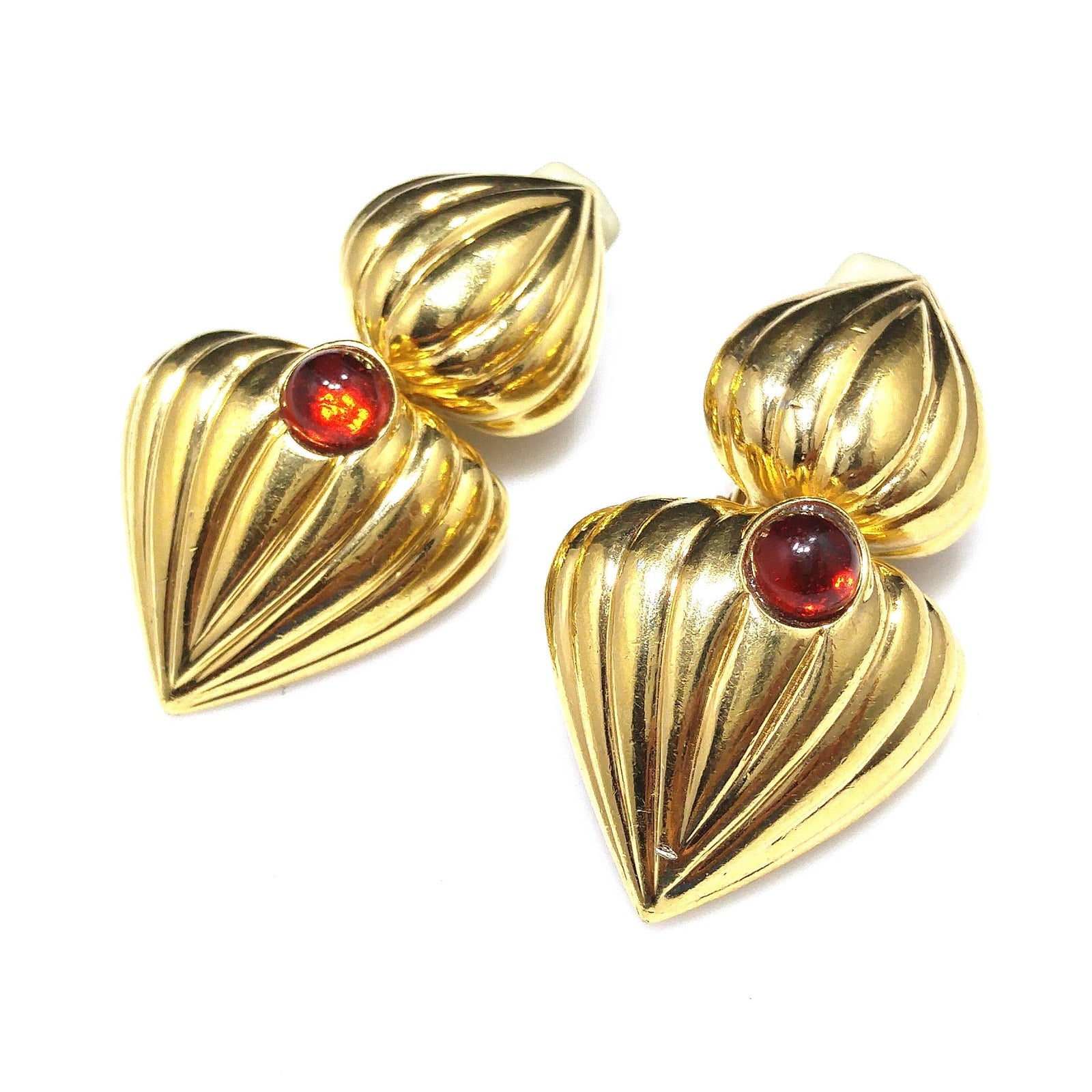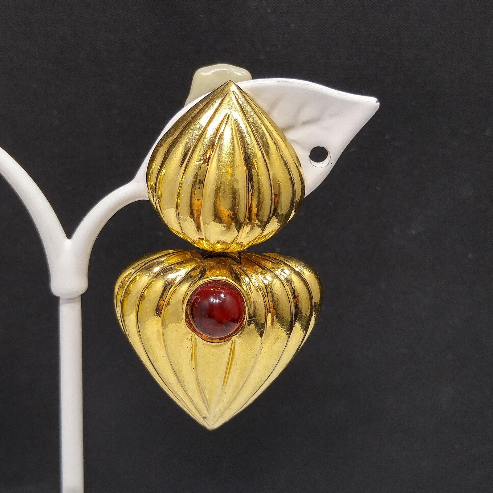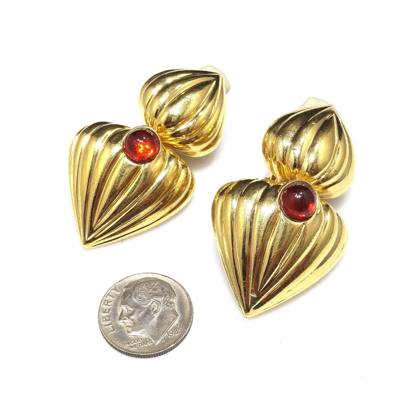 Vintage Ciner Gold Heart Drop Earrings Red Cabochon Clip On 1980s