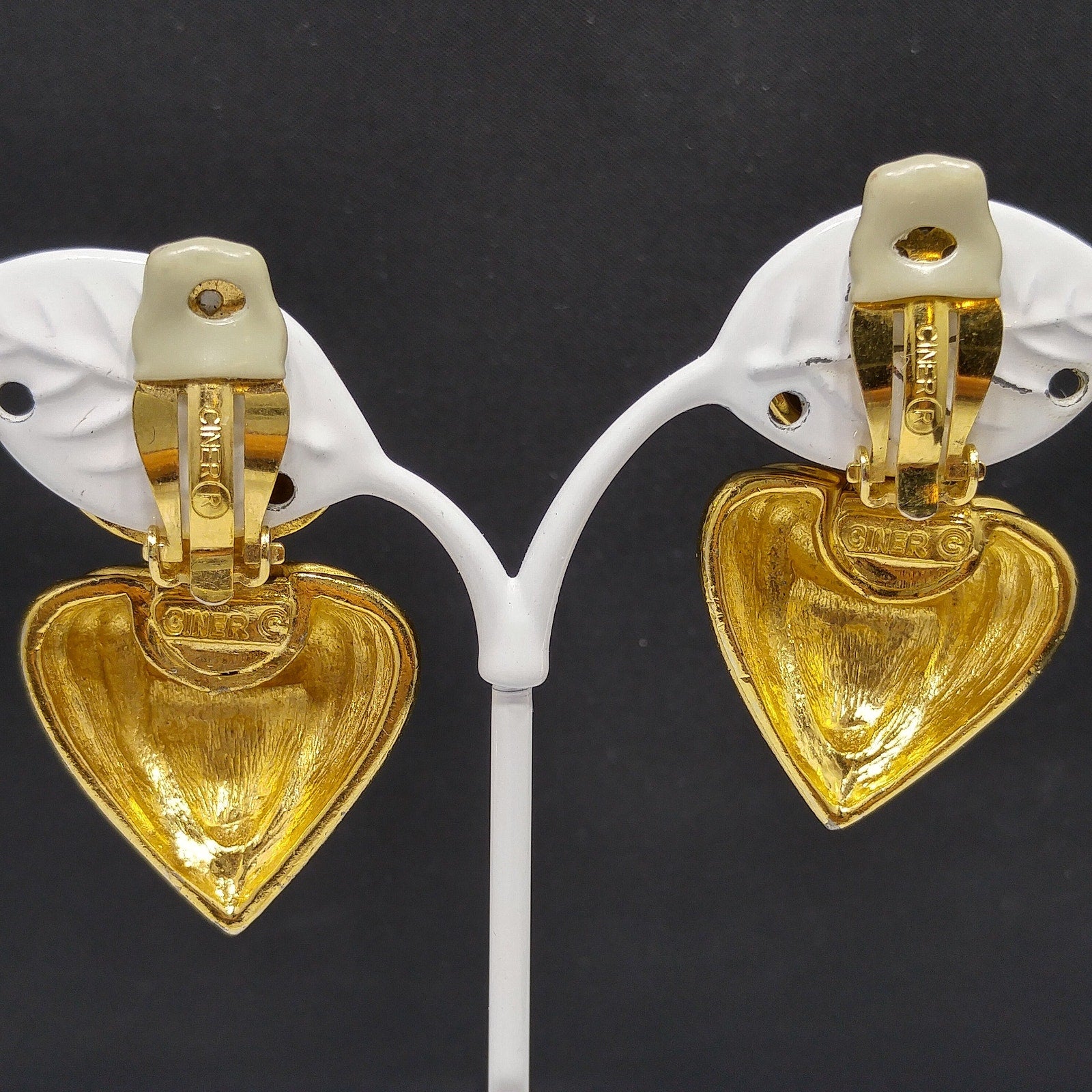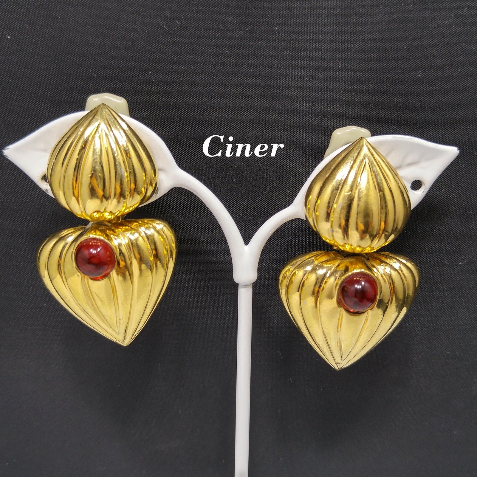 The design consists of two tiered heart shapes — the upper heart connected to a slightly larger, dangling lower heart set with a cabochon glass stone. Each earring is signed CINER © on the back, confirming its authenticity as a piece from Ciner’s highly regarded late 20th-century collection.