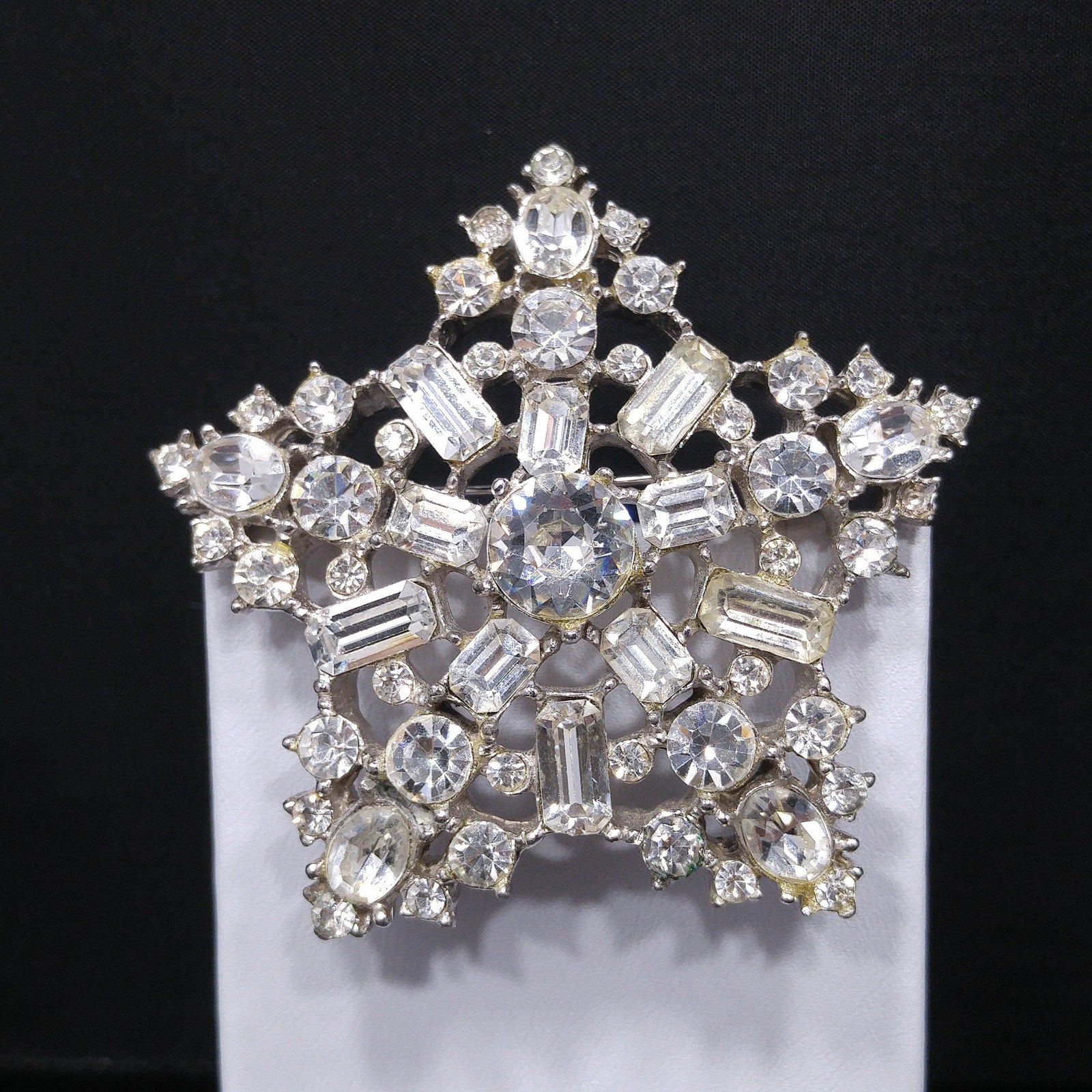Vintage Clear Rhinestone Five Star Brooch, Heavily Rhodium Plated, 1950s Vintage Jewelry