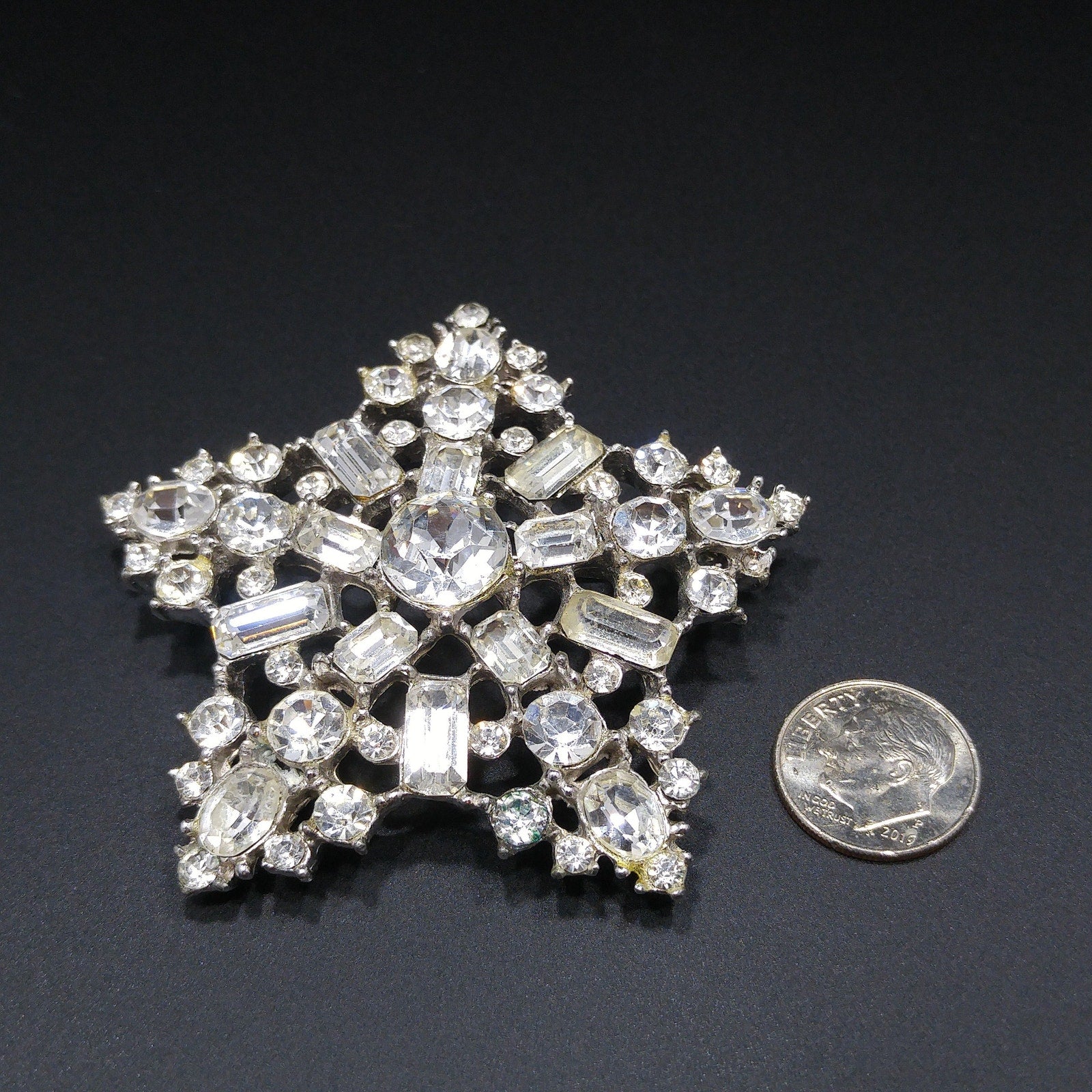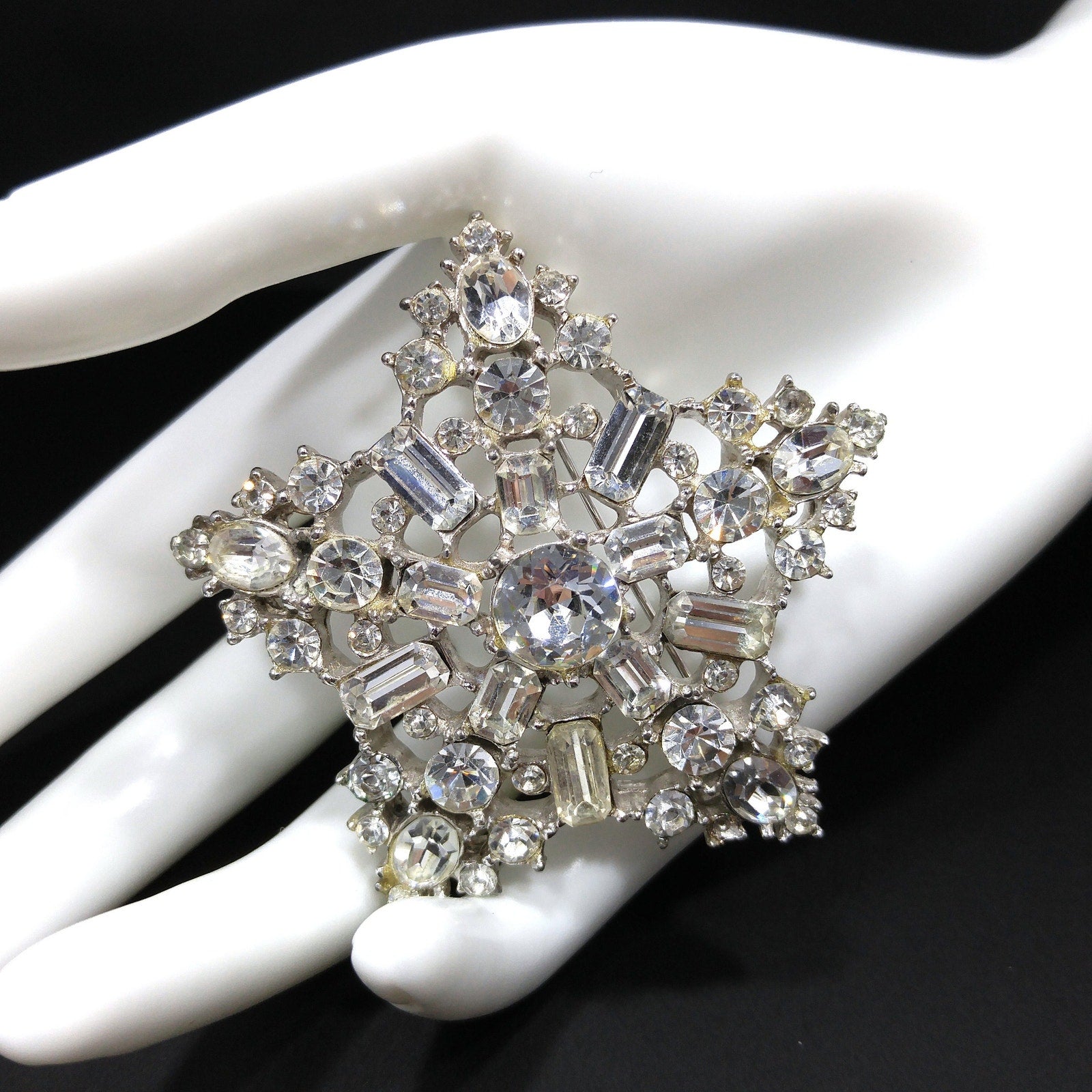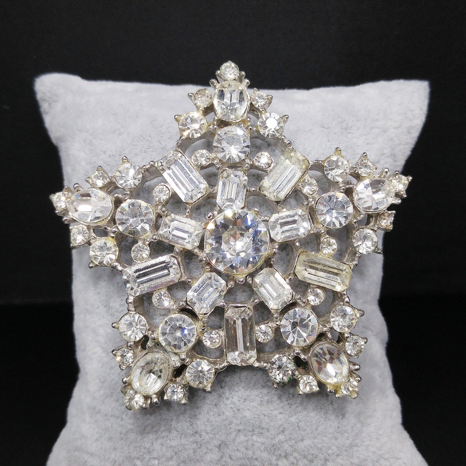 *Description: This is a very unique and beautiful brooch in the shape of a five pointed star with clear faceted rhinestones on heavily rhodium plate from the early 1950s or late 1940s. There is a variety of rhinestones in emerald, chaton, and oval cuts. The back is plated and the center rhinestone shows through the open back with a gold foil backing. It is a beautiful designer unsigned brooch. This would be perfect for a wedding or any formal event. This would be a great addition to your vintage jewelry collection or make a great vintage gift!