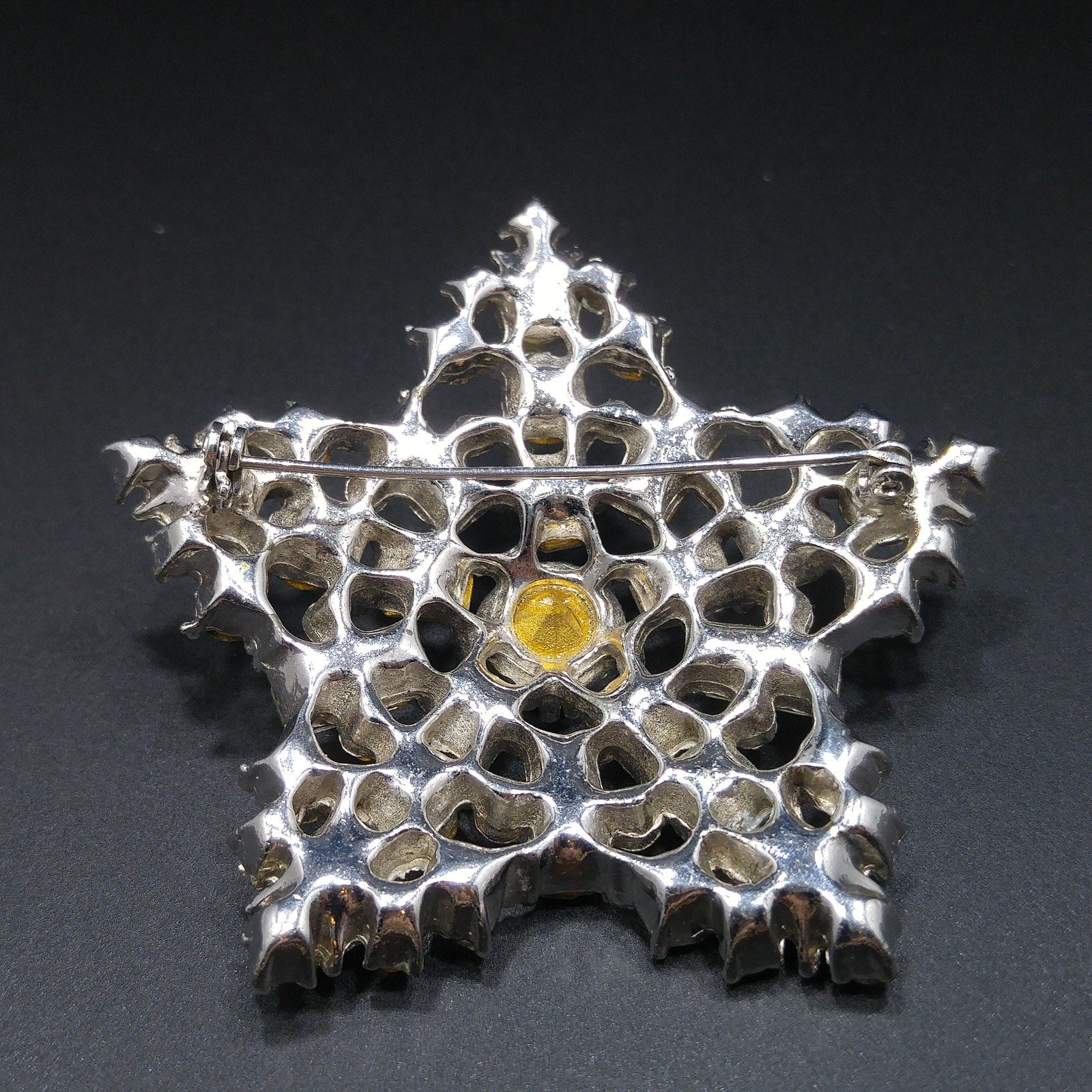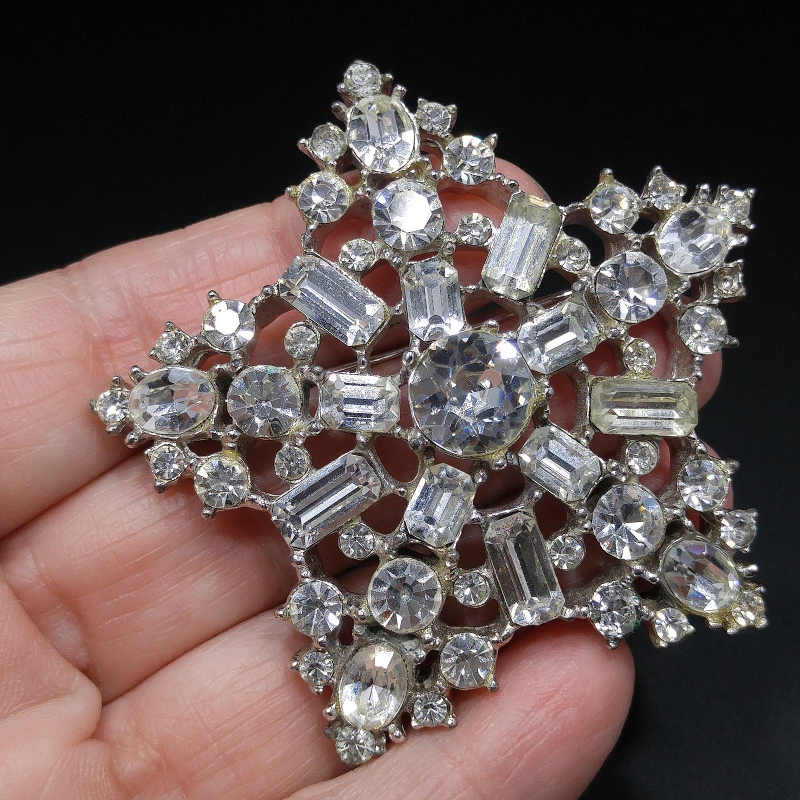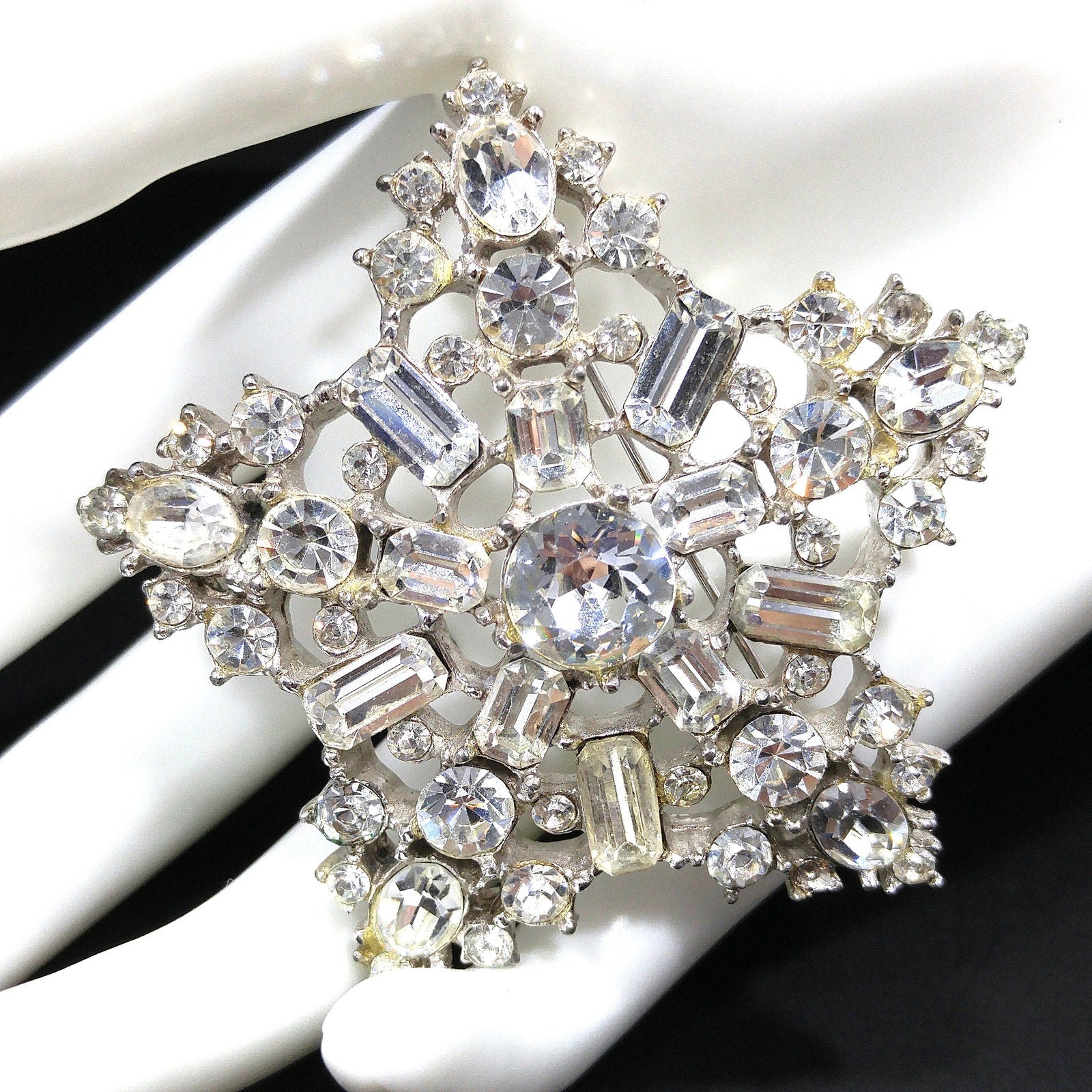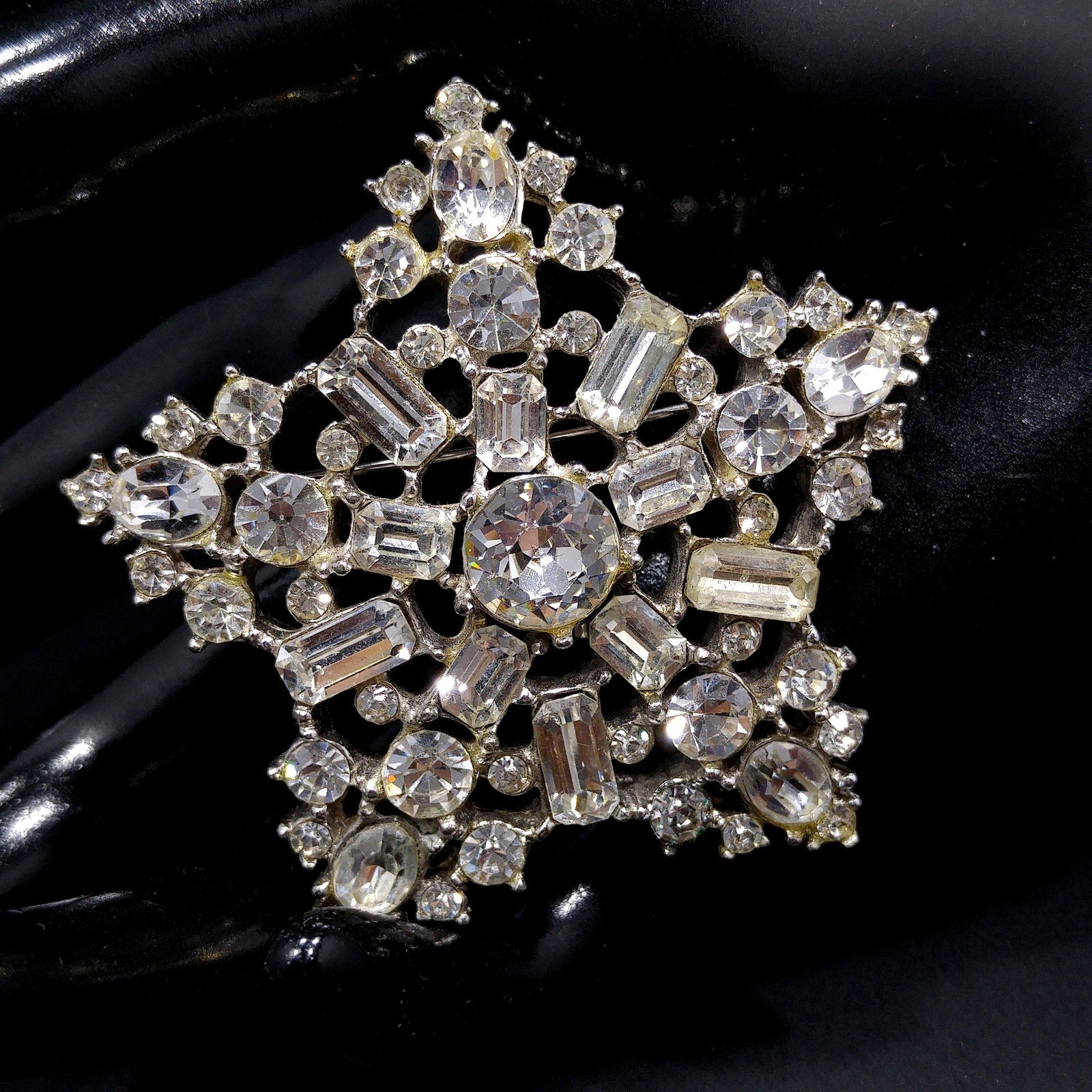 *Description: This is a very unique and beautiful brooch in the shape of a five pointed star with clear faceted rhinestones on heavily rhodium plate from the early 1950s or late 1940s. There is a variety of rhinestones in emerald, chaton, and oval cuts. The back is plated and the center rhinestone shows through the open back with a gold foil backing. It is a beautiful designer unsigned brooch. This would be perfect for a wedding or any formal event. This would be a great addition to your vintage jewelry collection or make a great vintage gift!
