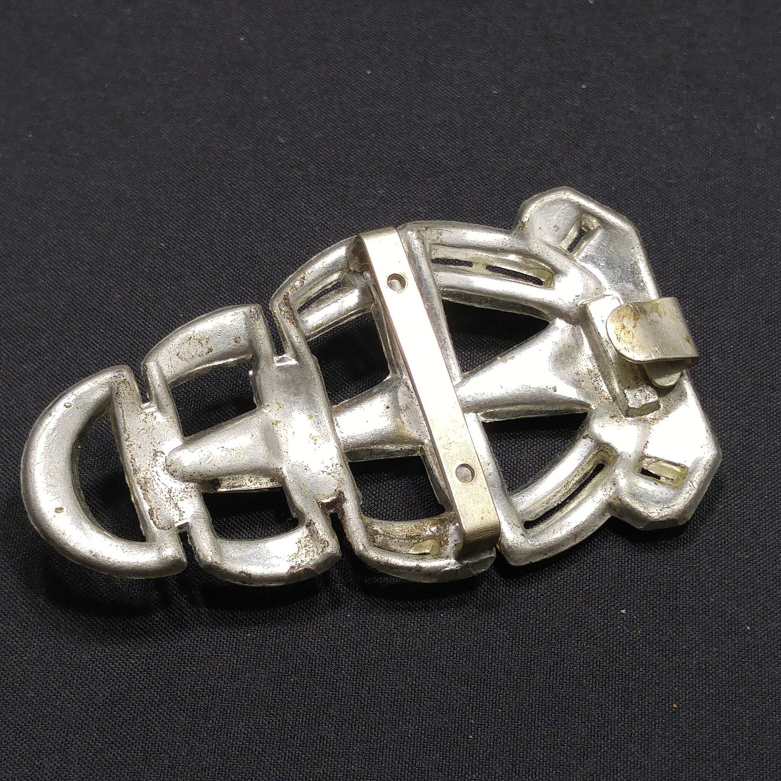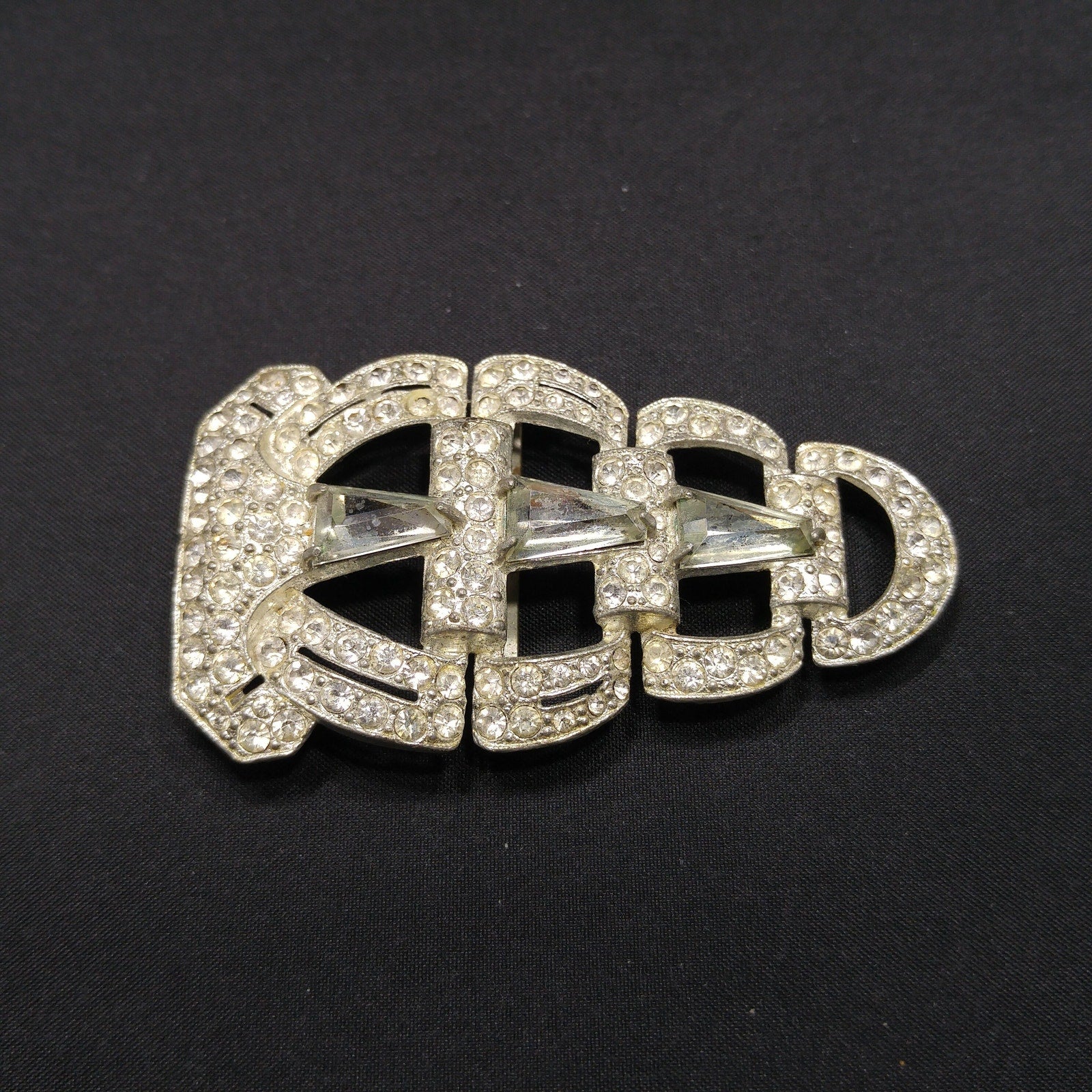 *Description: This is a beautiful clear rhinestone belt buckle with pot metal backing from the 1930s. The buckle has four sections and in the center are three faceted triangular clear rhinestones. All of the clear chaton cut rhinestones are in place. The pot metal is silver in color. This would be a great vintage buckle to add to your favorite outfit. It would be a great addition to your vintage jewelry collection or make a great vintage gift!