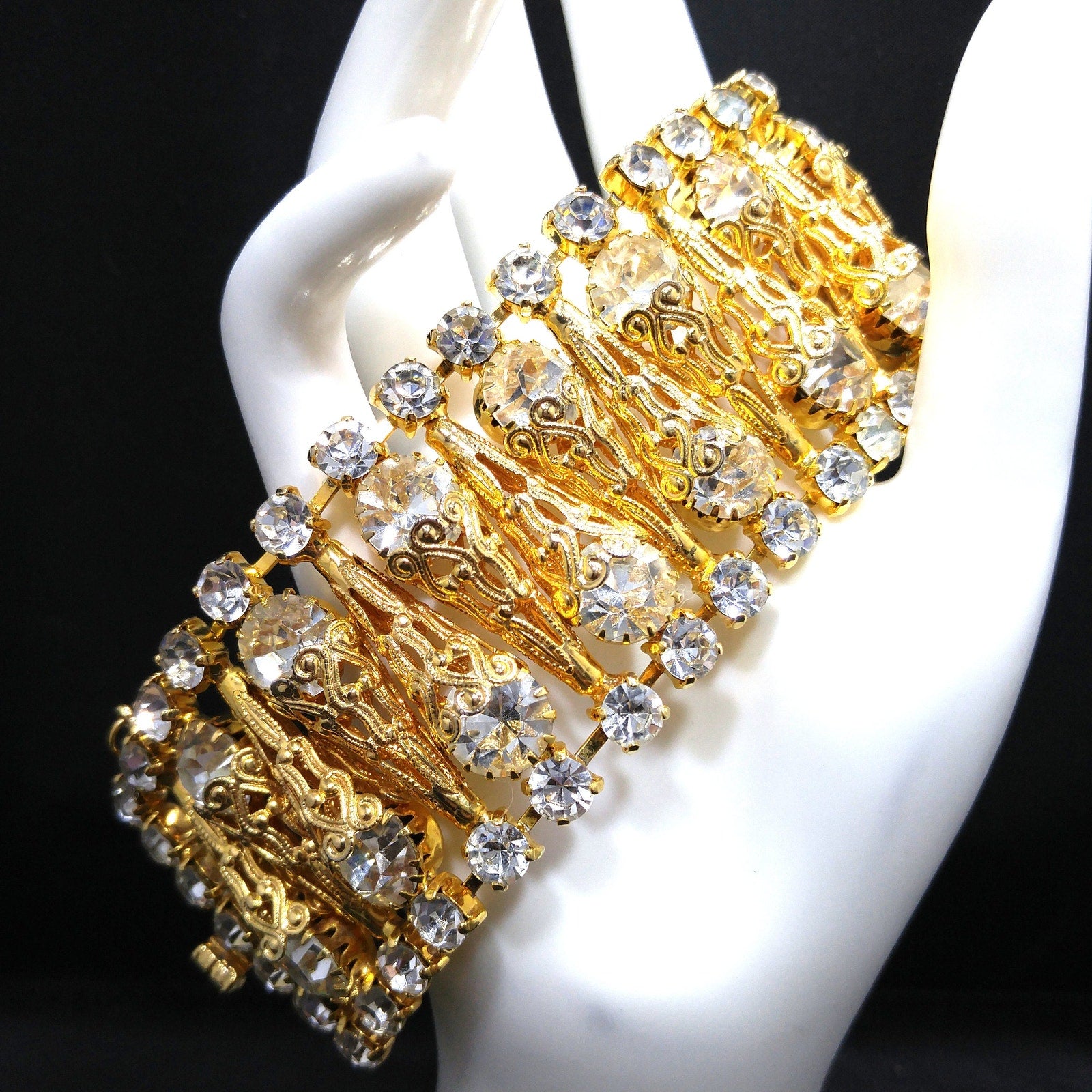 This breathtaking vintage bracelet is a true show-stopper! Featuring extra-large clear crystal rhinestones nestled inside sculpted gold-tone filigree cone settings, this bracelet delivers maximum sparkle and dramatic mid-century glamour.