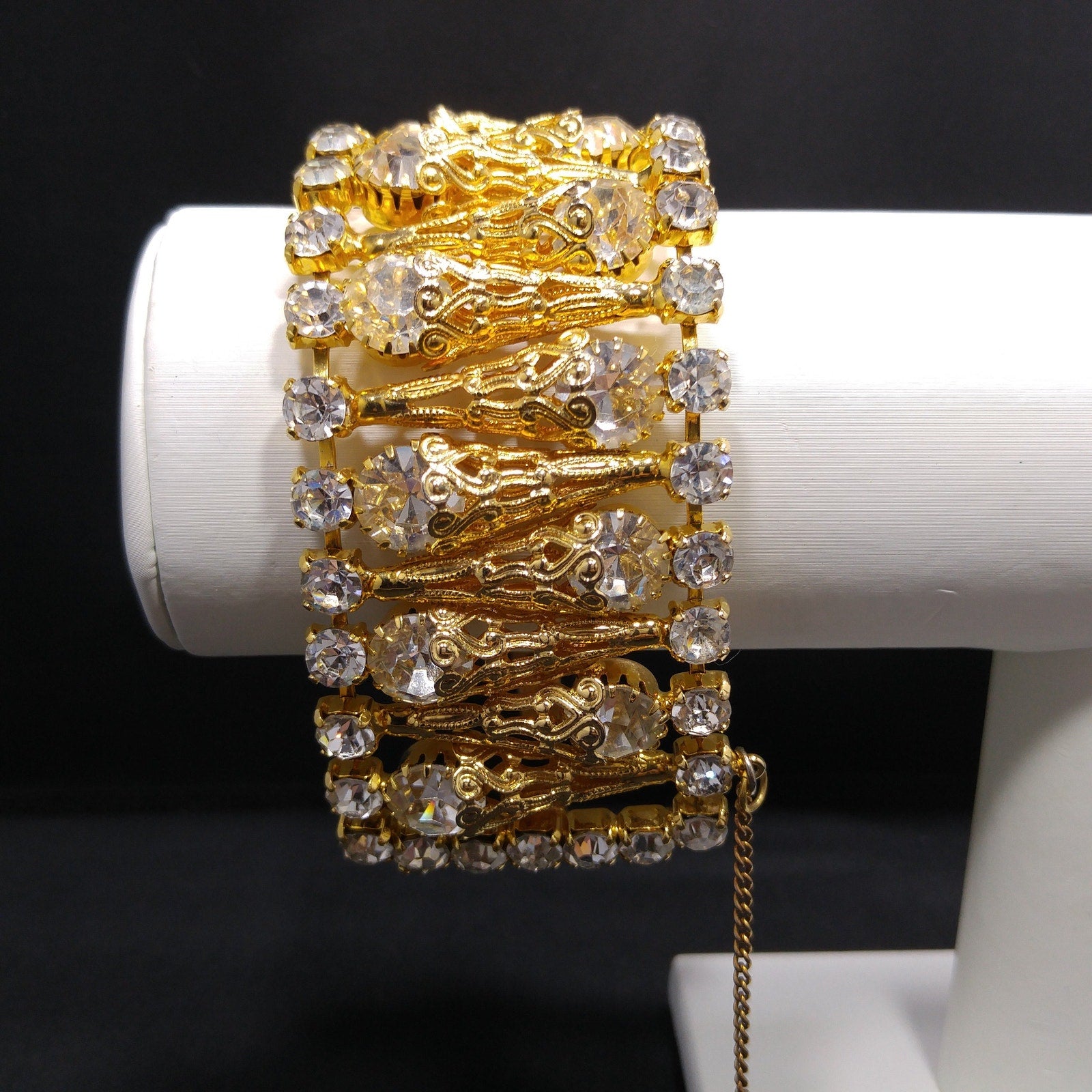 The wide construction creates a luxe, cuff-like appearance, bordered by prong-set clear round rhinestones on each side for even more brilliance. A hidden box clasp and attached safety chain provide security, and the bracelet remains in exceptional condition — rarely worn and lovingly preserved.