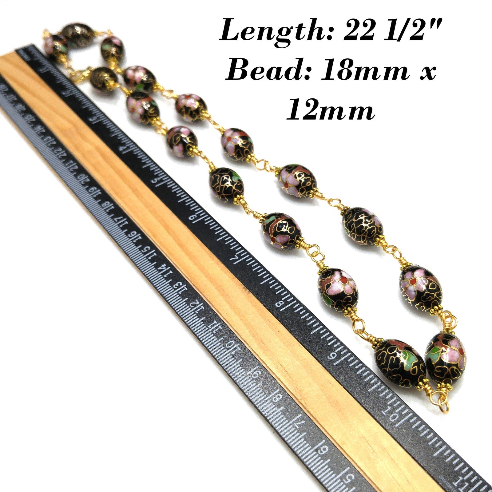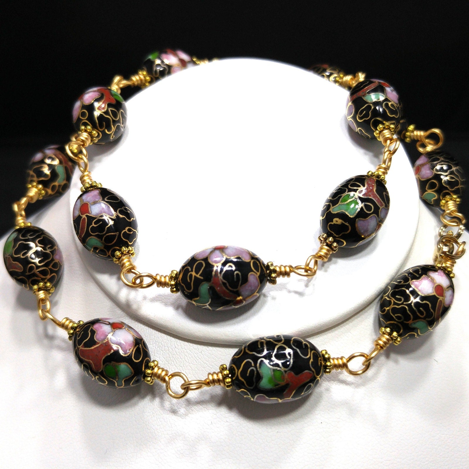 The oval cloisonné beads feature delicate floral motifs painted in pastel pink, red, white, and green, all outlined in gold against a striking black background. Each bead is a small work of art, making this necklace an eye-catching and collectible vintage treasure.
