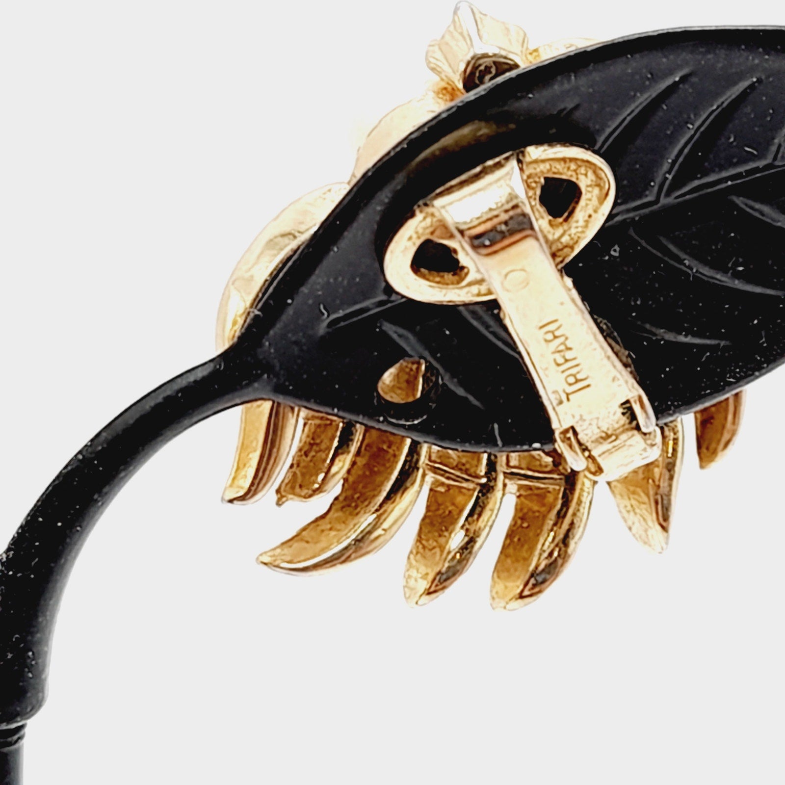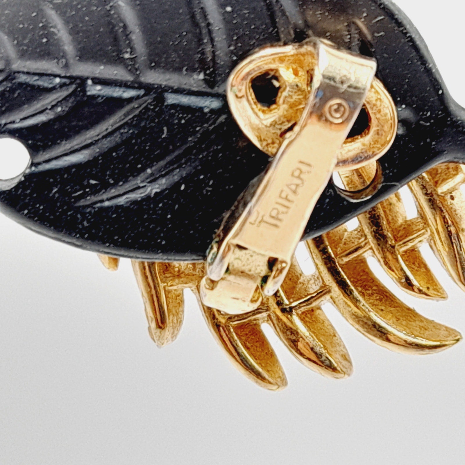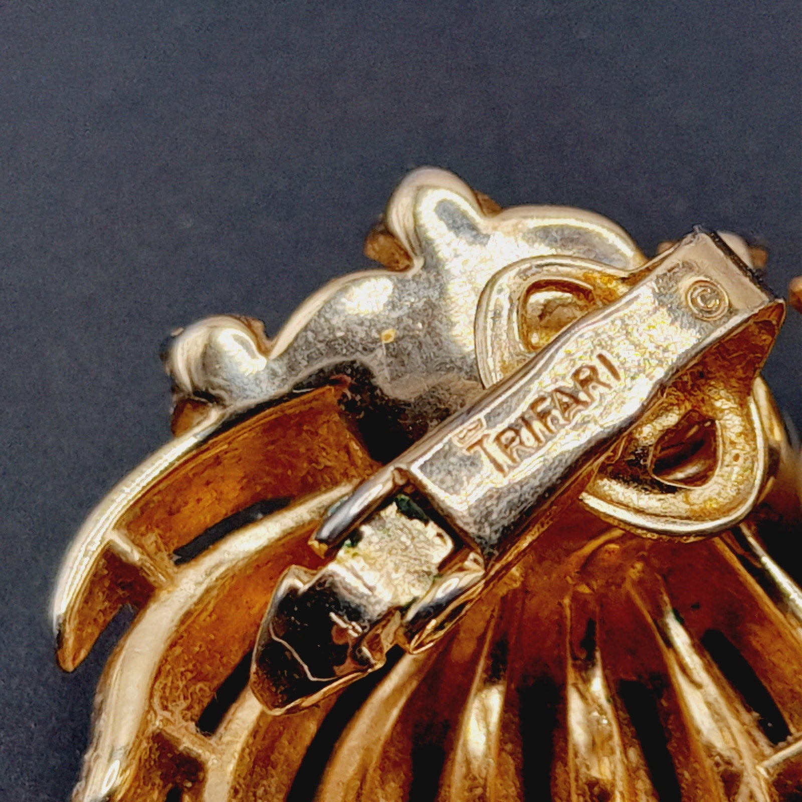 These stunning Crown Trifari clip earrings bring a touch of timeless sophistication to any outfit. Featuring a cluster of faux pearls accented by brilliant rhinestones in a radiant gold-tone setting, these earrings are a striking example of mid-century Trifari craftsmanship.
