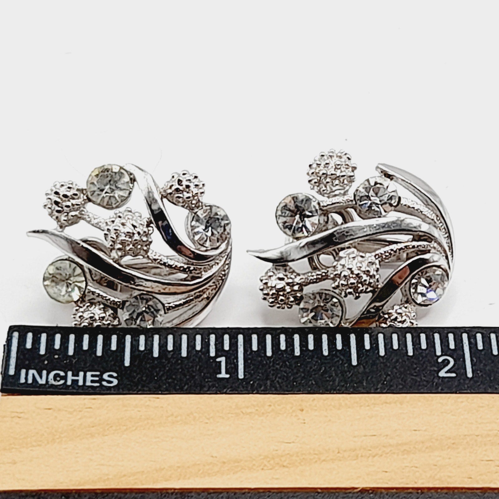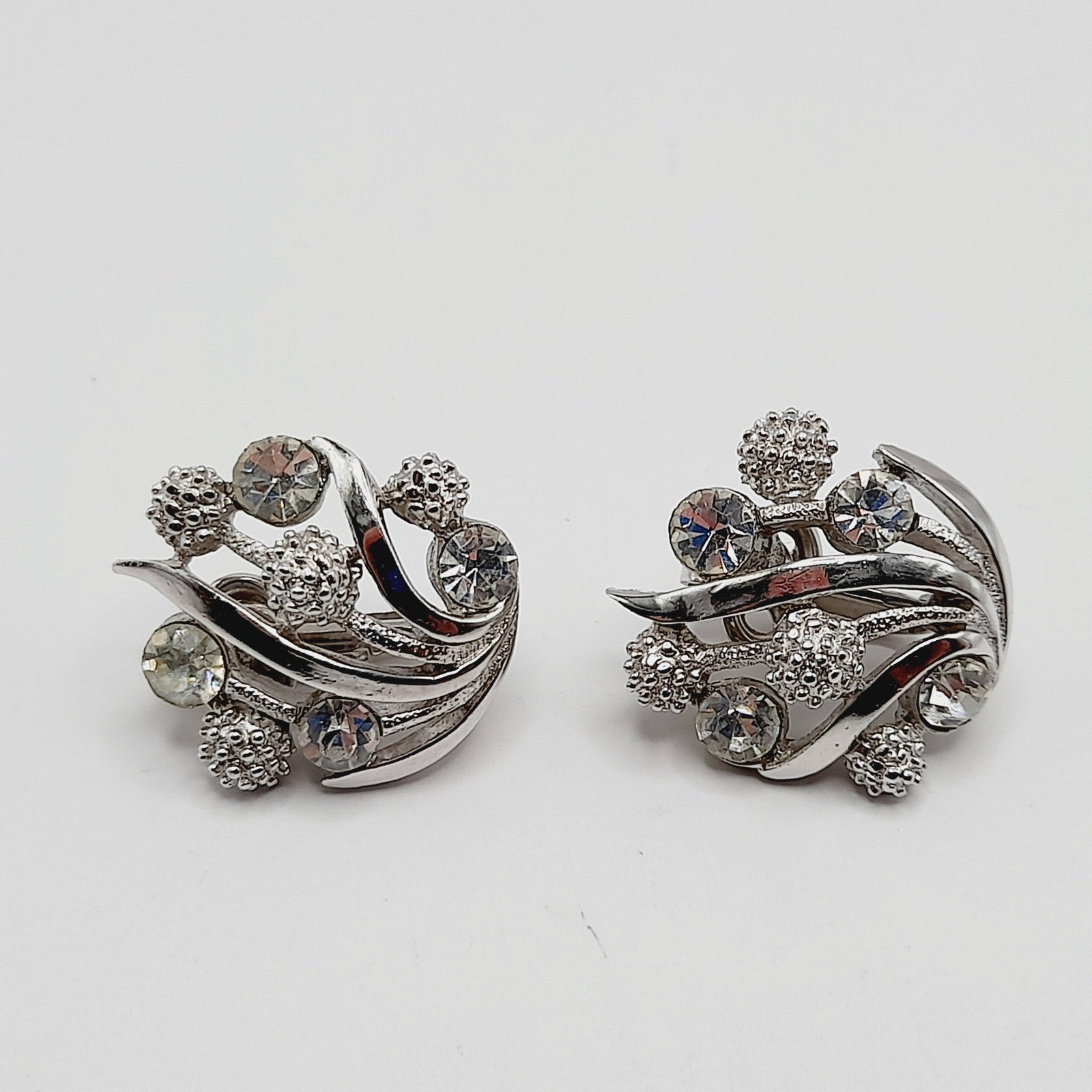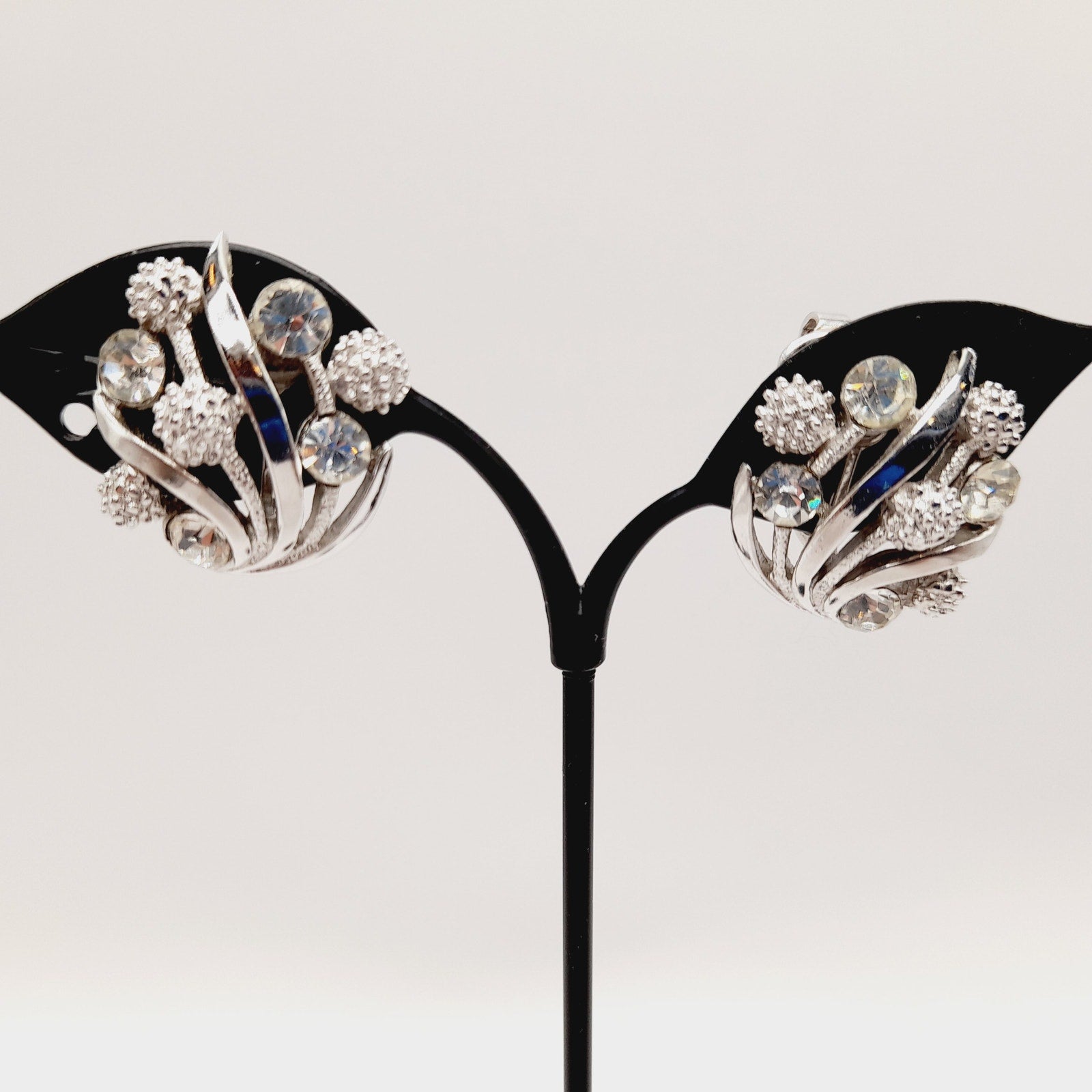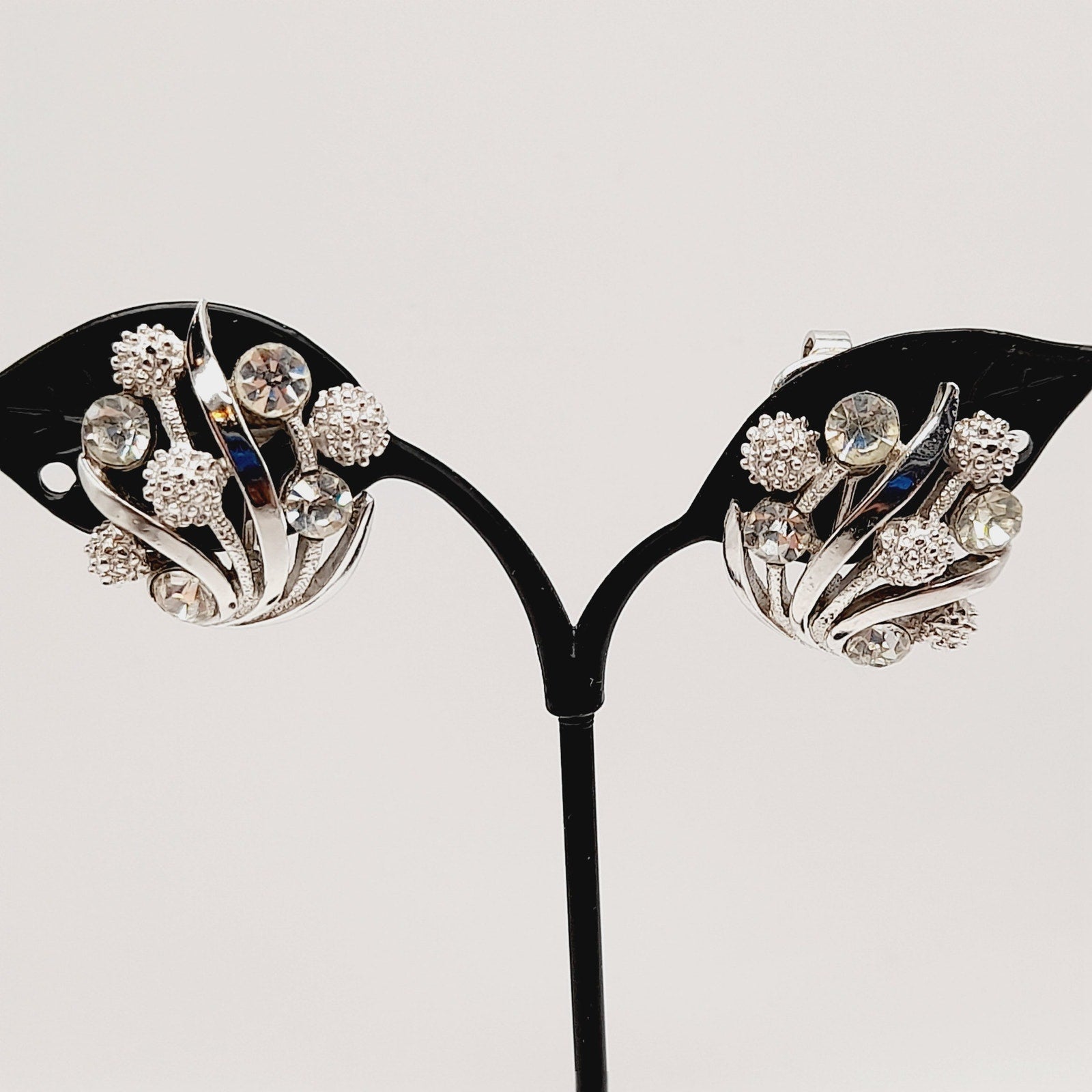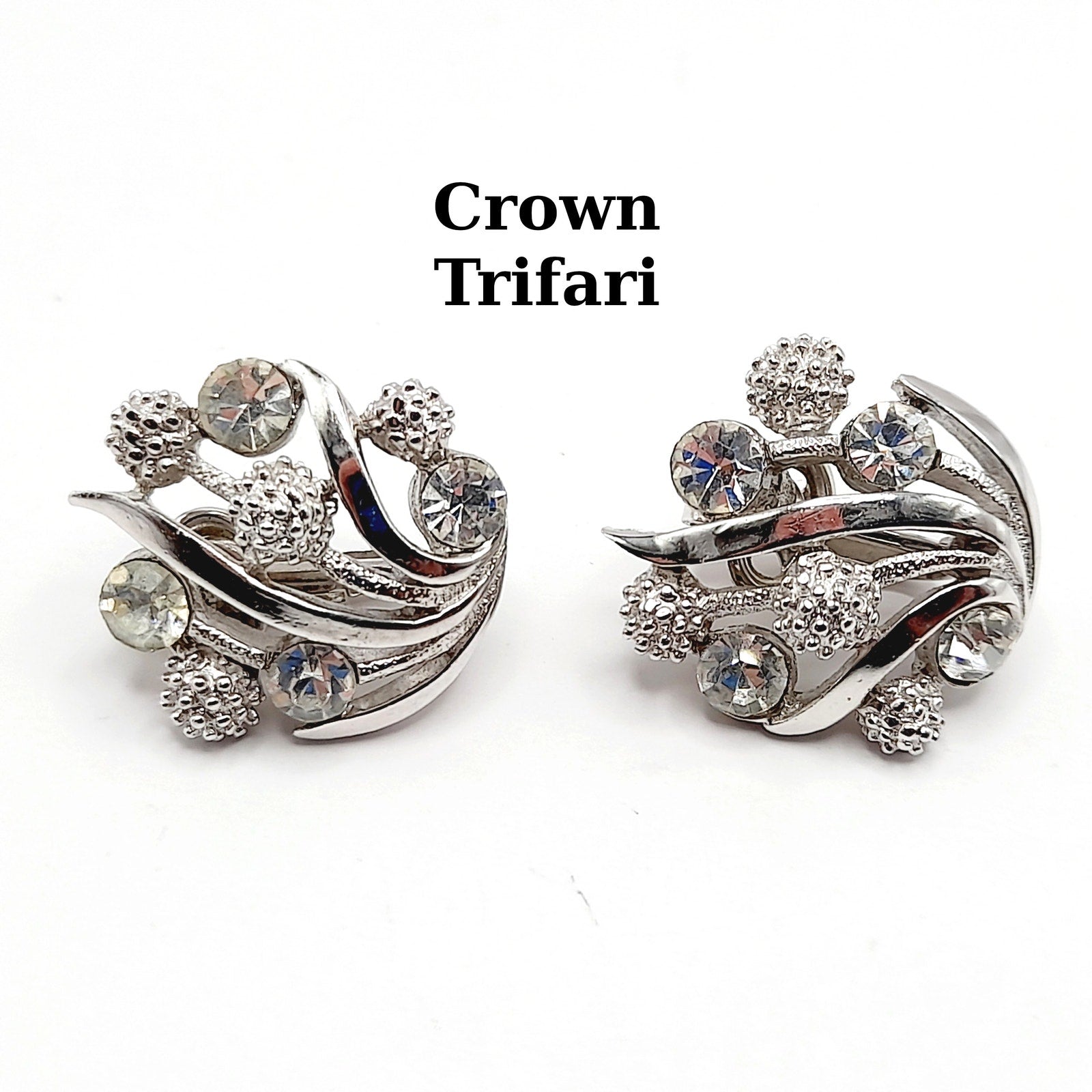 Vintage Crown Trifari Rhinestone Clip Earrings – Rhodium Plated Mid Century Jewelry