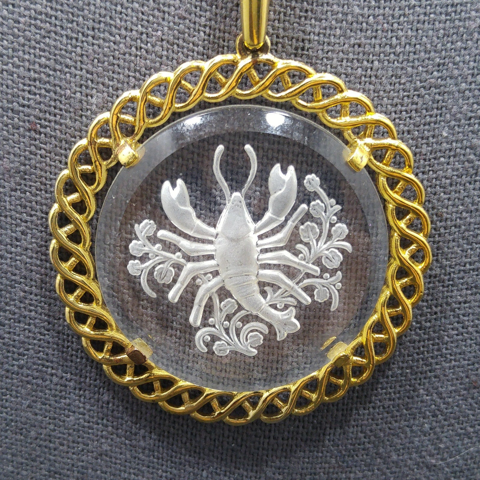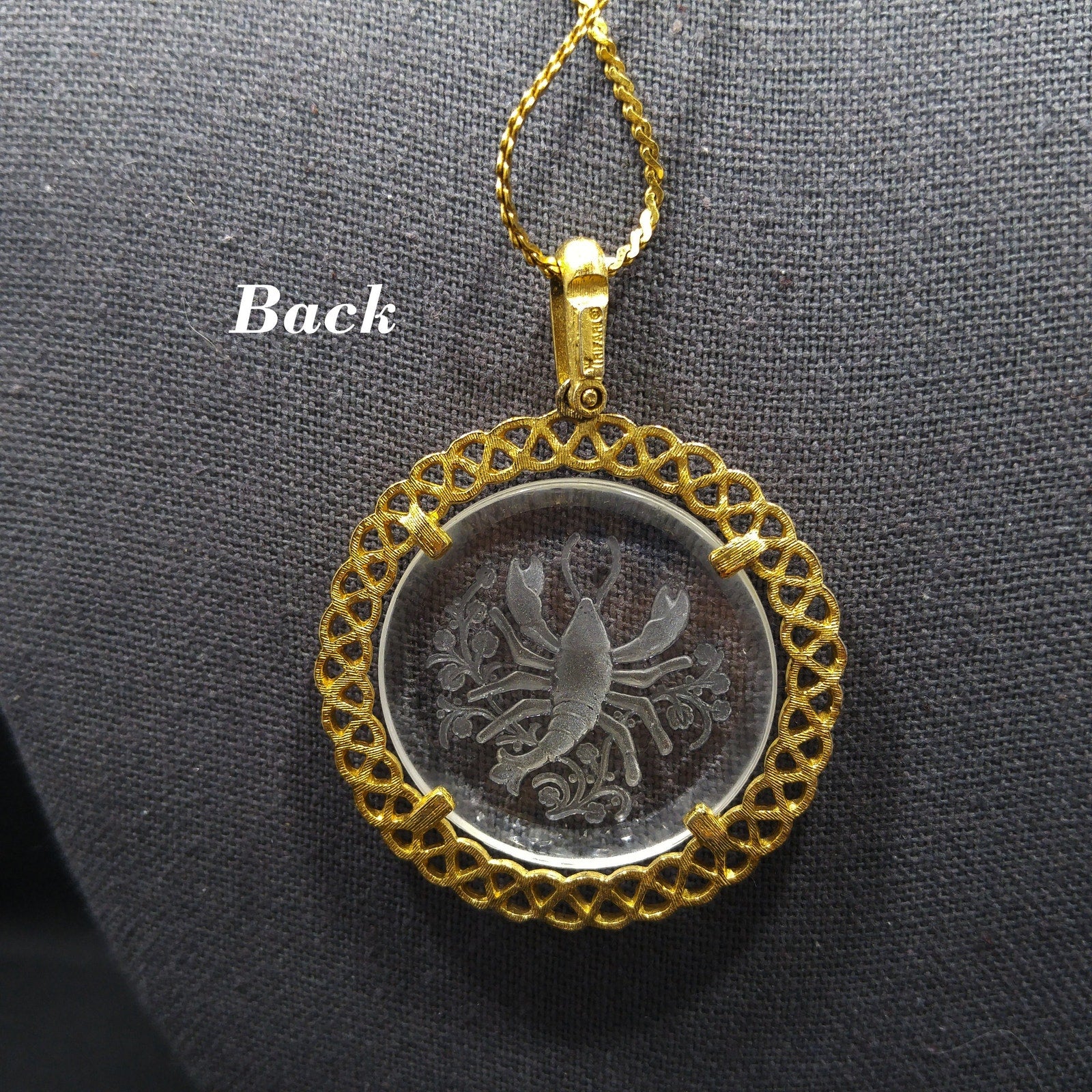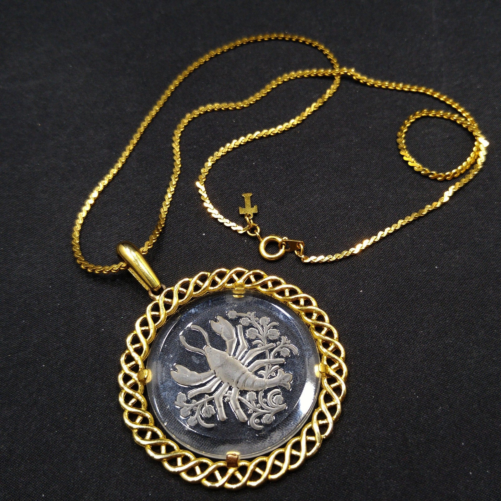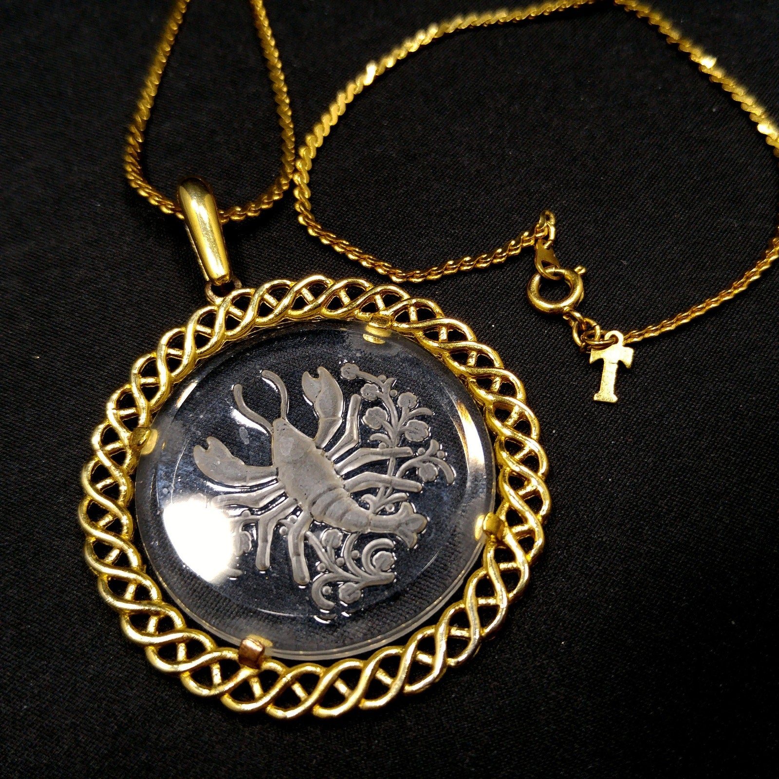 Vintage Crown Trifari Zodiac "Cancer" Necklace, Glass Intaglio Crab, Gold Plated, 1960s Vintage Jewelry