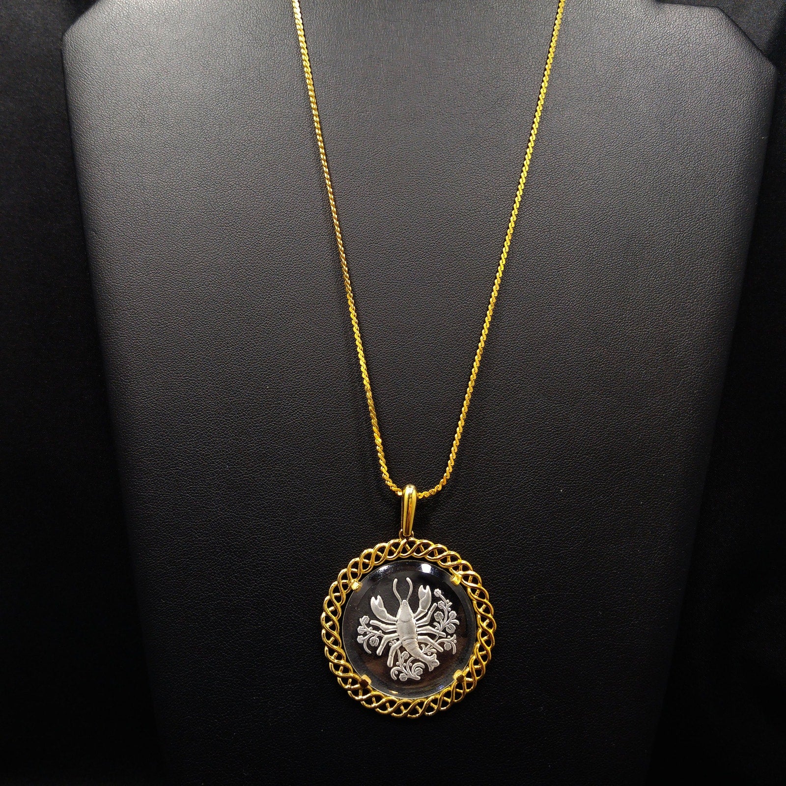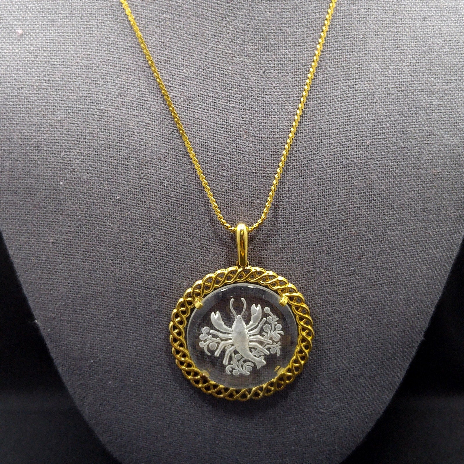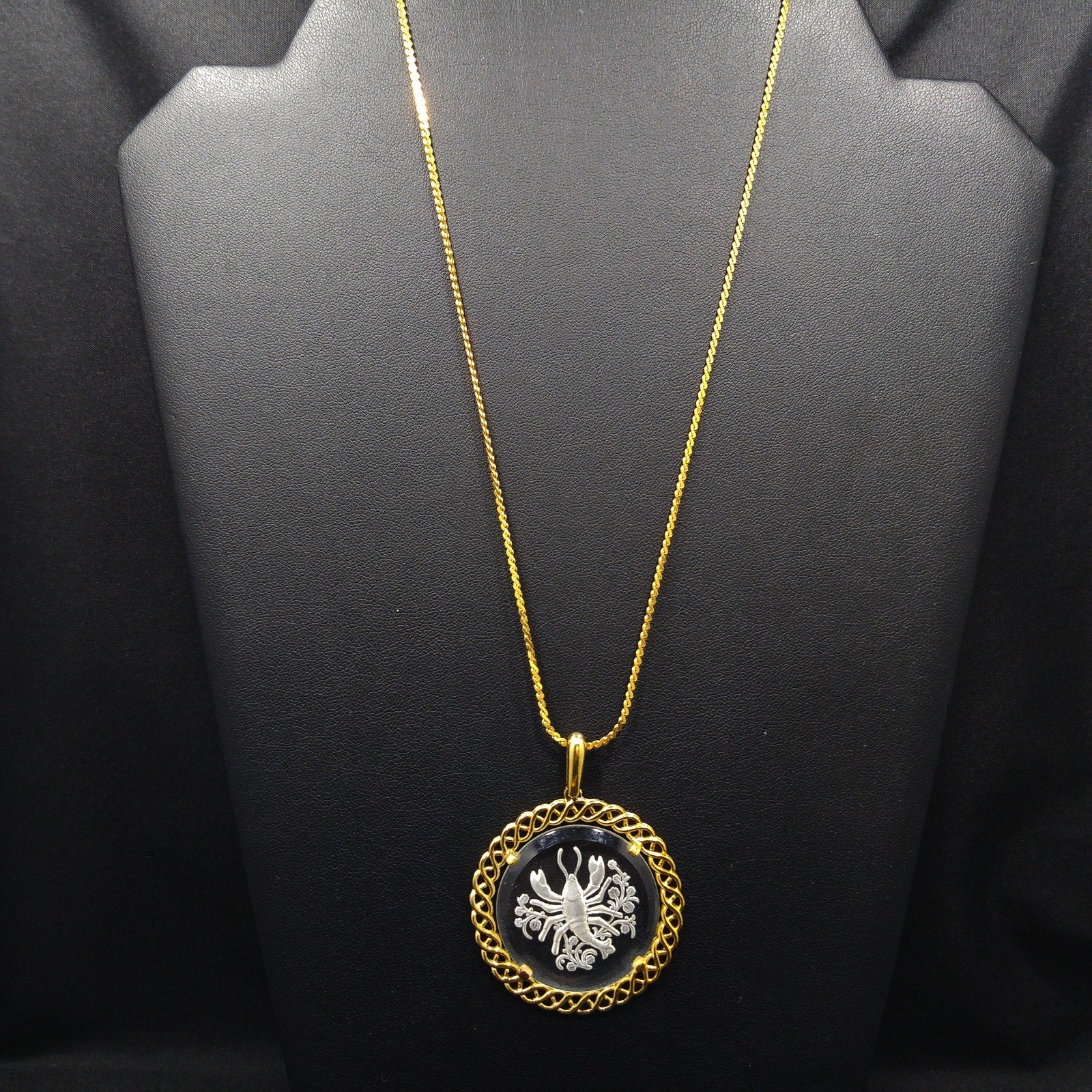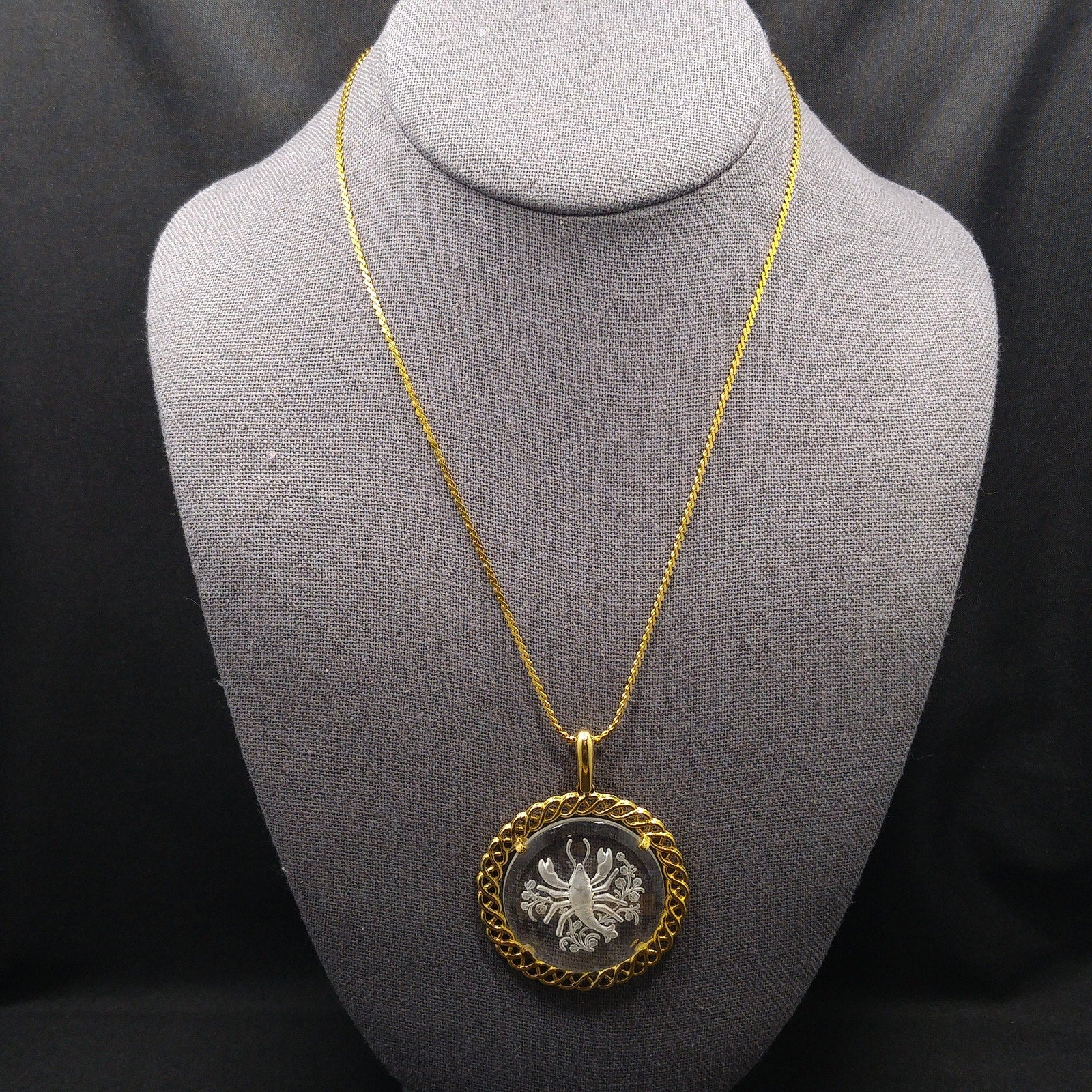 Vintage Crown Trifari Zodiac "Cancer" Necklace, Glass Intaglio Crab, Gold Plated, 1960s Vintage Jewelry