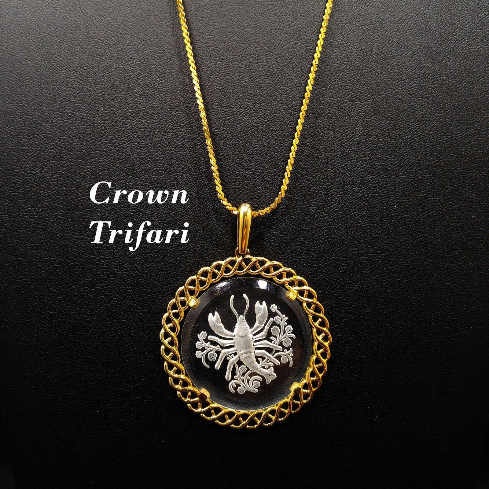 *Description: This is a great Crown Trifari Zodiac glass pendant necklace; Cancer, the crab, from the 1960s. The glass crab Zodiac pendant is prong set and the crab is etched into the glass in the intaglio style. The gold plated chain has a T for crown Trifari near the spring ring clasp. The pendant is also signed with Trifari with the crown on the back of the bail. This is a great necklace and would be a great addition to your vintage jewelry collection or make a great vintage gift!