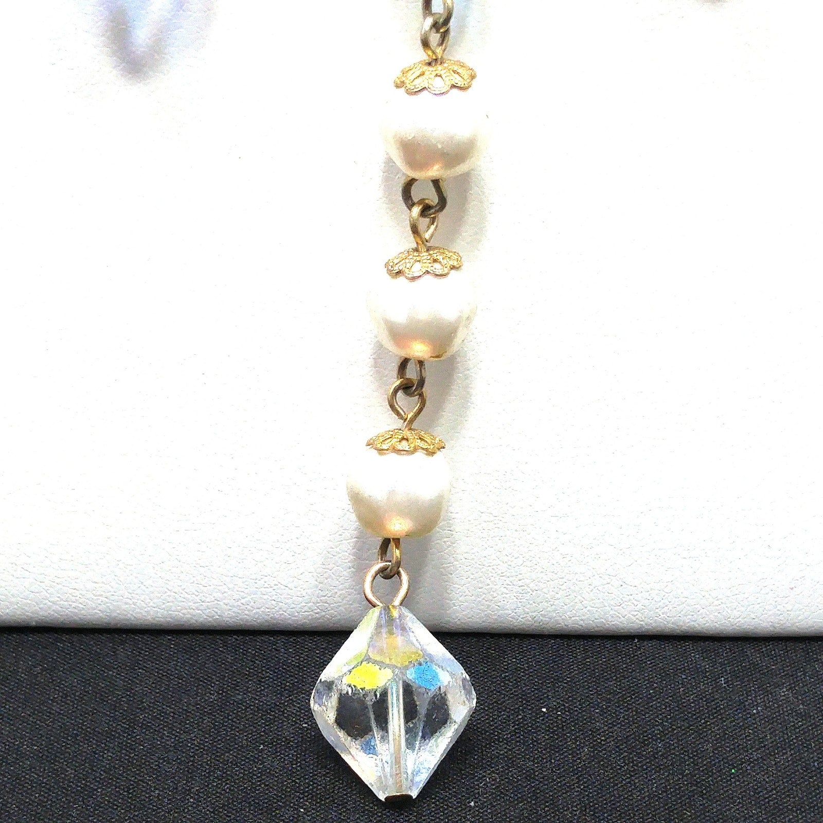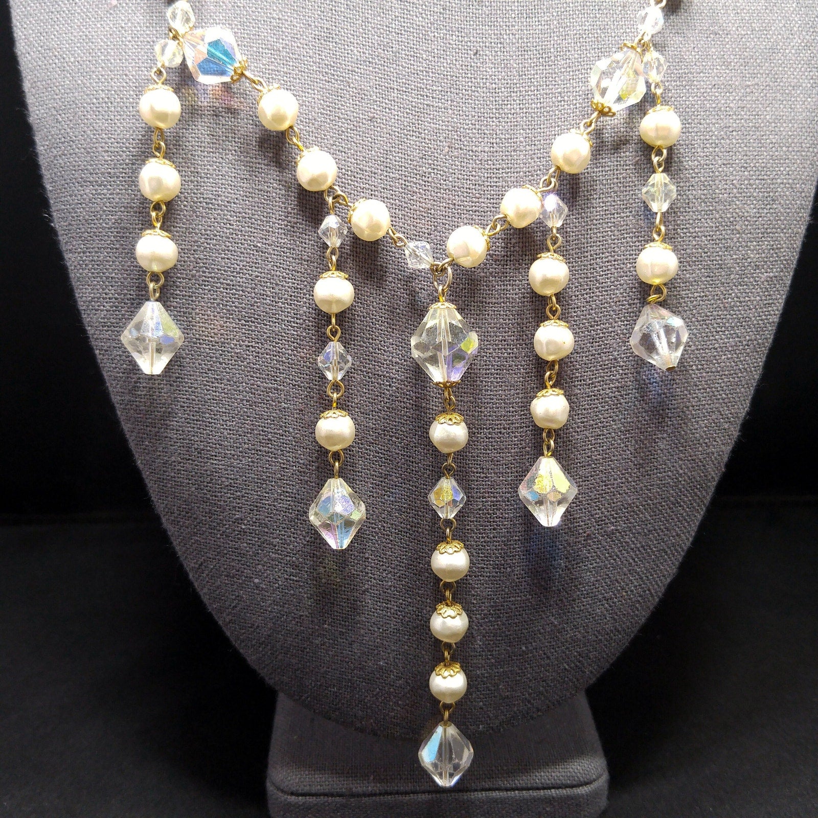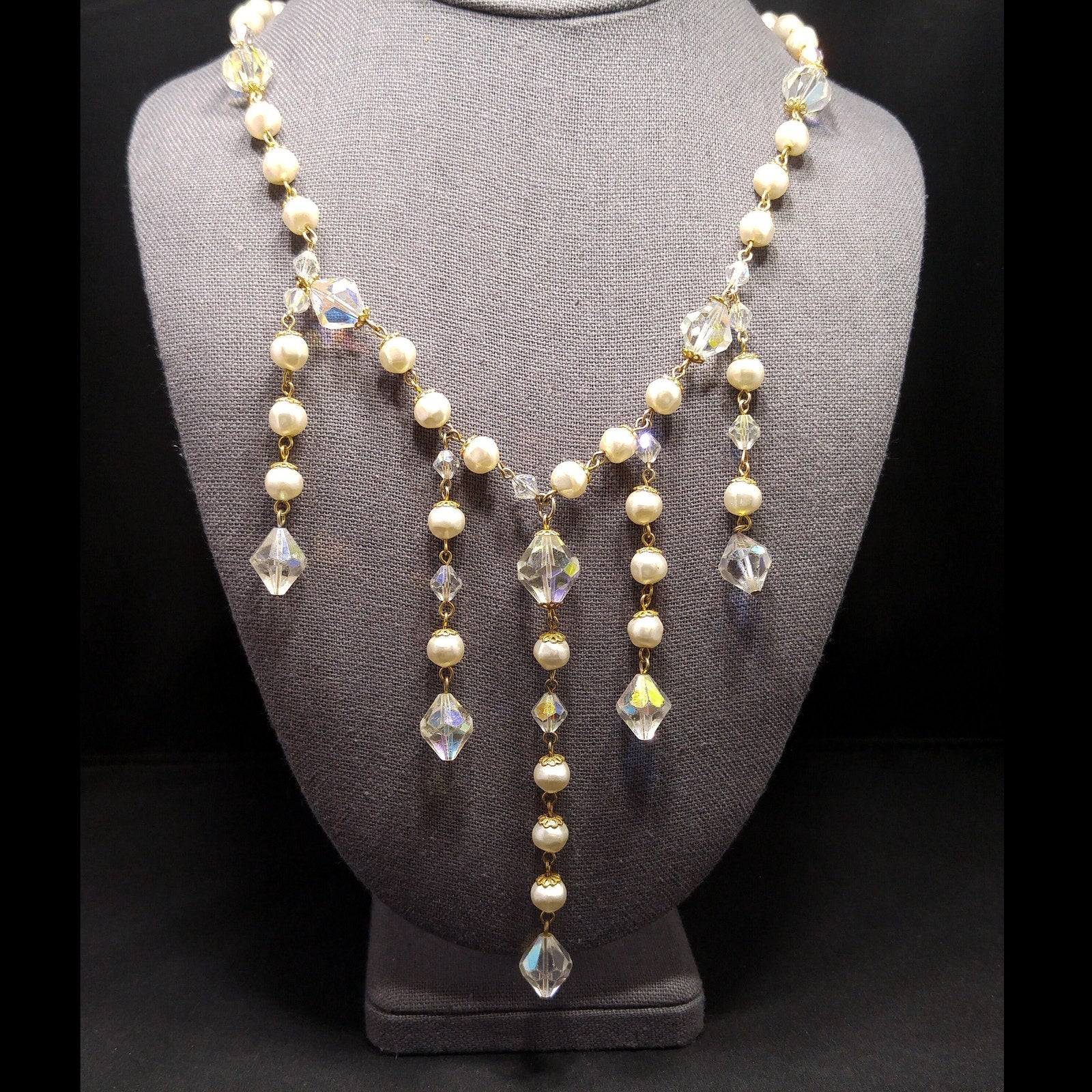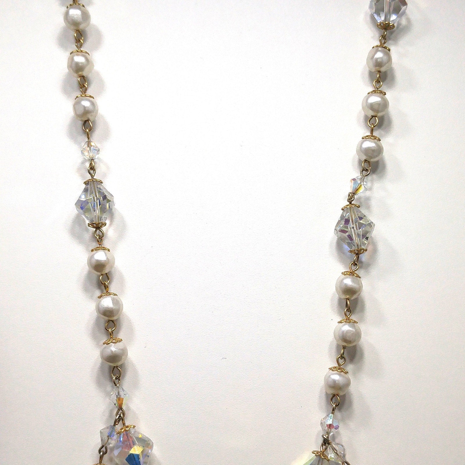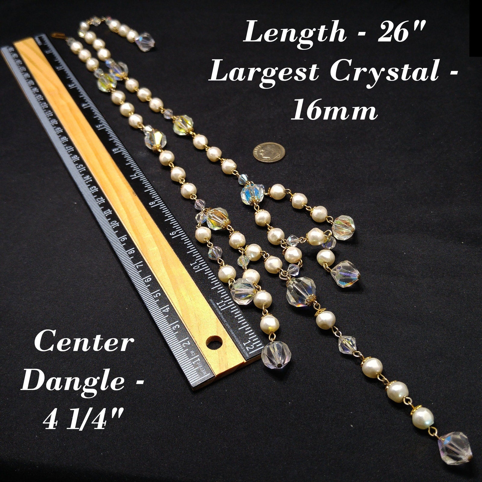 Vintage Crystal Faux Pearl Dangle Necklace, Large Aurora Borealis Crystal Beads, Vintage Jewelry