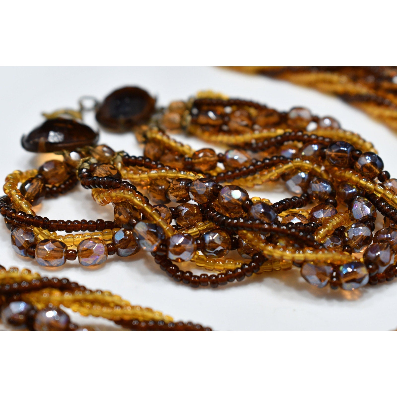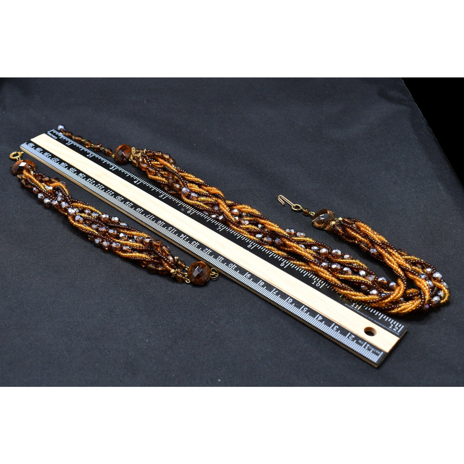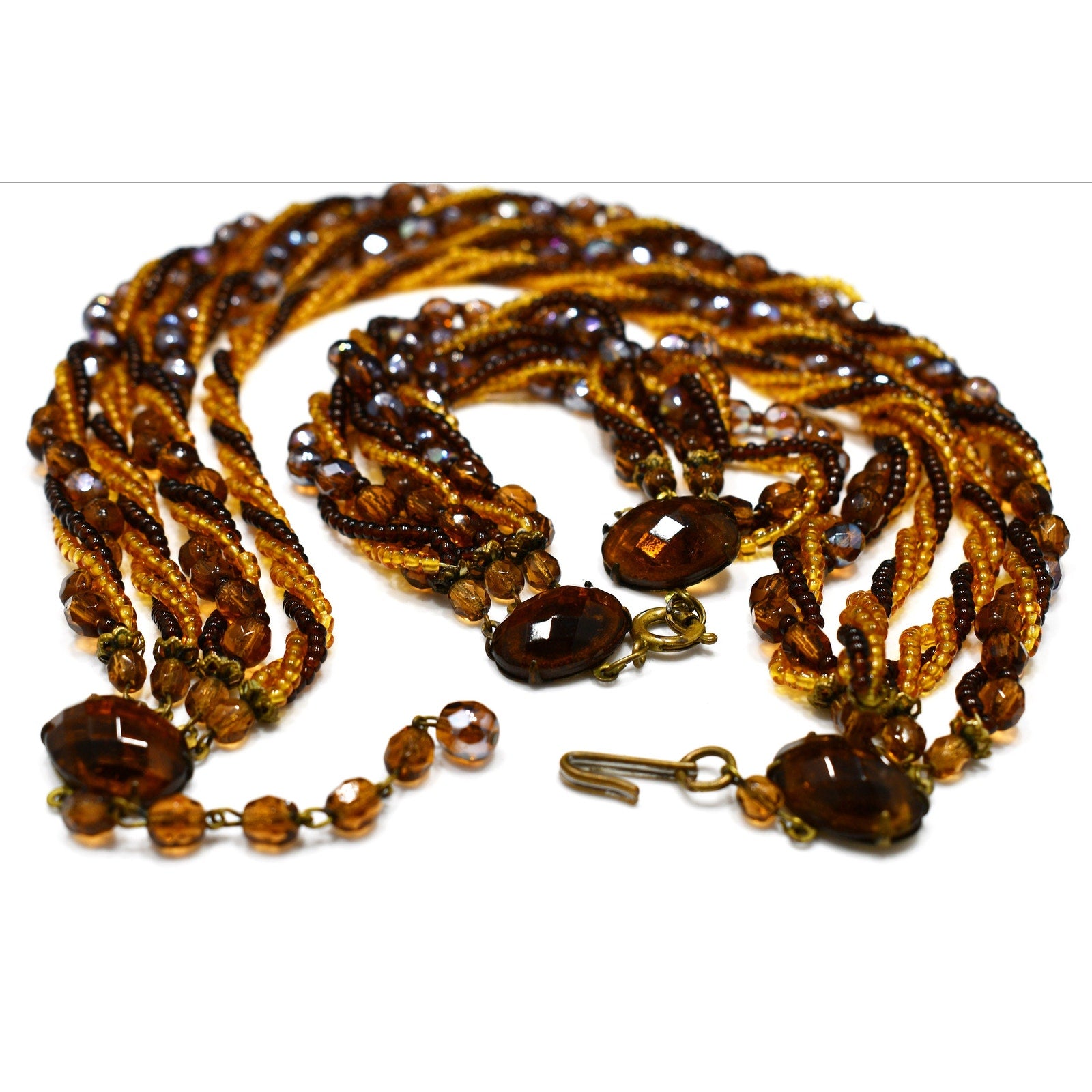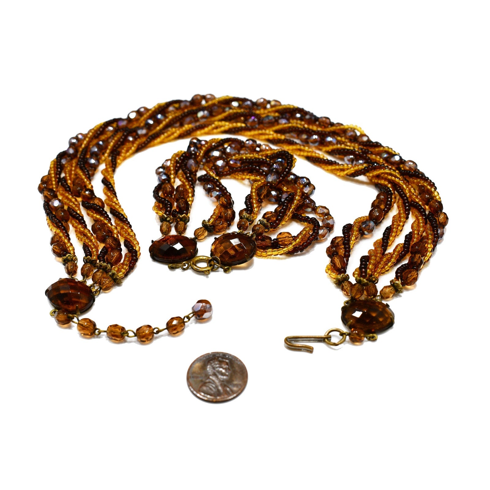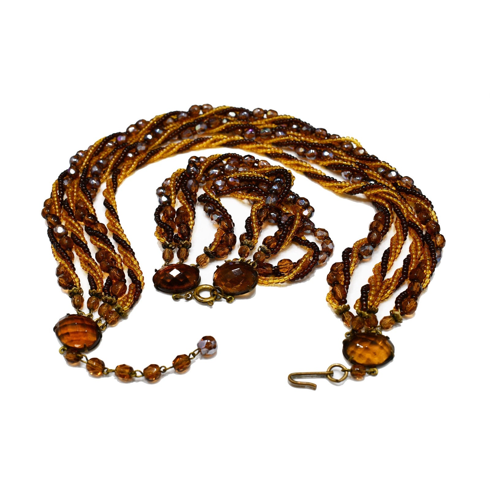 *Description: This is a beautiful vintage Czech beaded necklace and matching bracelet in topaz tones. Each side of the necklace and bracelet has a faceted topaz glass end piece with the multi strands attach on one side and the clasps on the other. Both pieces have strands composed of fire polished topaz beads which are mixed with seed beads in topaz glass; the necklace has two of this design and the bracelet has three. On the necklace, there are two strands of topaz seed beads that are twisted to form two additional strands. This set is beautiful and would make a wonderful gift or great addition to your vintage jewelry collection.
