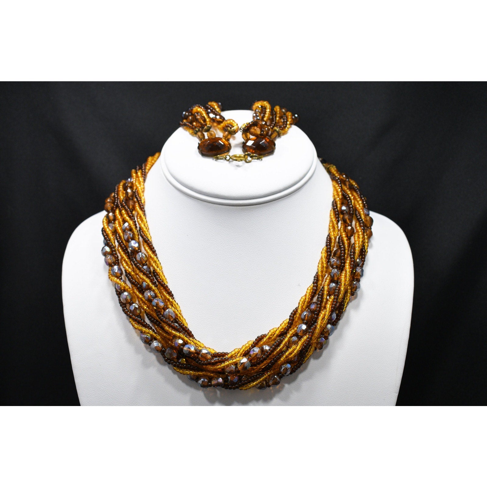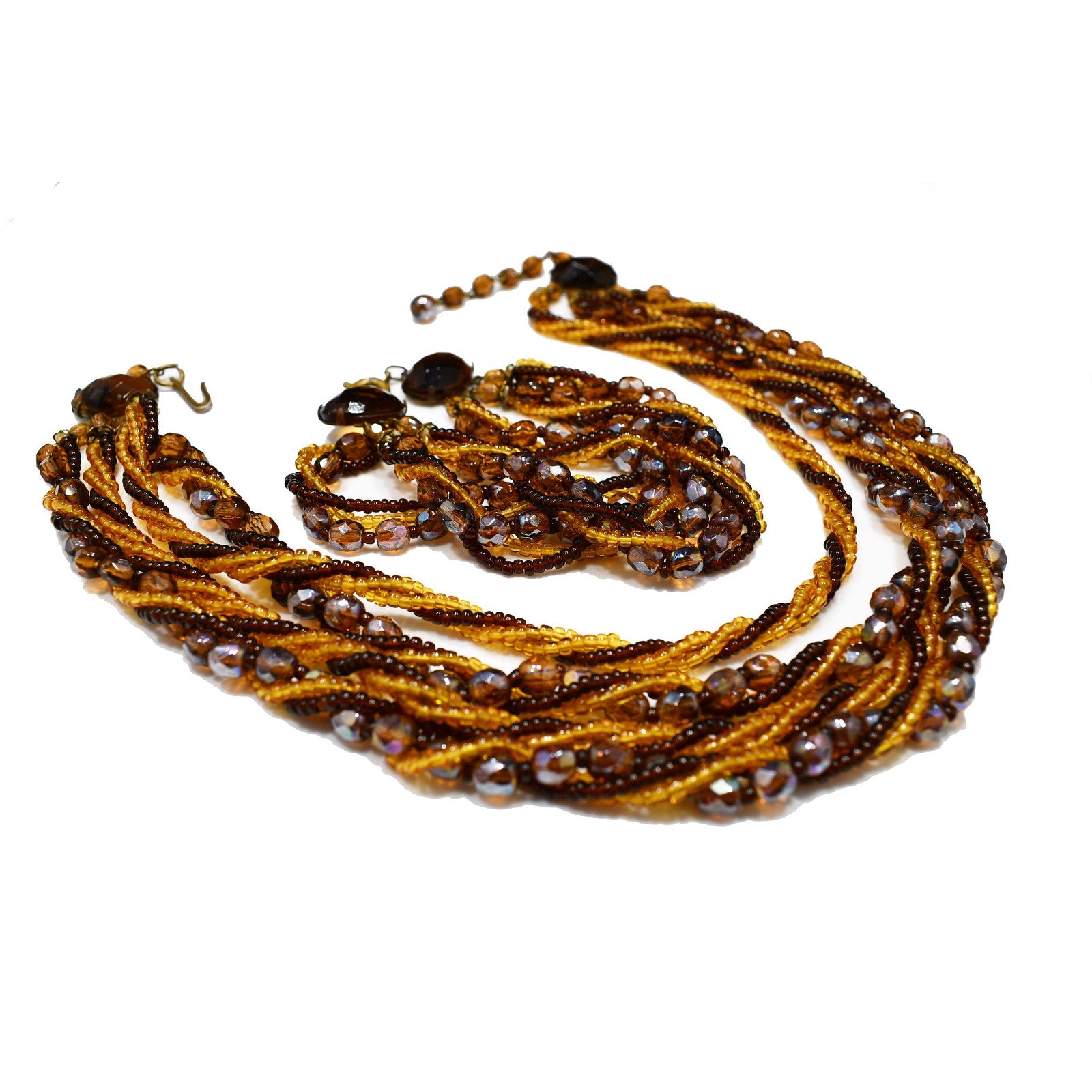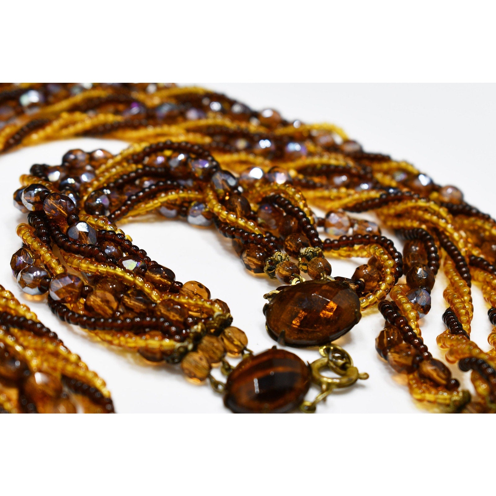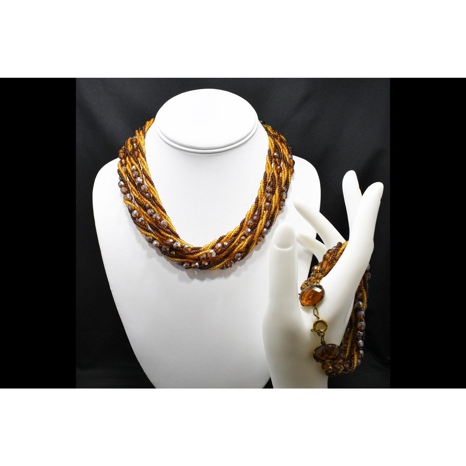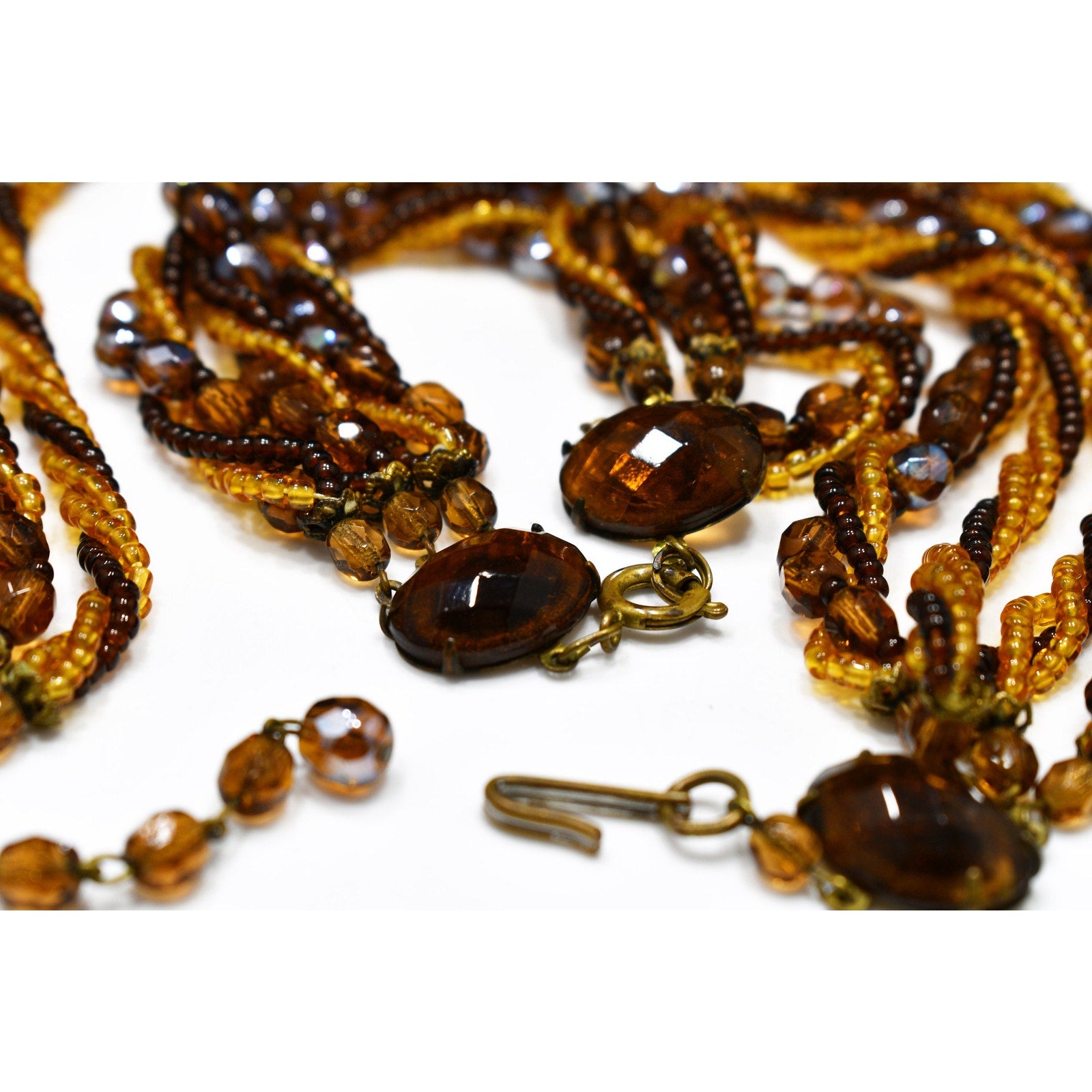 *Description: This is a beautiful vintage Czech beaded necklace and matching bracelet in topaz tones. Each side of the necklace and bracelet has a faceted topaz glass end piece with the multi strands attach on one side and the clasps on the other. Both pieces have strands composed of fire polished topaz beads which are mixed with seed beads in topaz glass; the necklace has two of this design and the bracelet has three. On the necklace, there are two strands of topaz seed beads that are twisted to form two additional strands. This set is beautiful and would make a wonderful gift or great addition to your vintage jewelry collection.