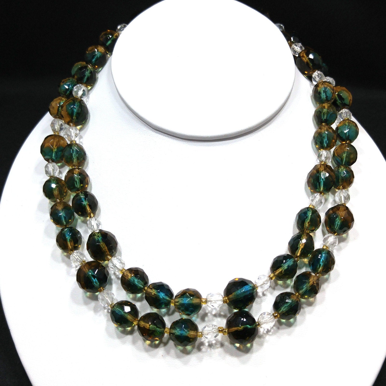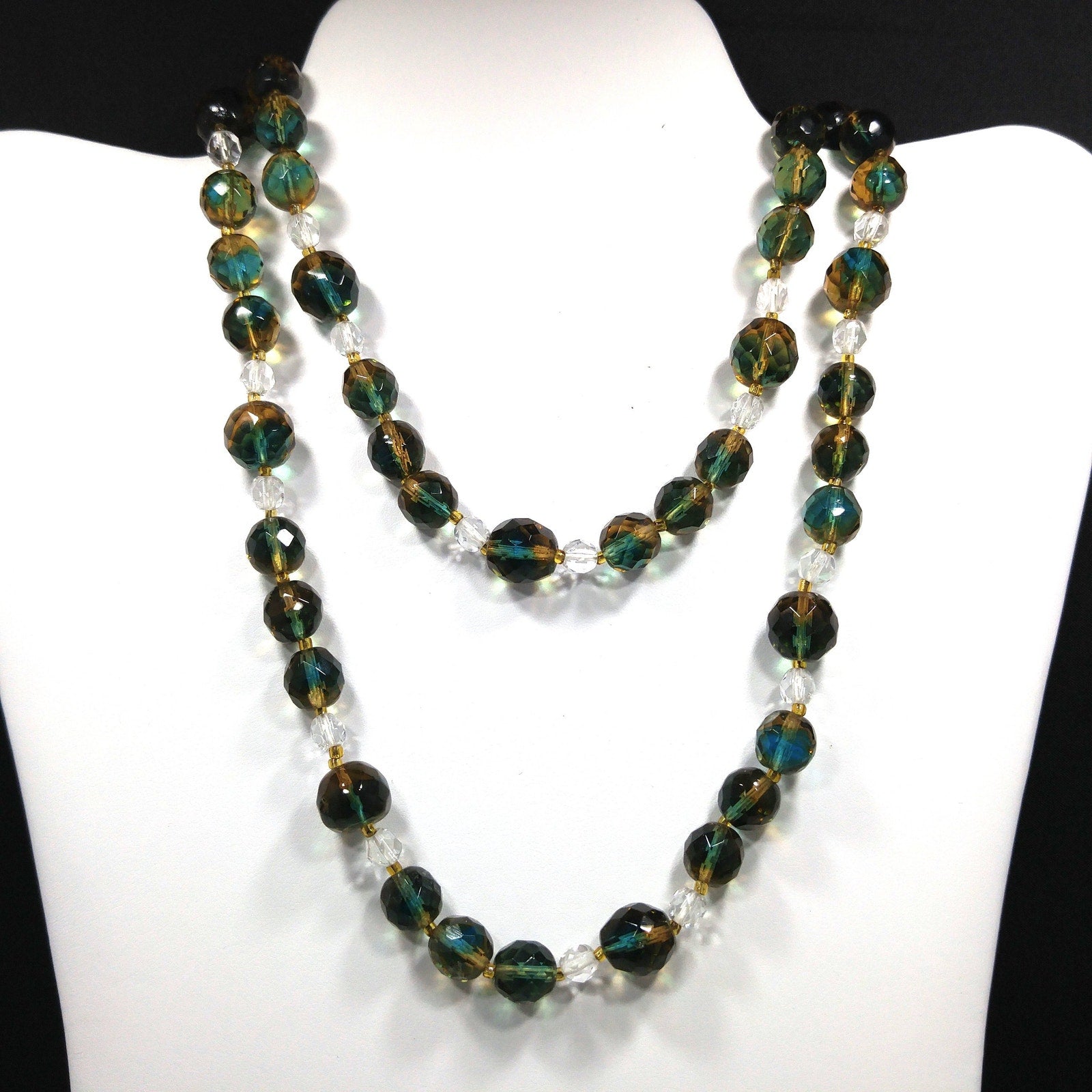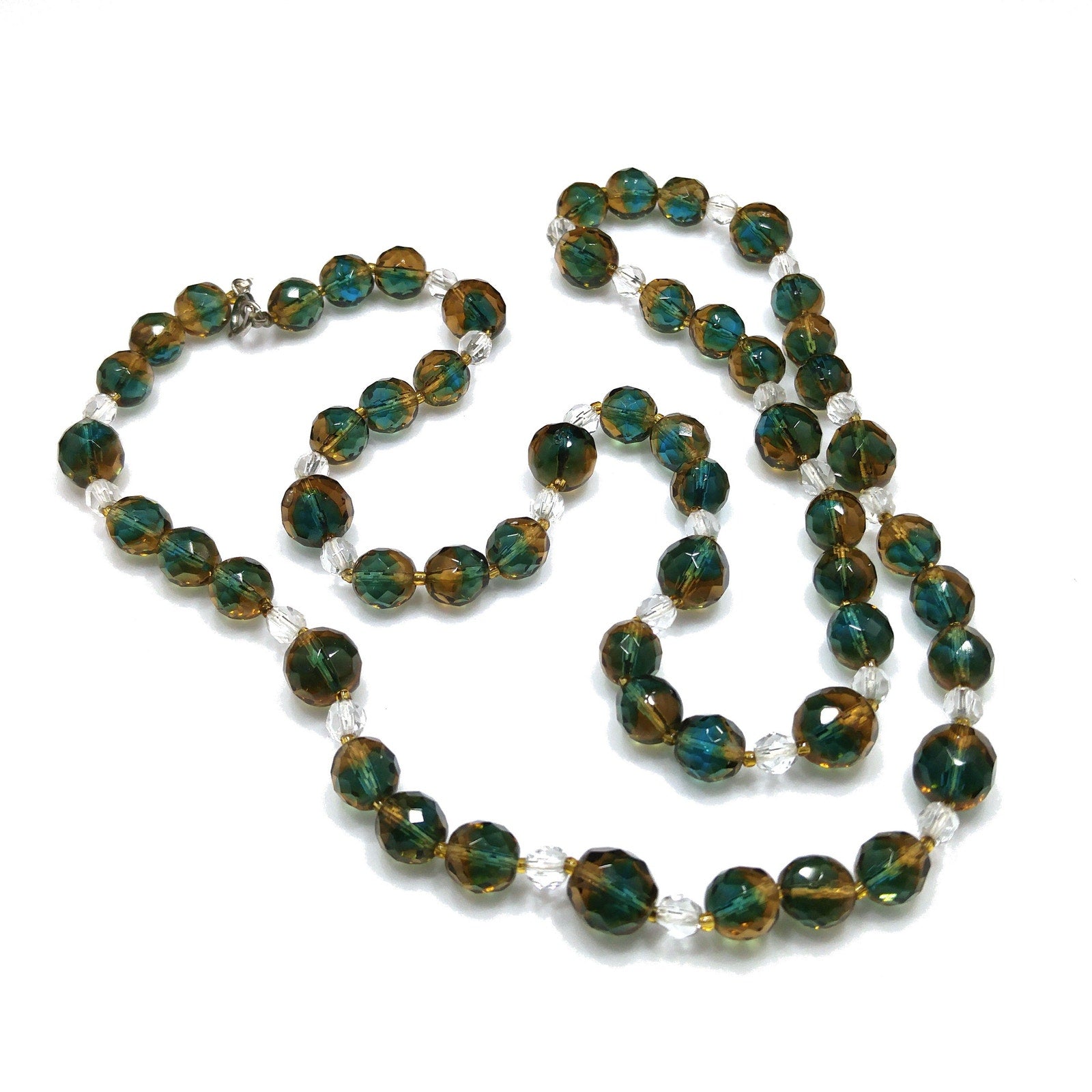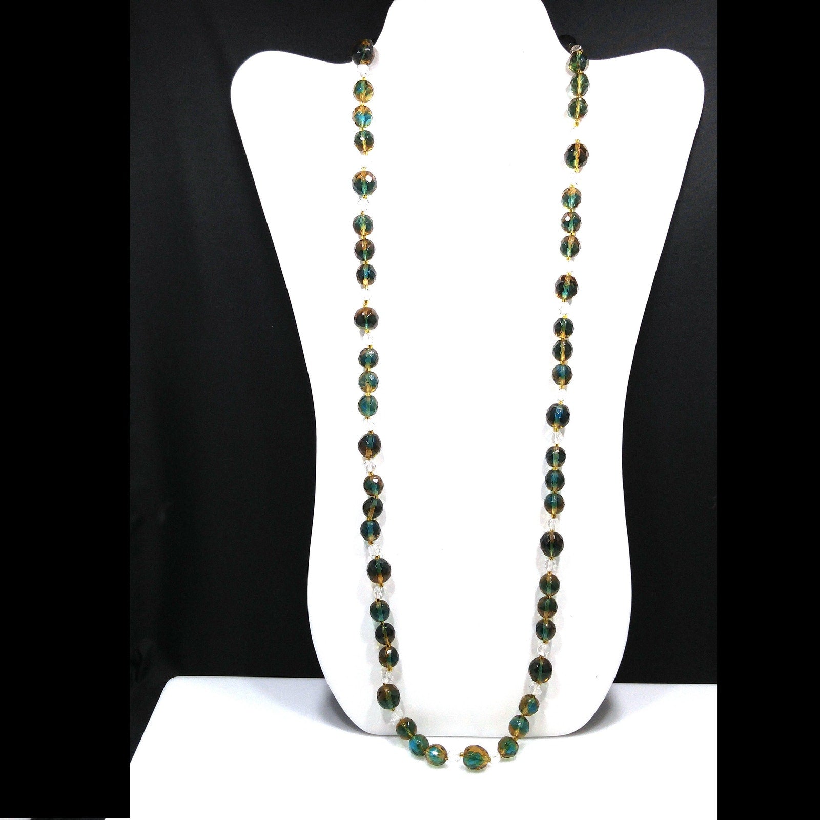 *Description: This is a beautiful Czech two toned faceted beaded long necklace in teal green and topaz larger beads with smaller clear faceted glass beads as spacer beads from the 1970s or before. The necklace has these unique beads that run from teal to topaz within the bead and each looks differently as the light hits them. The necklace is long at 32 inches so you could wear it at a long length or wrap it around your neck and wear as two strands. The necklace has a spring ring clasp so you can easily adjust the size and length. This would be a great addition to your vintage jewelry collection or make a great vintage gift!
