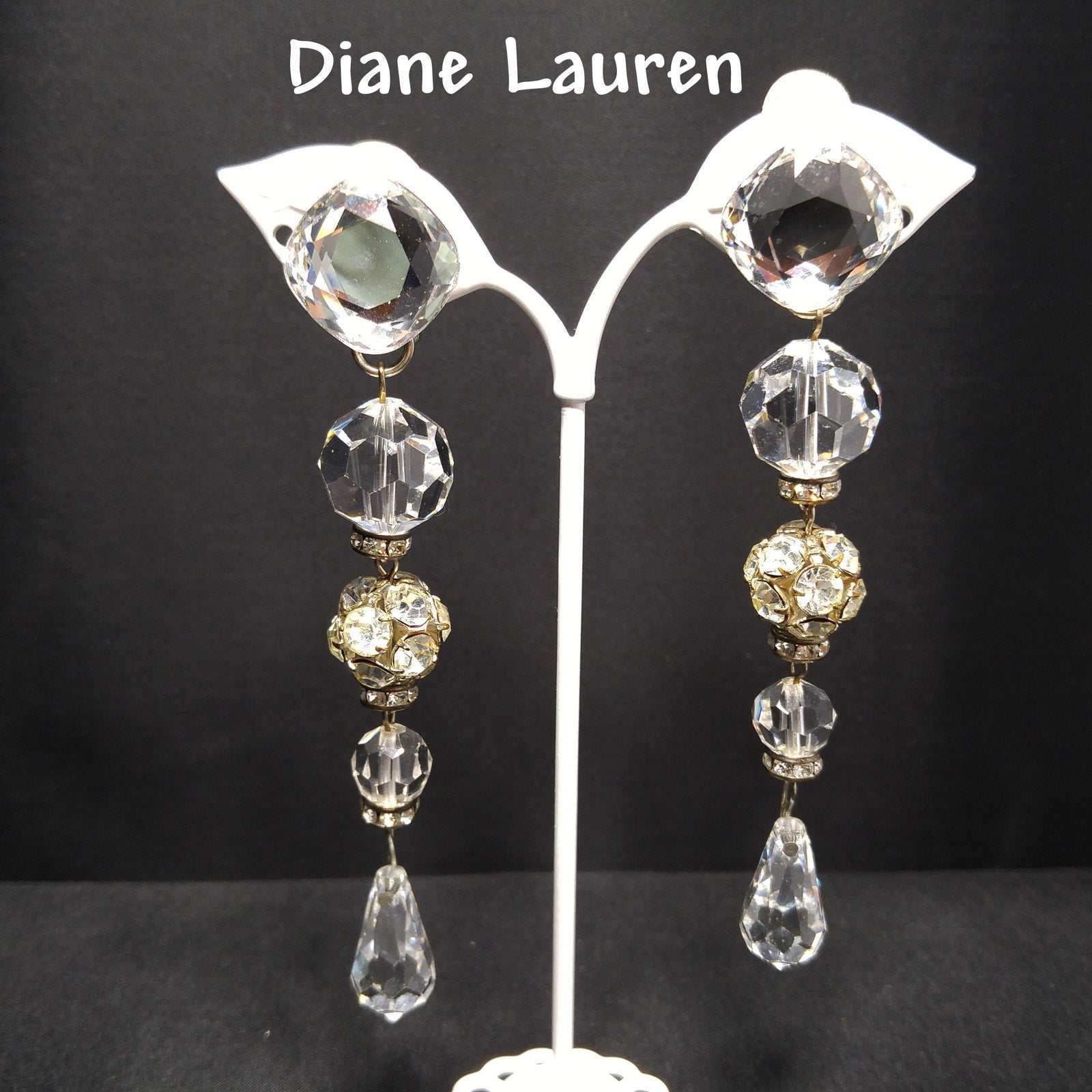 Vintage Diane Lauren Long Crystal Drop Earrings 1980s Clip On Runway Signed