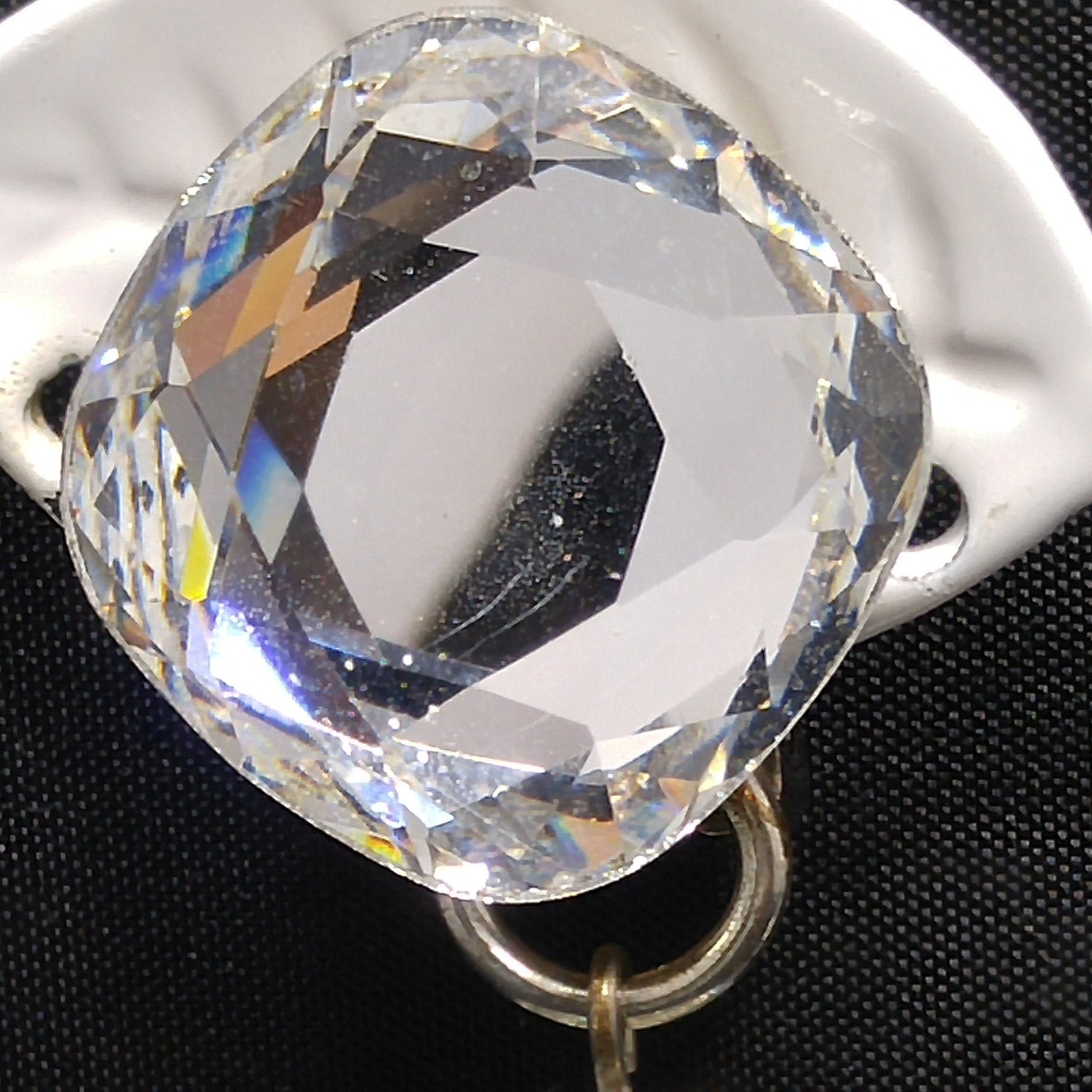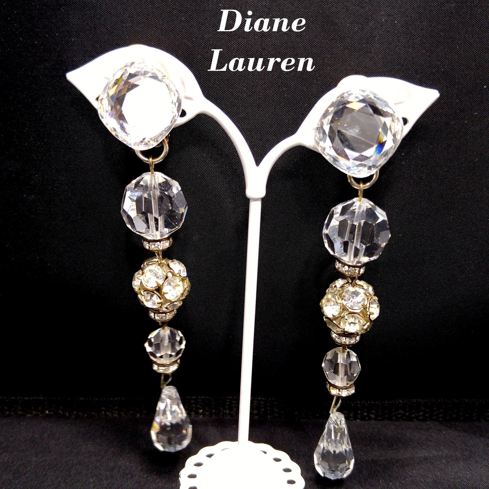 Gorgeous vintage Diane Lauren long crystal drop earrings from the 1980s. These dramatic clip-on earrings feature a variety of faceted clear crystal beads and sparkling rhinestone accents.