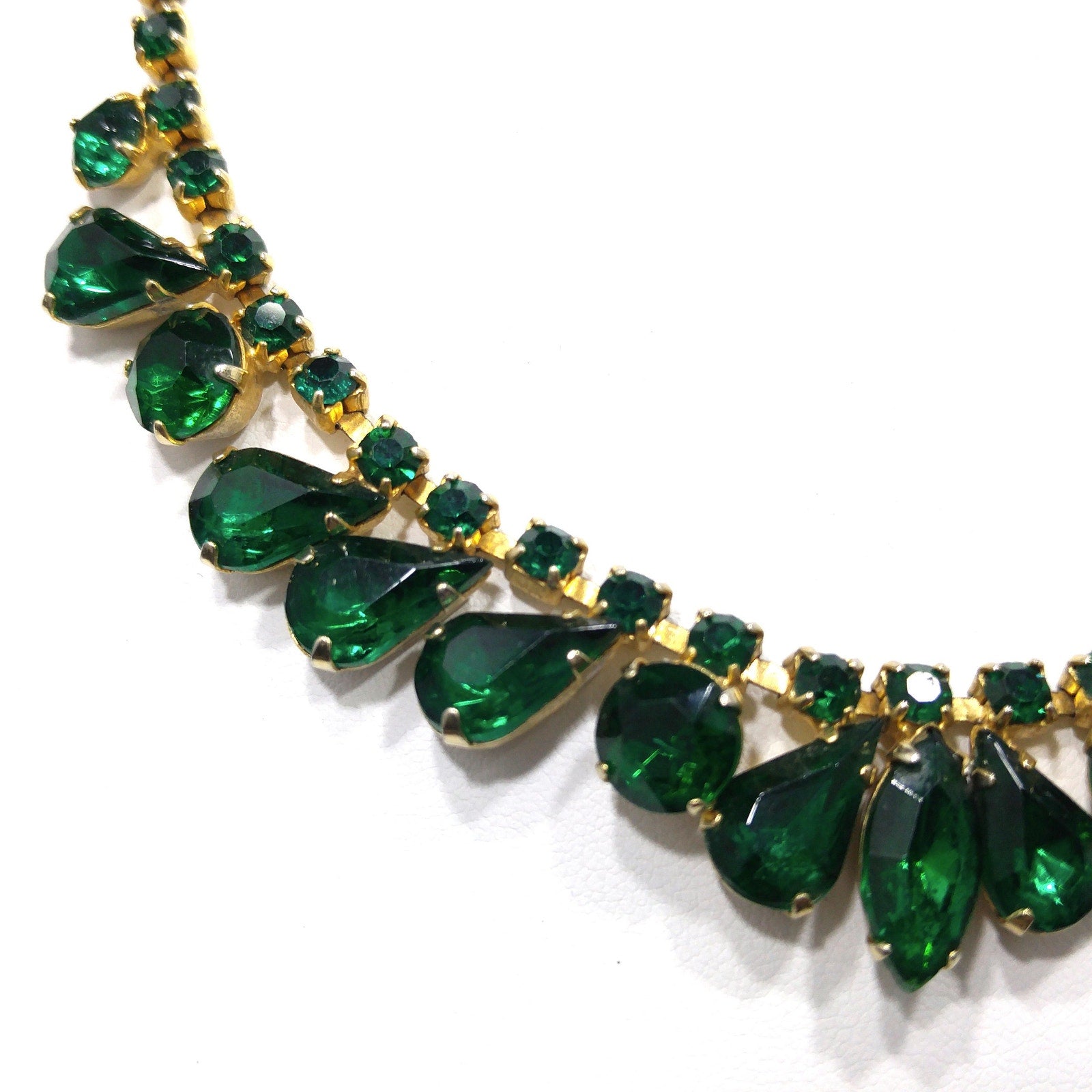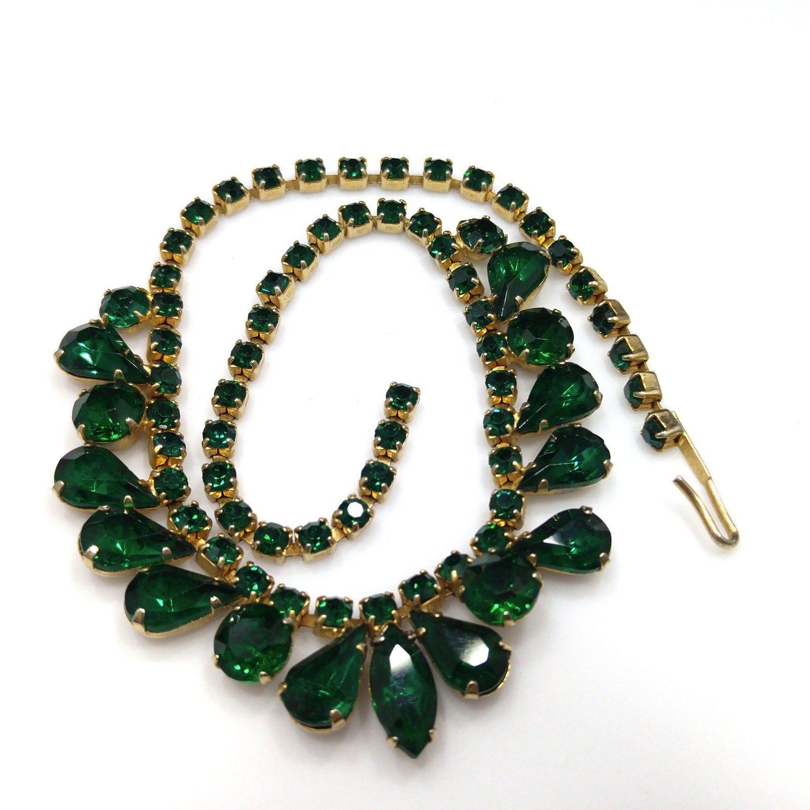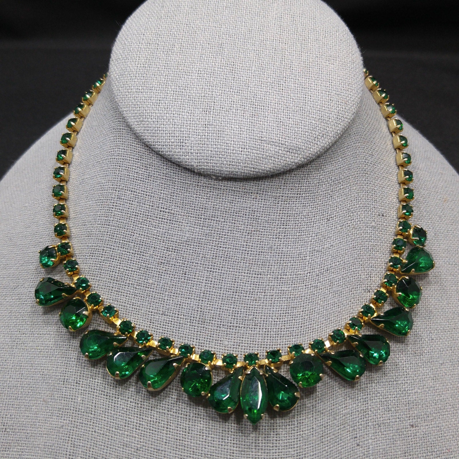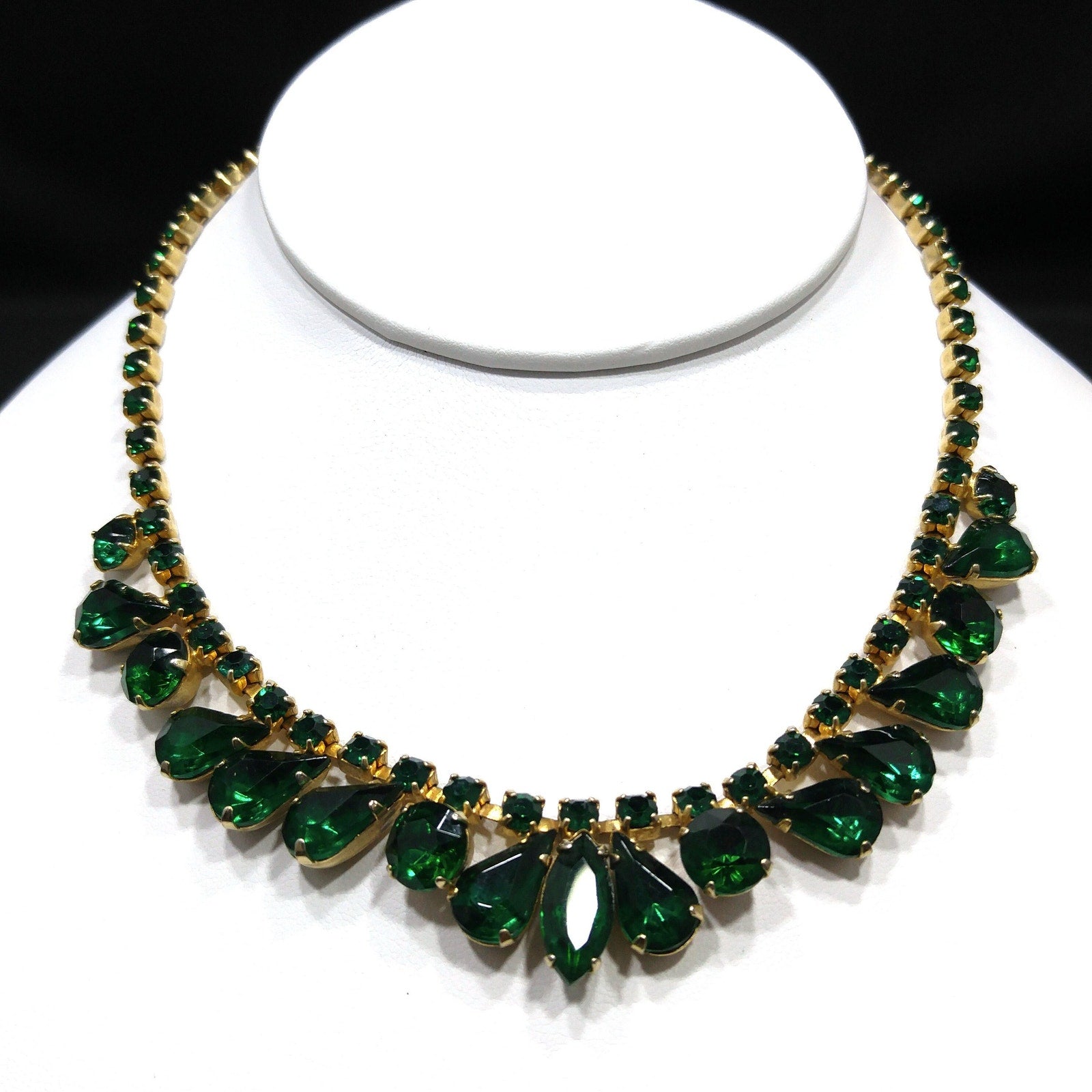 *Description: Vintage Emerald Green Rhinestone Choker Necklace, Gold Plated, 14 3/4 Inches, 1960s Vintage Jewelry - This is a beautiful emerald green choker necklace with rhinestones in marquise, teardrop, and chaton cuts. Each rhinestone is prong set. The choker is shorter than most at 14 3/4 Inches wearable length, total length 15 inches. Be sure to measure your neck prior to purchase. It is a beautiful piece of vintage jewelry. This would be a great addition to your vintage jewelry collection or make a great vintage gift!