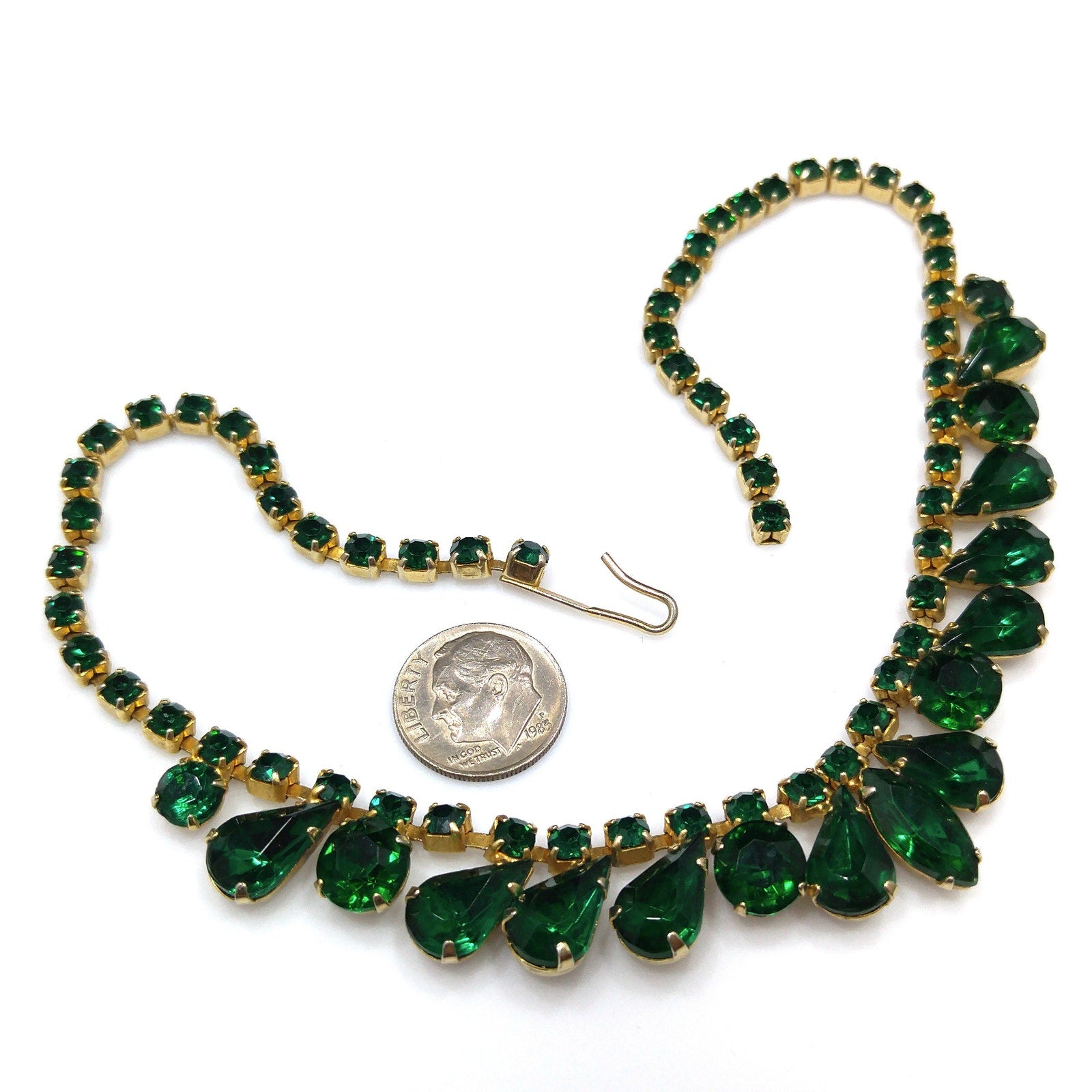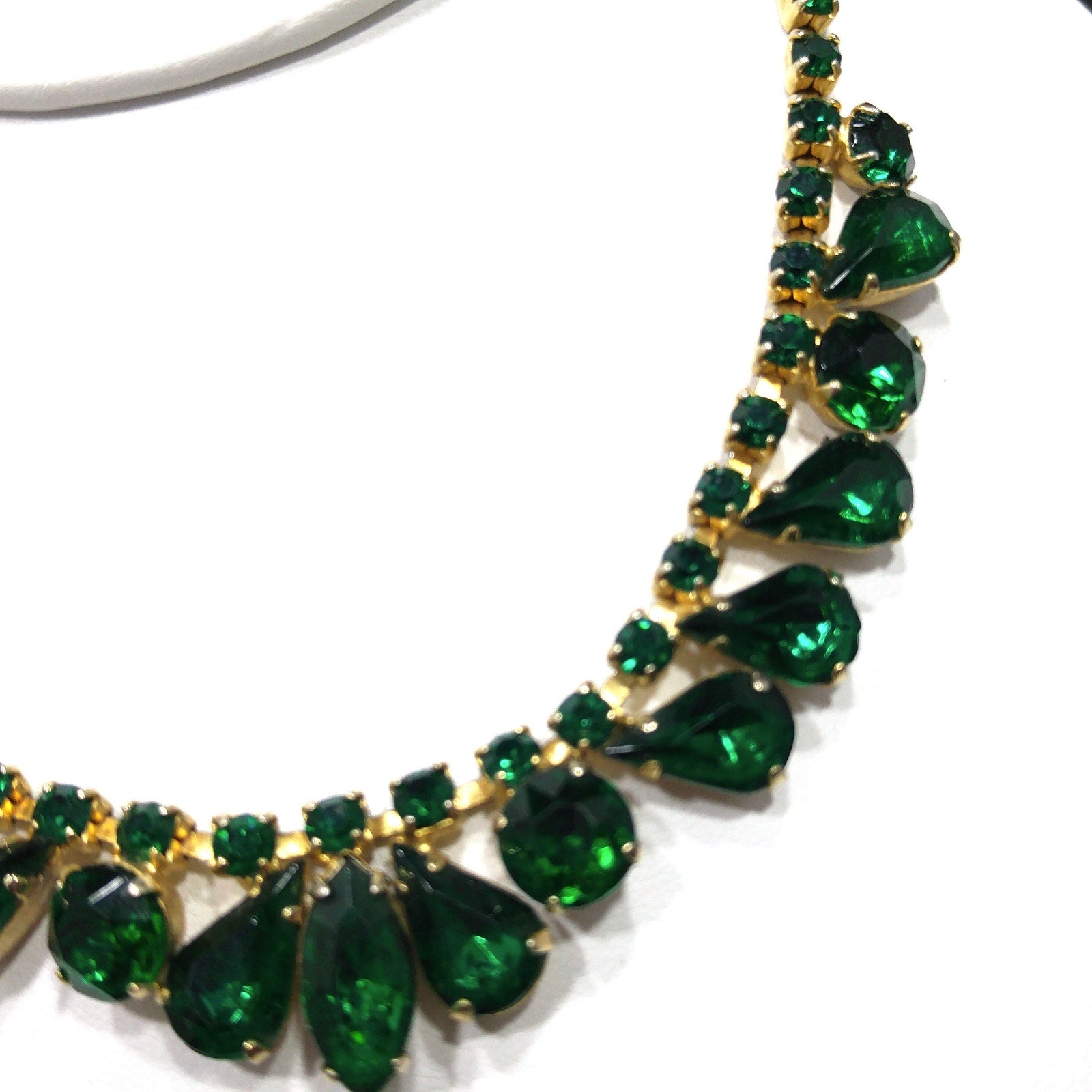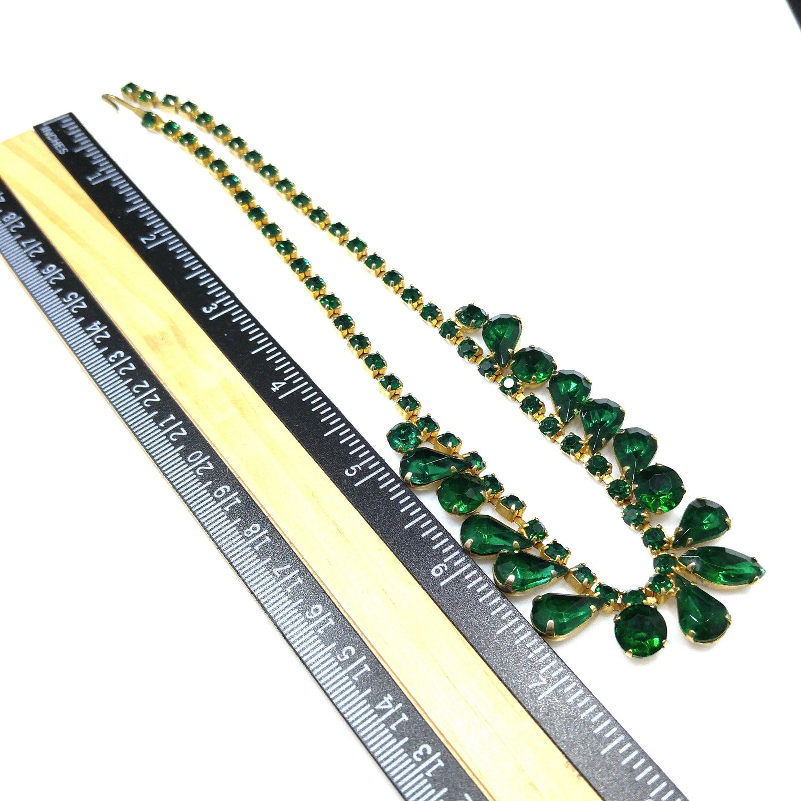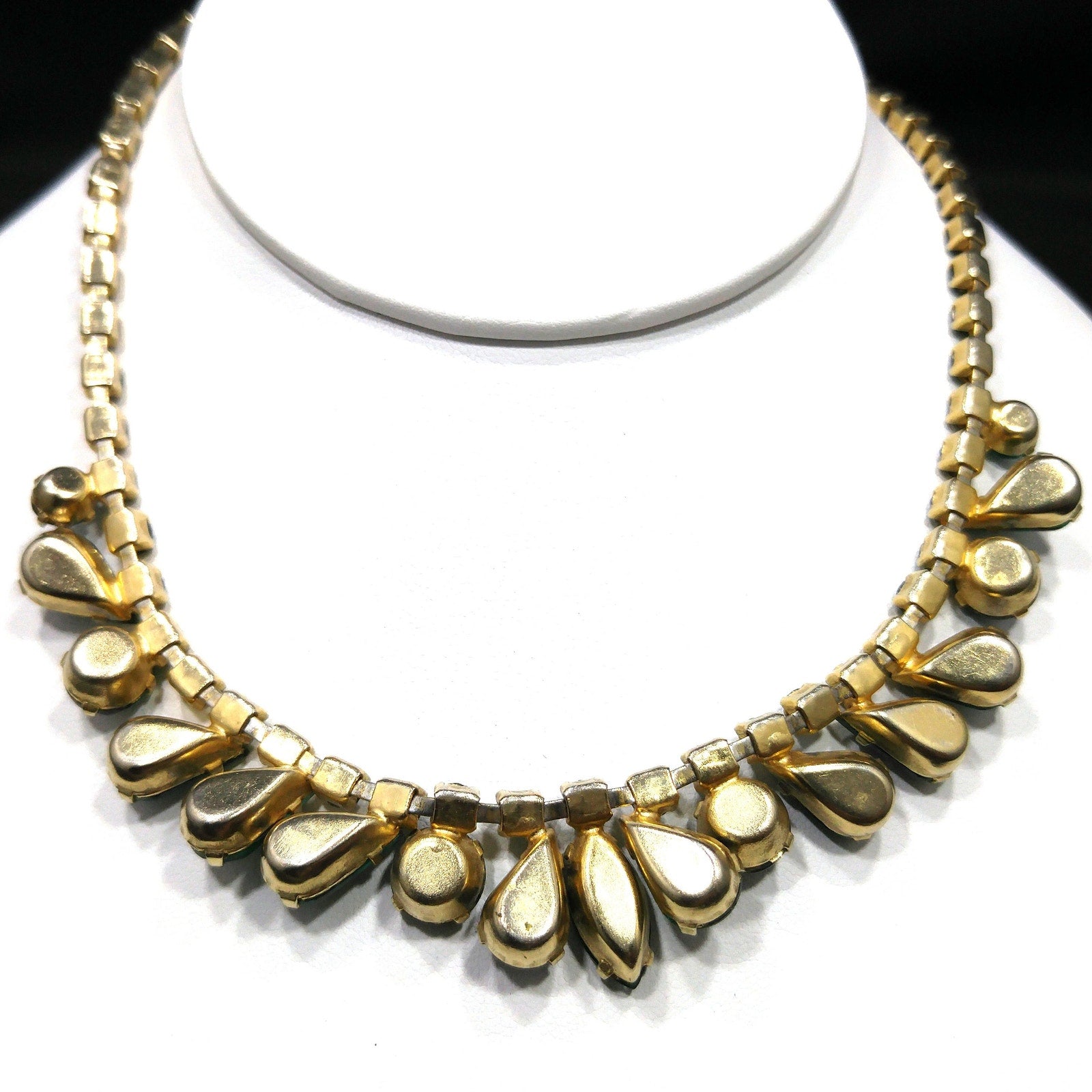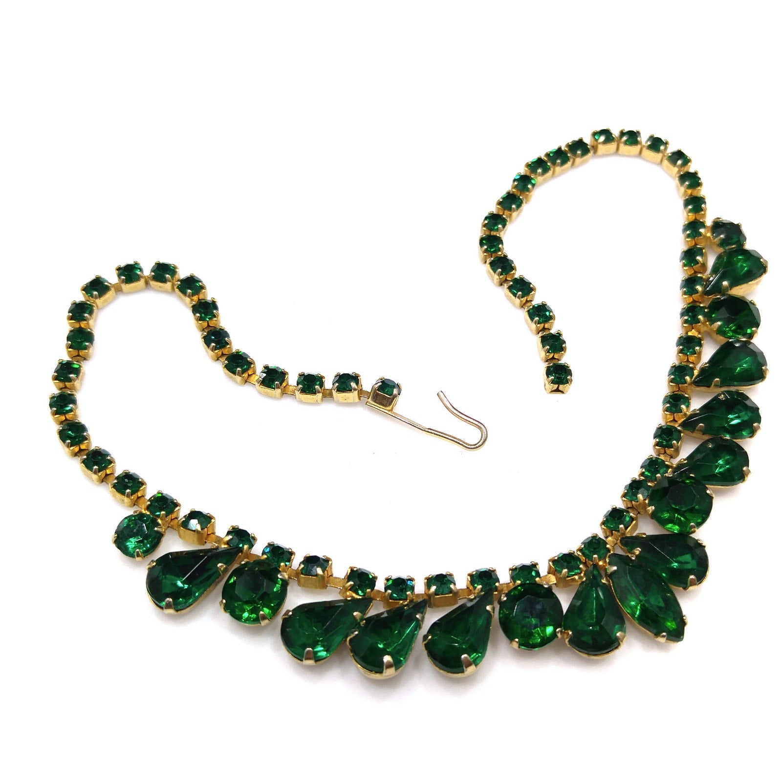 *Description: Vintage Emerald Green Rhinestone Choker Necklace, Gold Plated, 14 3/4 Inches, 1960s Vintage Jewelry - This is a beautiful emerald green choker necklace with rhinestones in marquise, teardrop, and chaton cuts. Each rhinestone is prong set. The choker is shorter than most at 14 3/4 Inches wearable length, total length 15 inches. Be sure to measure your neck prior to purchase. It is a beautiful piece of vintage jewelry. This would be a great addition to your vintage jewelry collection or make a great vintage gift!