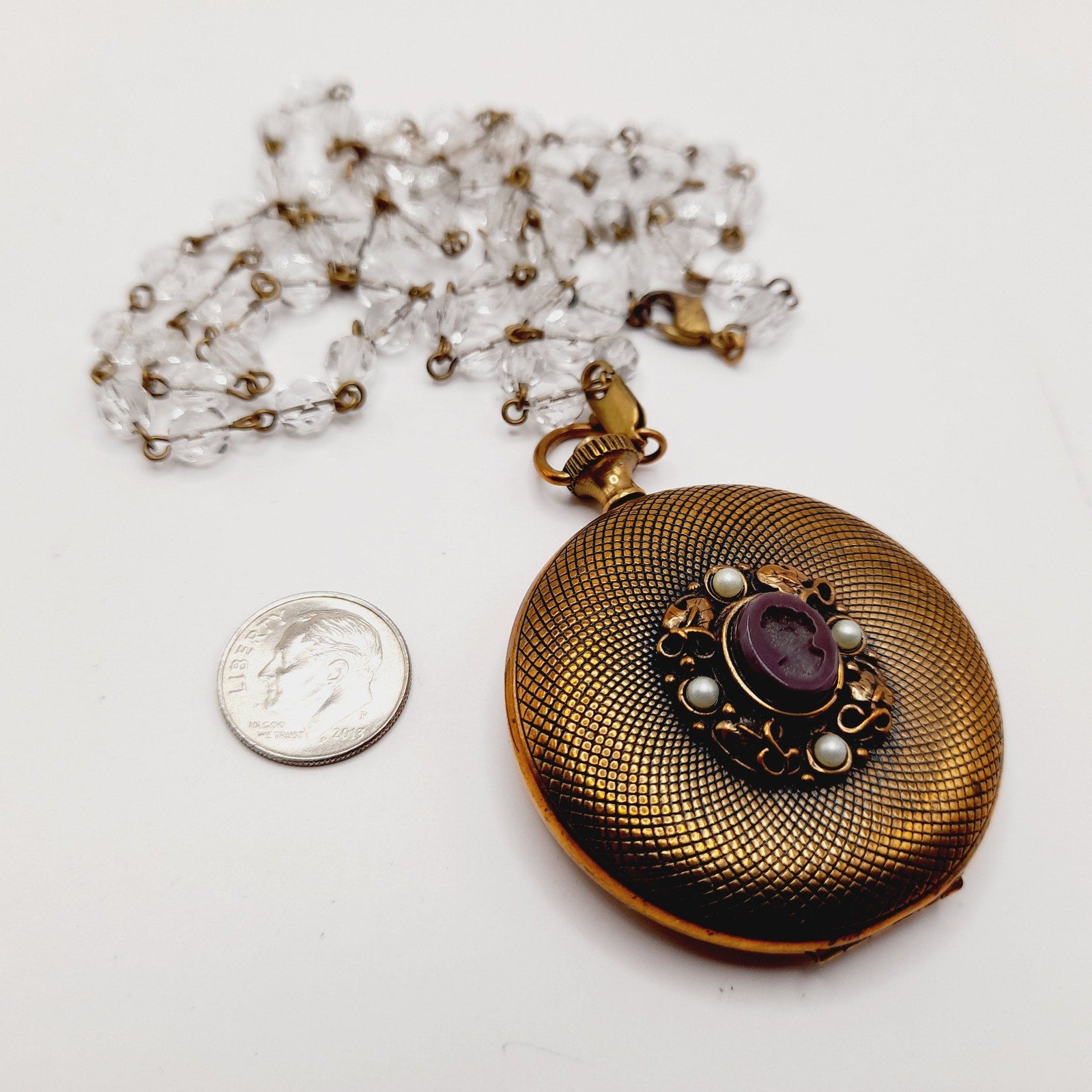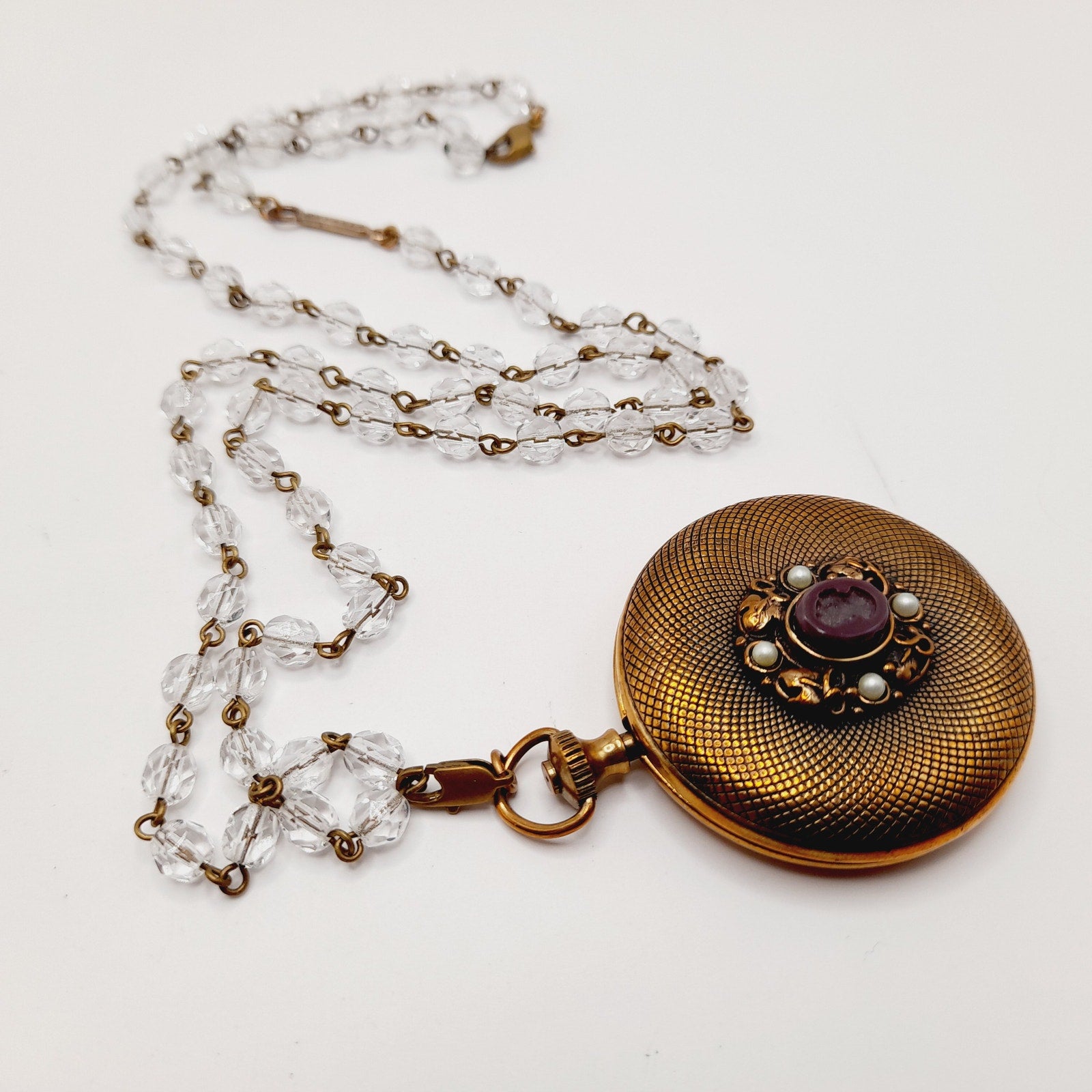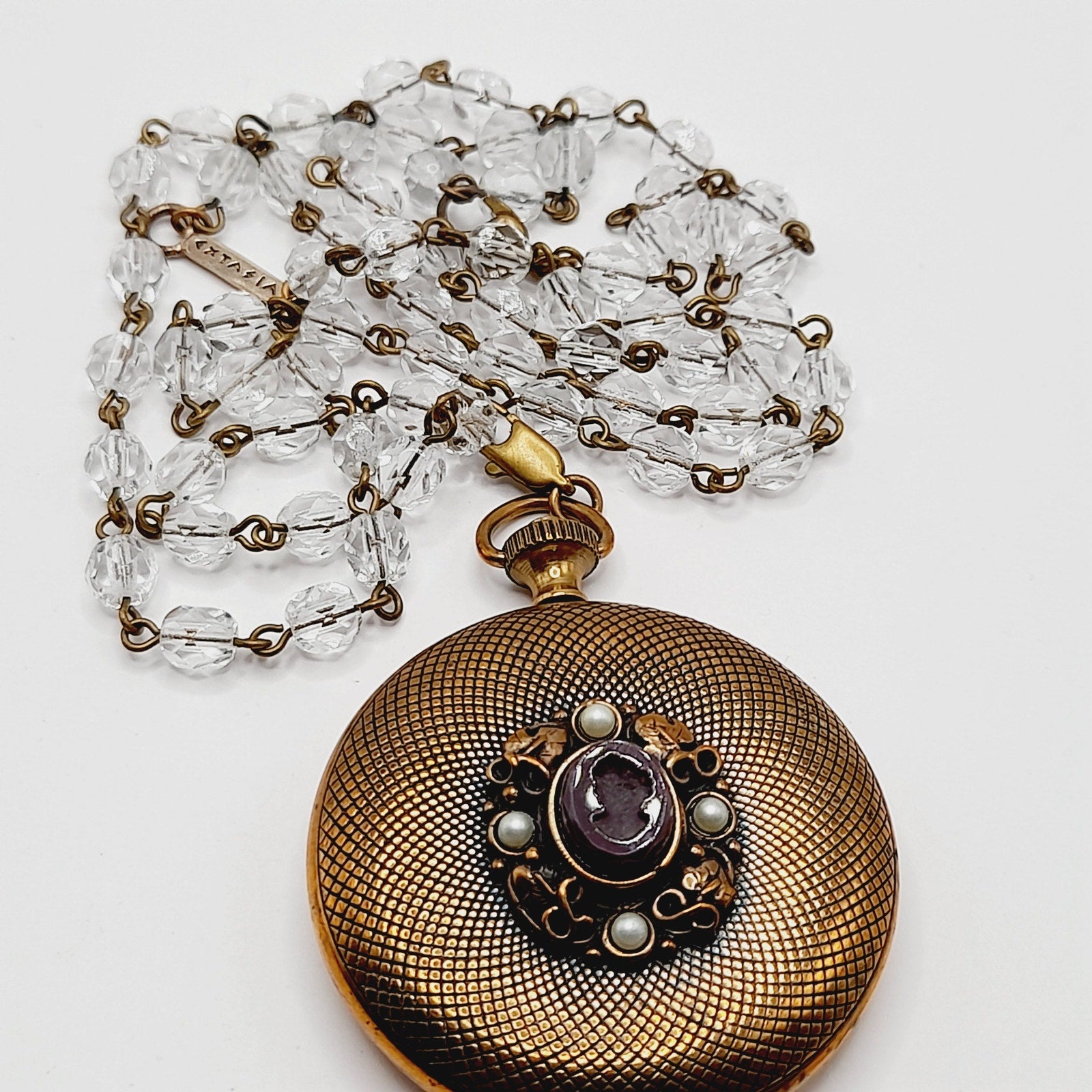 Vintage Extasia Intaglio Pocket Watch Style Locket Clear Bead Necklace, 28 Inches